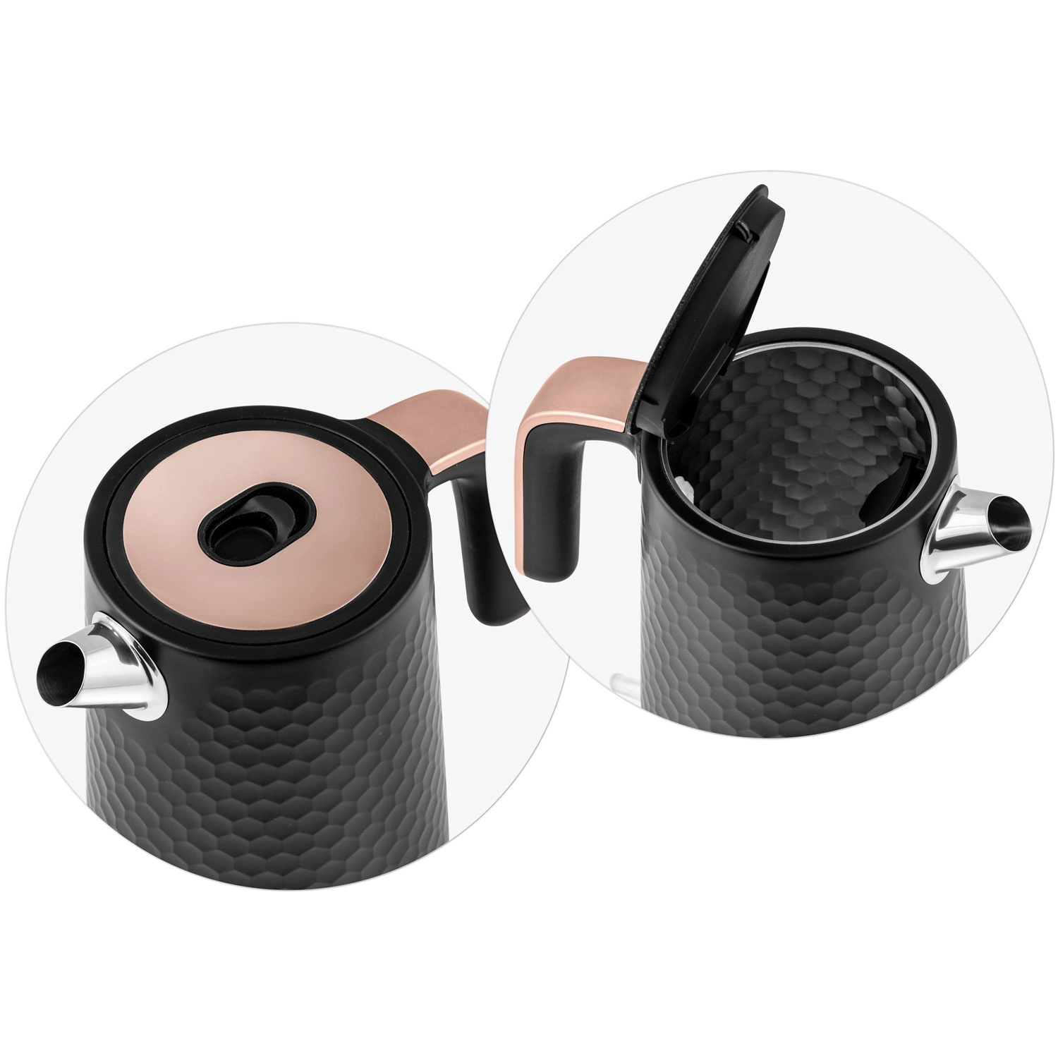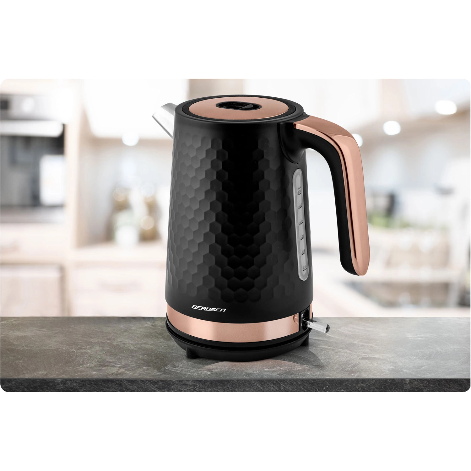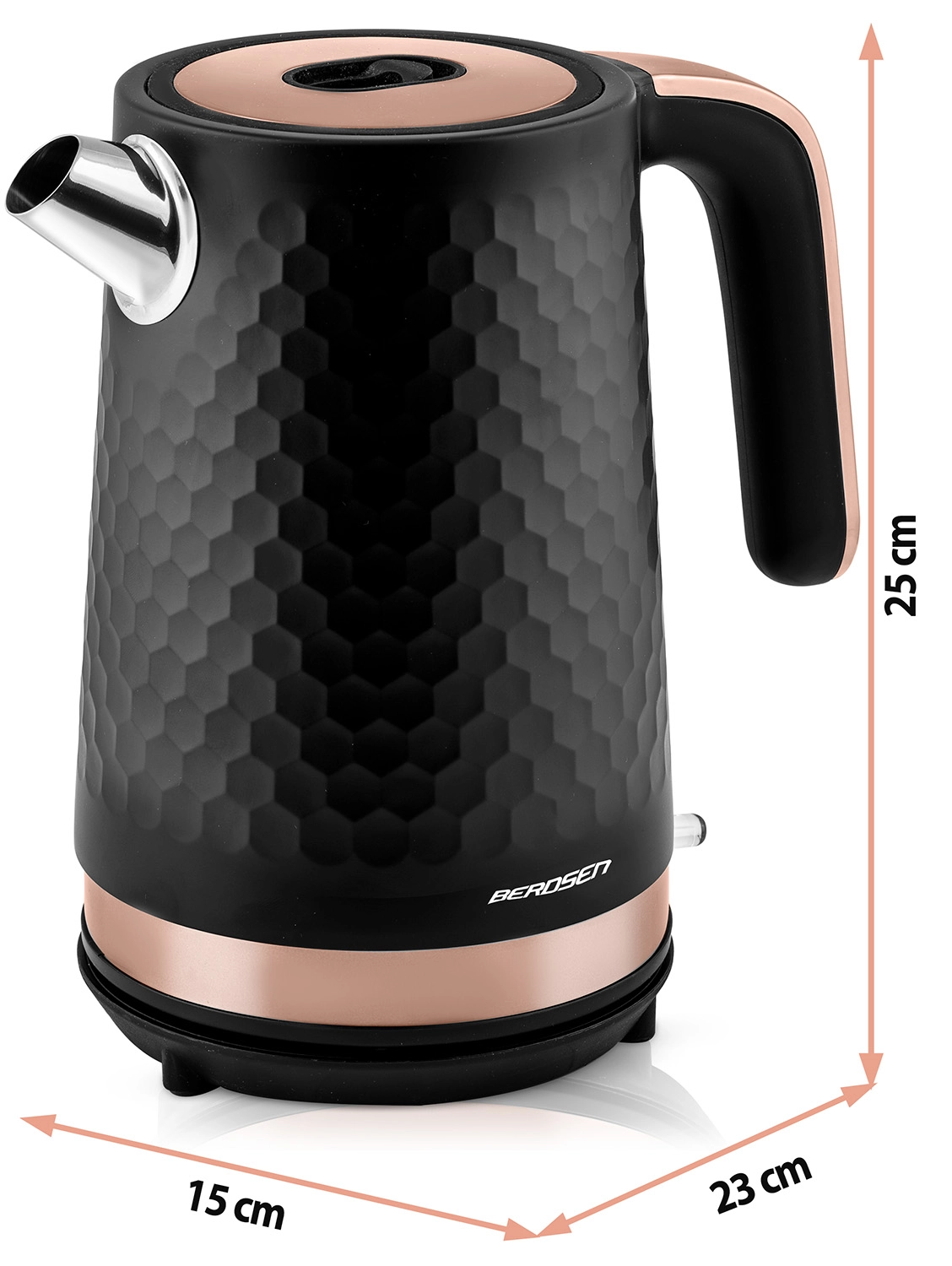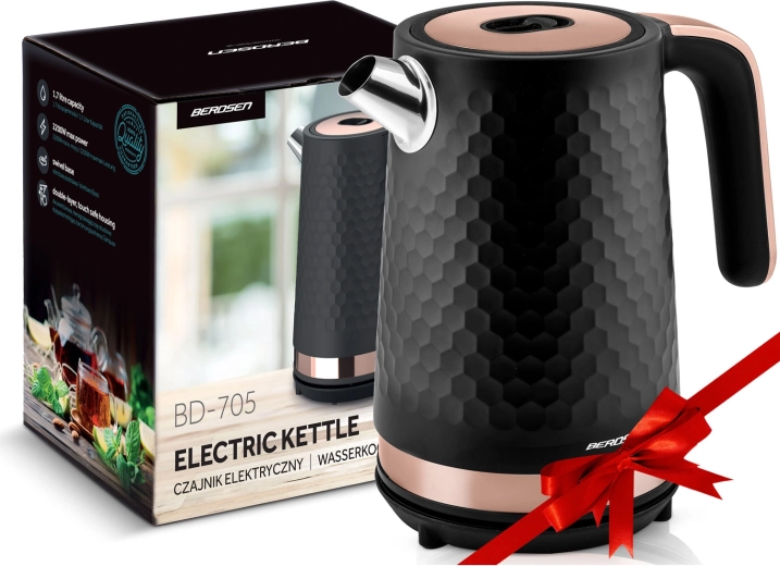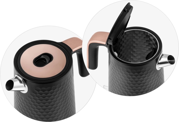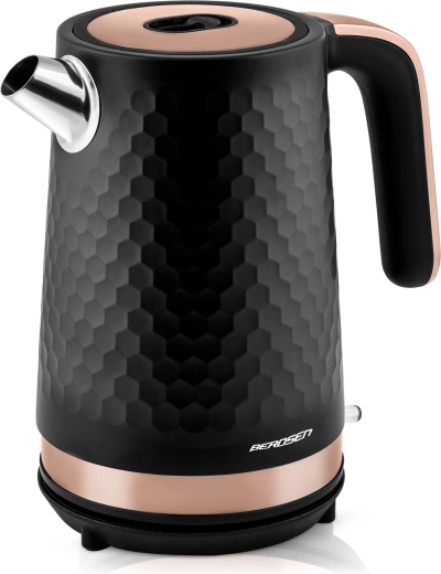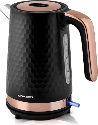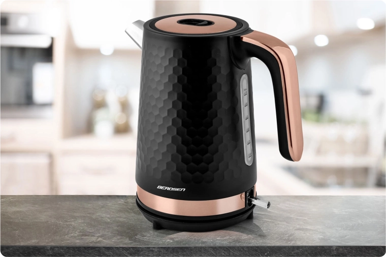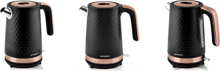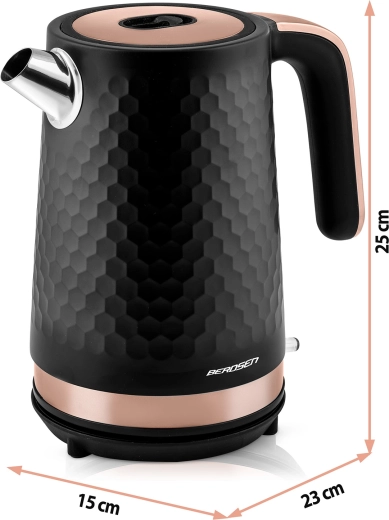 Den elegante Berdsen-kedel i sort–kobber er designet til nem daglig brug. Metalkonstruktionen med mat finish er holdbar og let at vedligeholde, mens det ergonomiske håndtag forbliver køligt at røre ved. Med en effekt på 1850–2200 W koger den vand hurtigt og energieffektivt.
