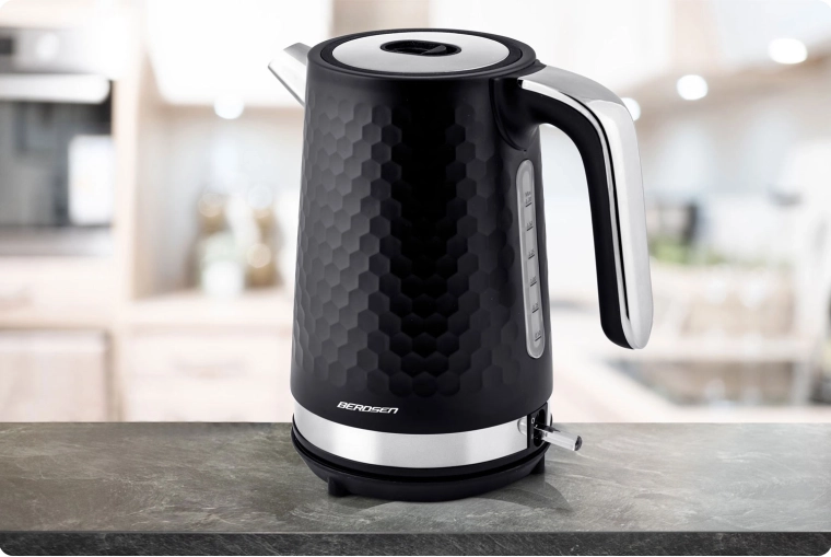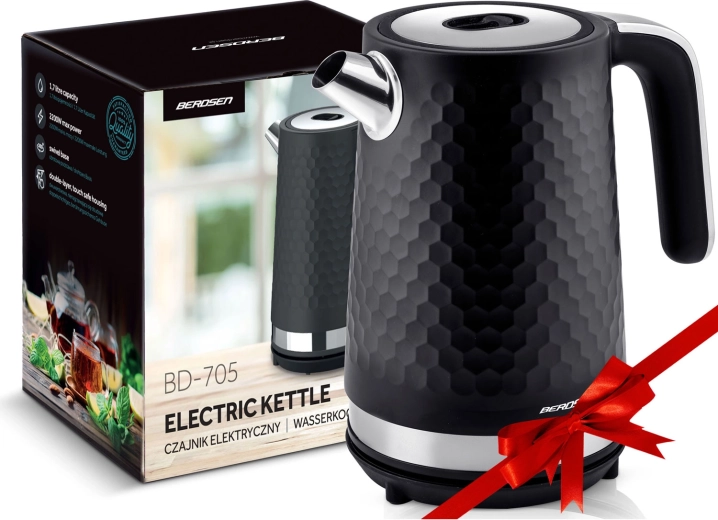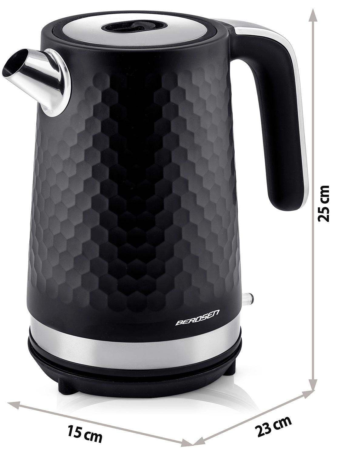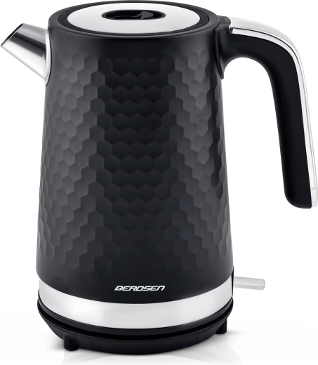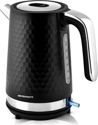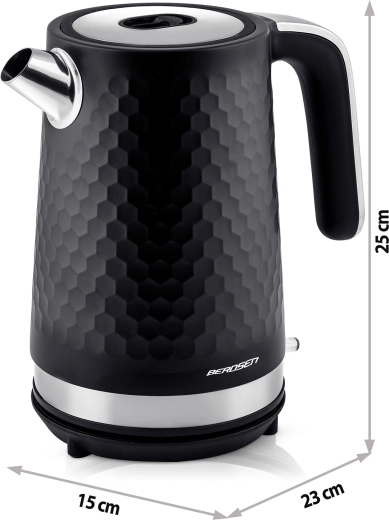 Opdag et elegant køkkentilbehør, der forener design og ydeevne. Den elektriske kedel BERDSEN med metalhus i mat sort og sølvfarvede detaljer passer til moderne interiører i hvide, grå, antracit- og sorte nuancer. Takket være den kraftige effekt på 1850–2200 W opvarmer den vand hurtigt og effektivt, mens vandstandsmåler og belyst kontakt gør hverdagsbrug mere behageligt.