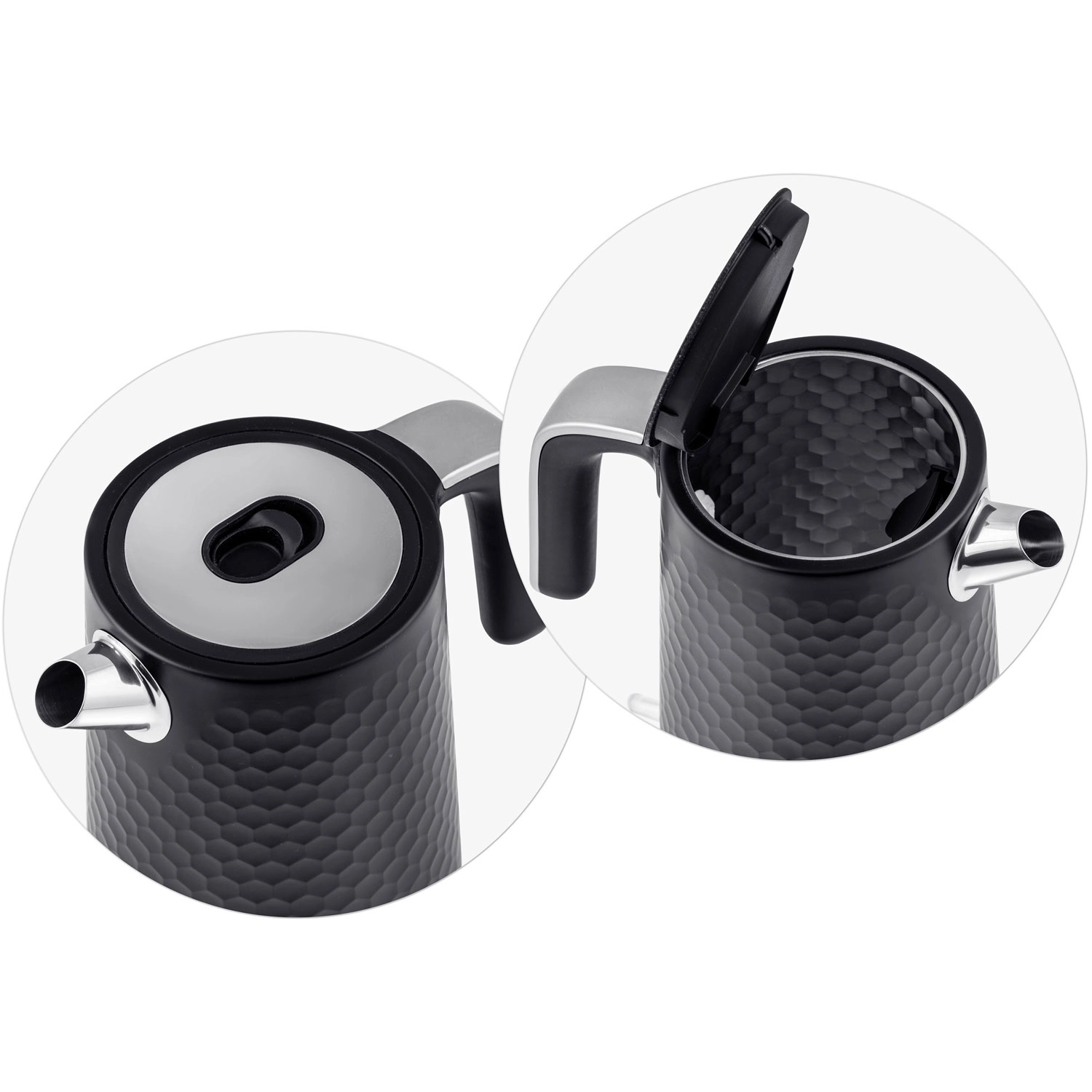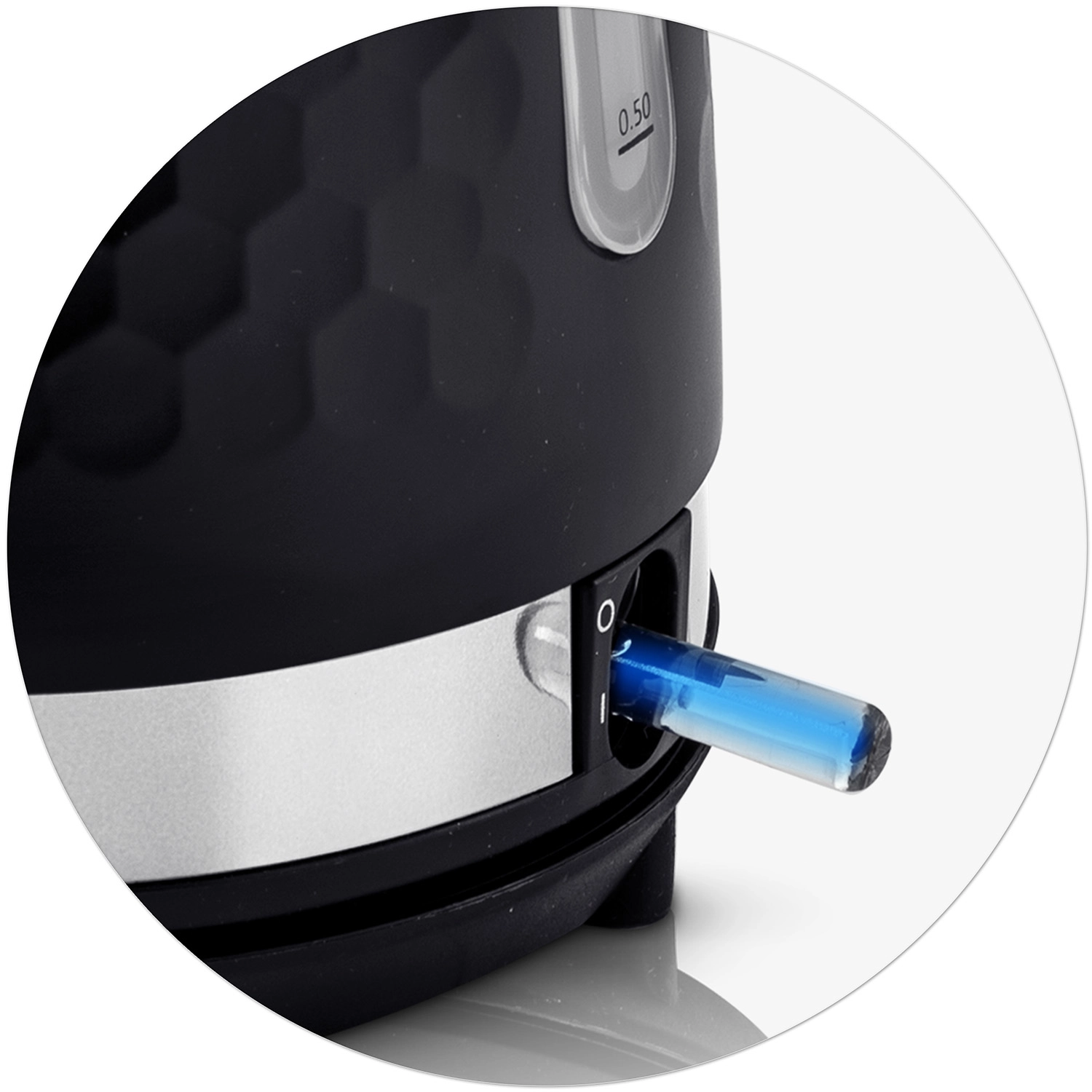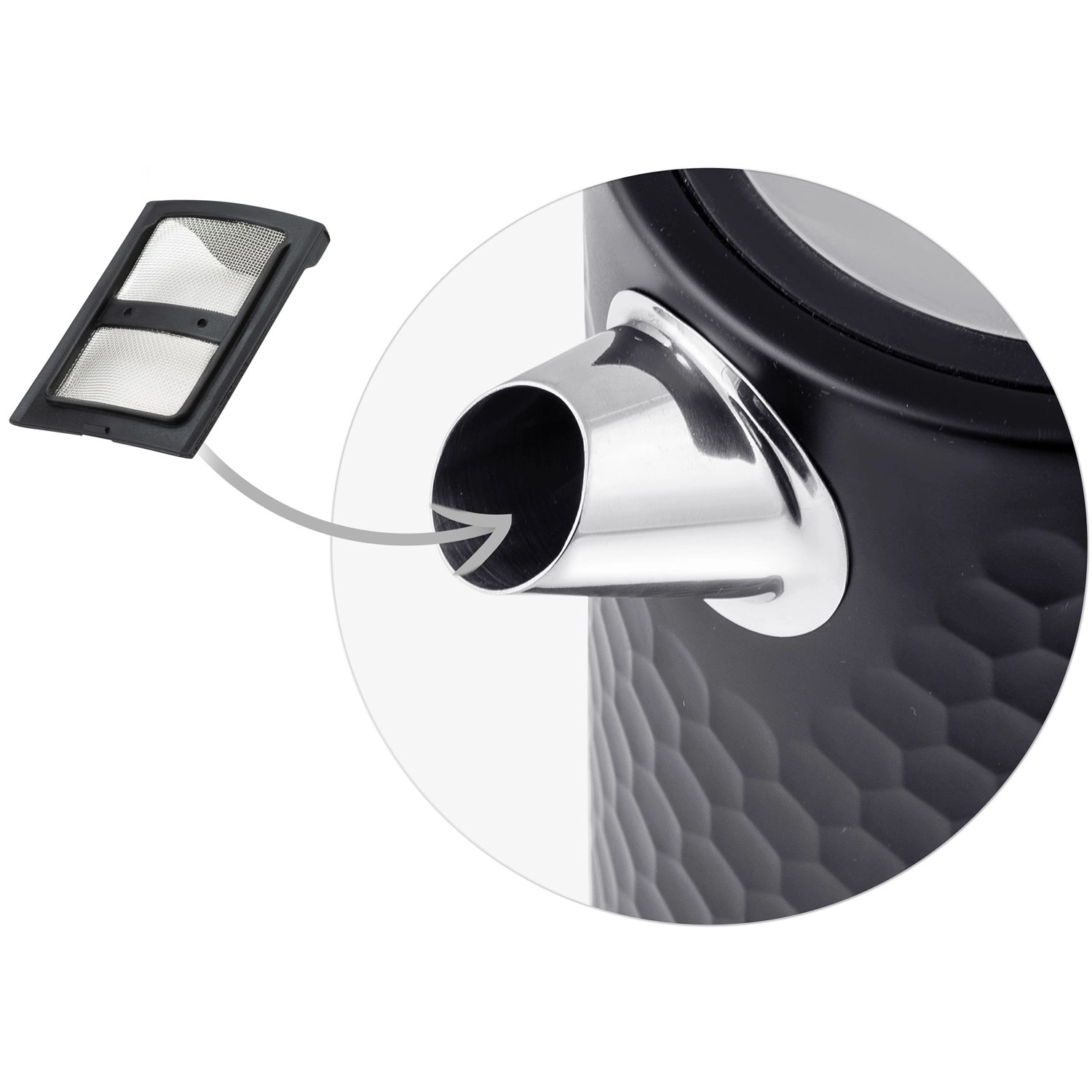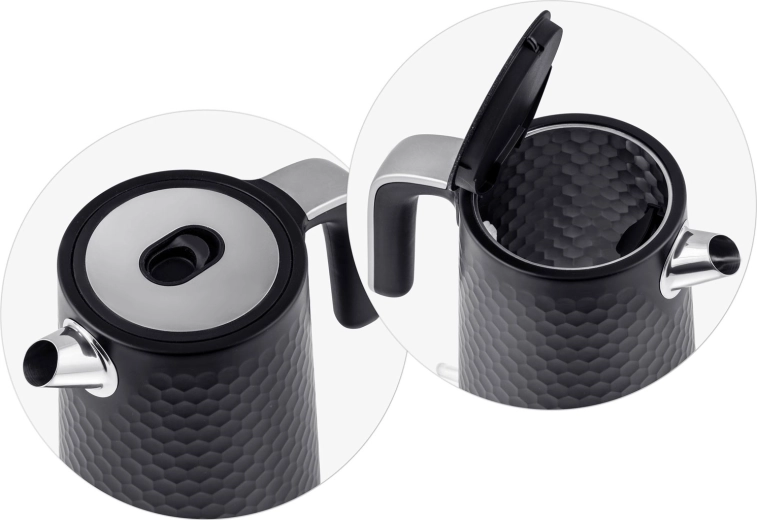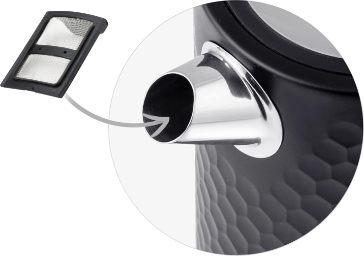Kedlen er designet til maksimal komfort: 360° drejesokkel giver nem placering for både højre- og venstrehåndede, aftageligt låg gør påfyldning og rengøring lettere, og skridsikre fødder sikrer stabilitet. Metalfilter mod kalk opfanger urenheder og kan nemt tages ud og rengøres. For sikker drift sørger beskyttelse mod tørkogning.