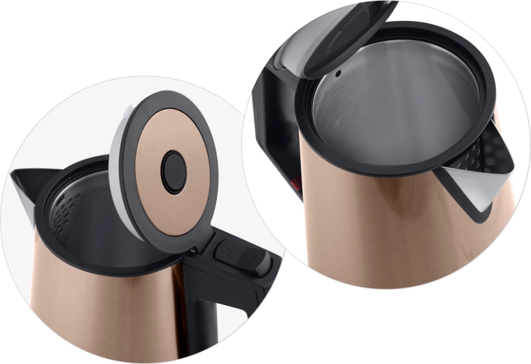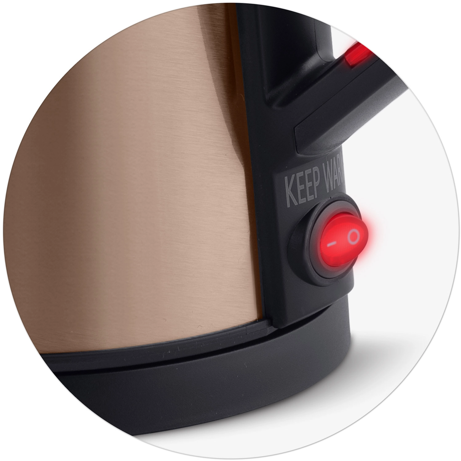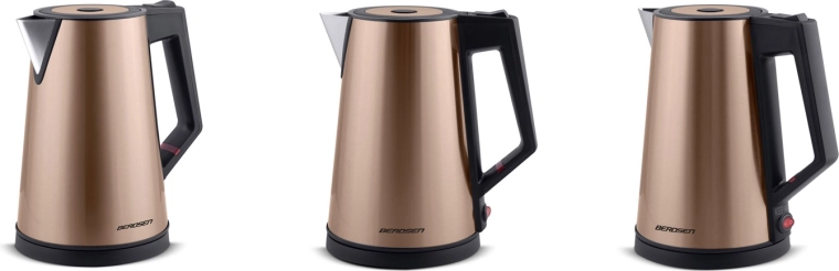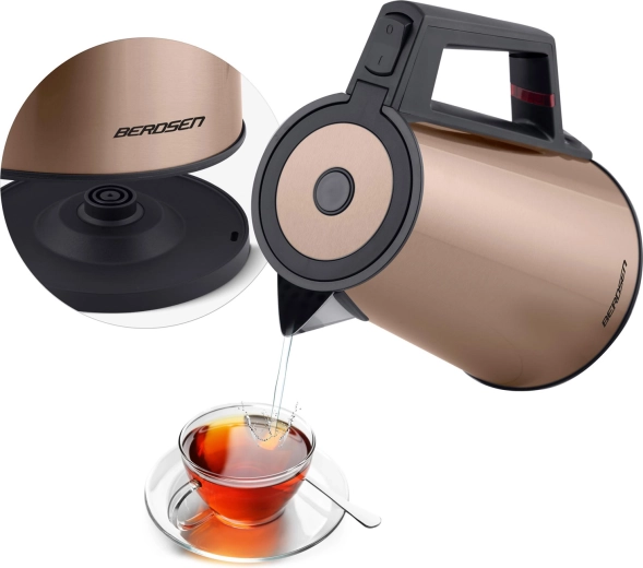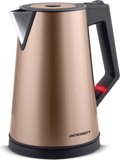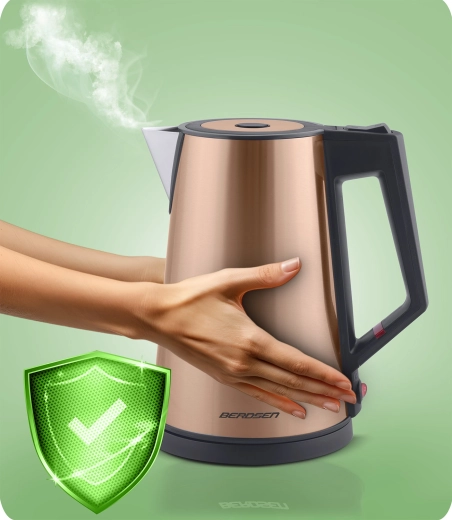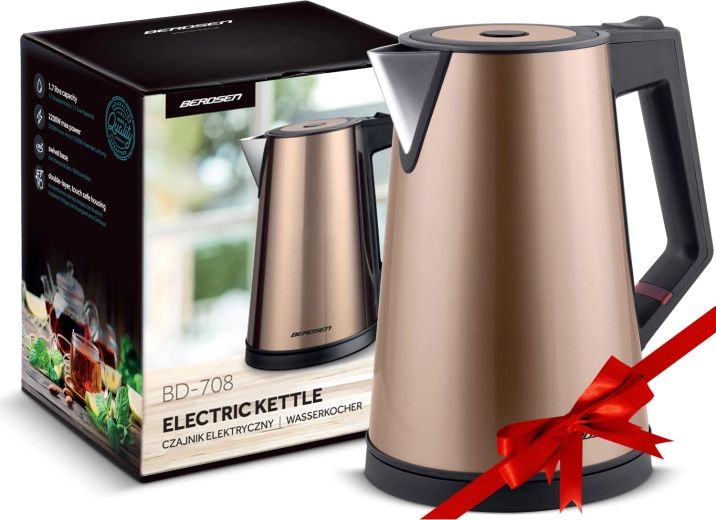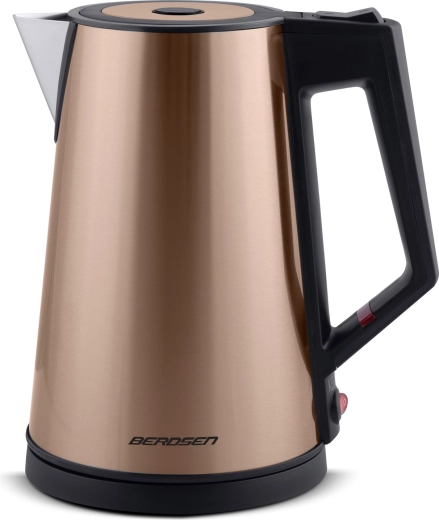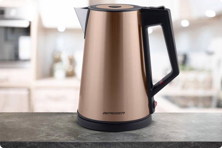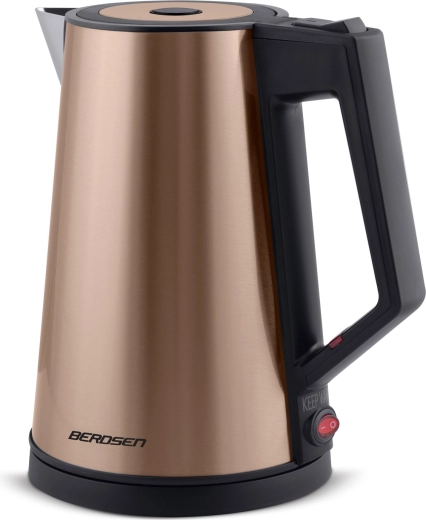 Stilfuld elektrisk kedel BERDSEN med kapacitet 1,7 l i elegant kobberfinish, med isoleret CoolTouch22-konstruktion, inderside i rustfrit ste5l SUS 304 og en praktisk varmeholdningsfunktion i op til 2 timer. Takket ve6re tre5dlf8s 360b0-base, bagbelyst kontakt og sikkerhedsbeskyttelse mod overophedning er den et ideelt valg til daglig kogning af vand.