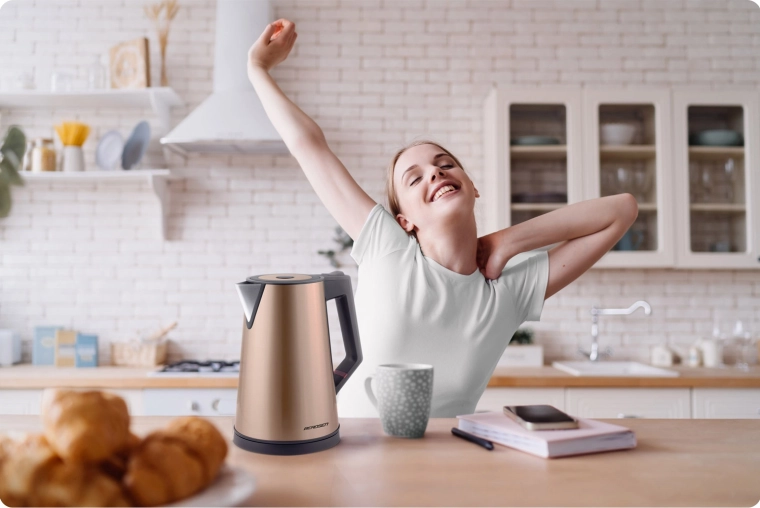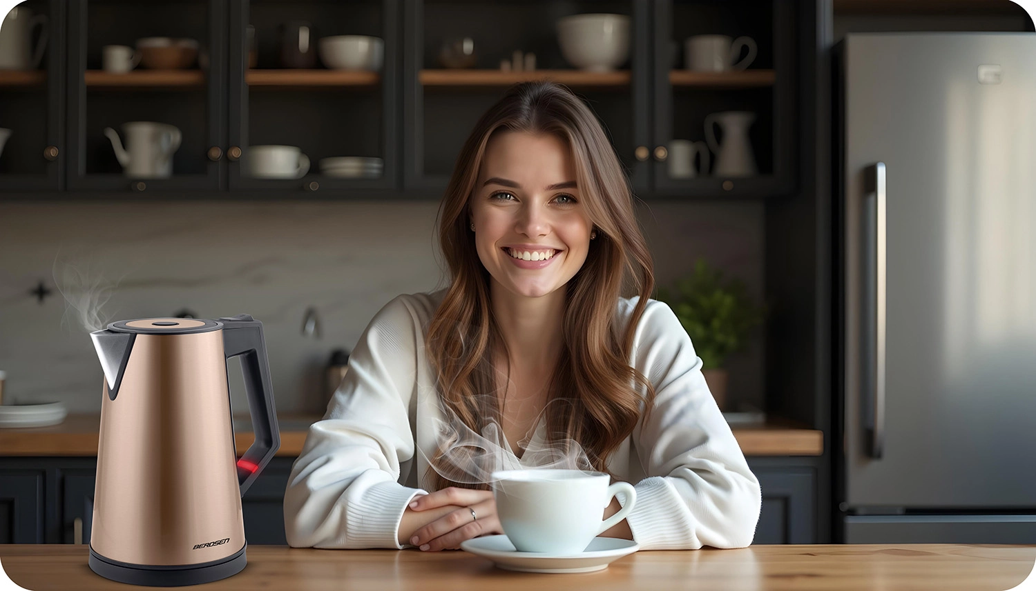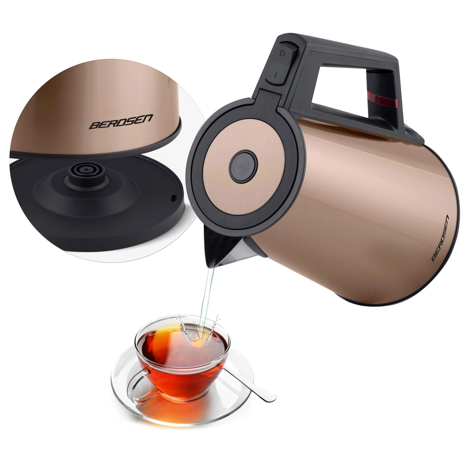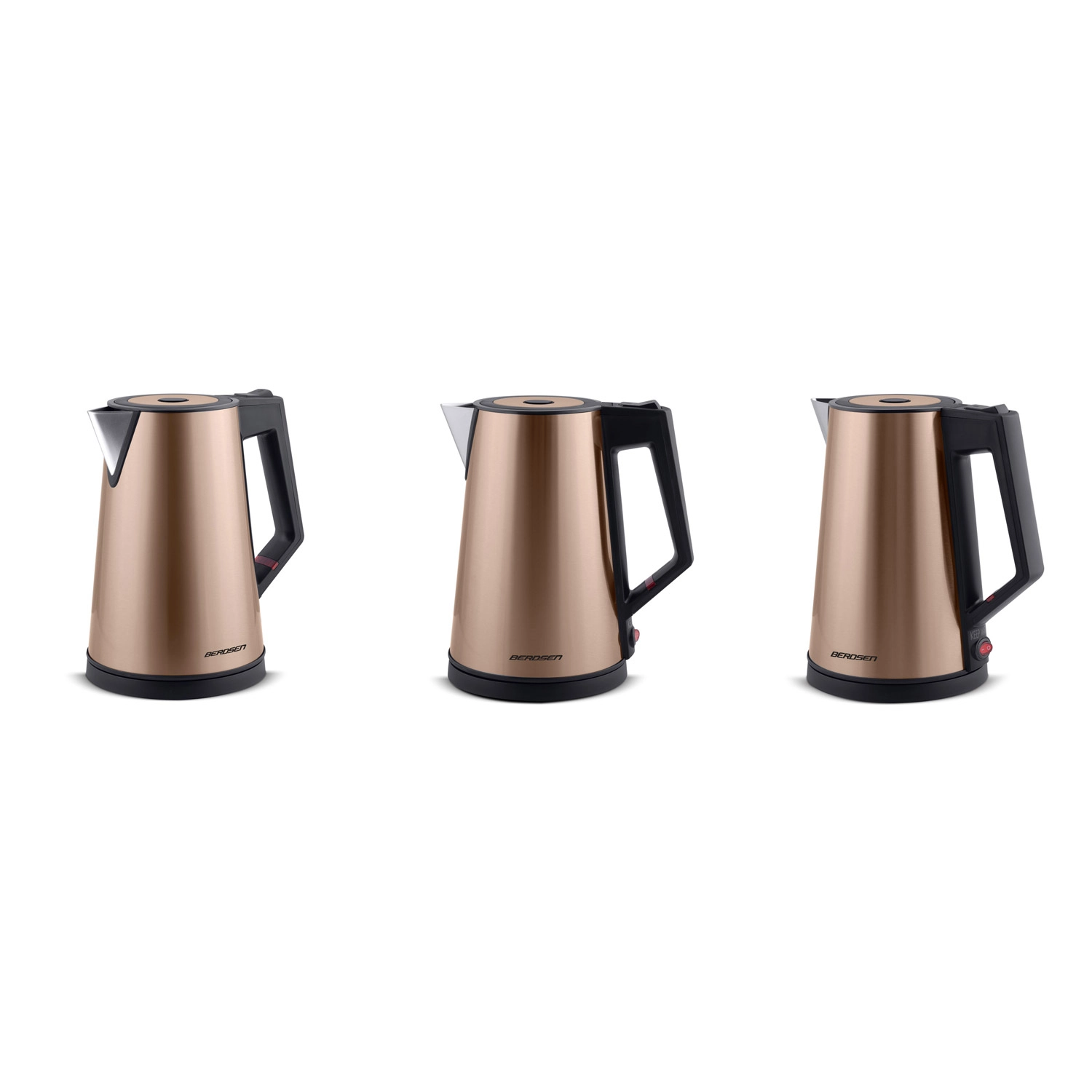 Stilfuld elektrisk kedel BERDSEN med kapacitet 1,7 l i elegant kobberfinish, med isoleret CoolTouch22-konstruktion, inderside i rustfrit ste5l SUS 304 og en praktisk varmeholdningsfunktion i op til 2 timer. Takket ve6re tre5dlf8s 360b0-base, bagbelyst kontakt og sikkerhedsbeskyttelse mod overophedning er den et ideelt valg til daglig kogning af vand.