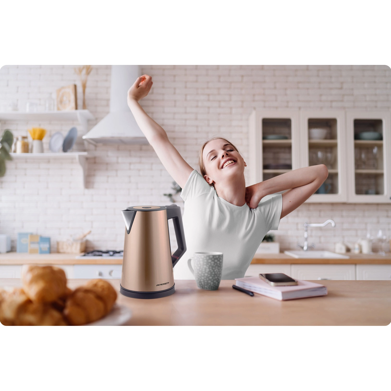Oplev den perfekte balance mellem design og funktion. Den dobbeltve6ggede CoolTouch22-konstruktion sikrer, at kedlen ikke bliver overophedet pe5 ydersiden, mens det hf8jkvalitets rustfri ste5l SUS 304 i inderske5len garanterer en ren vandsmag uden uf8nskede bismage. Den kobbergyldne finish virker premium og passer perfekt til det moderne kf8kken.