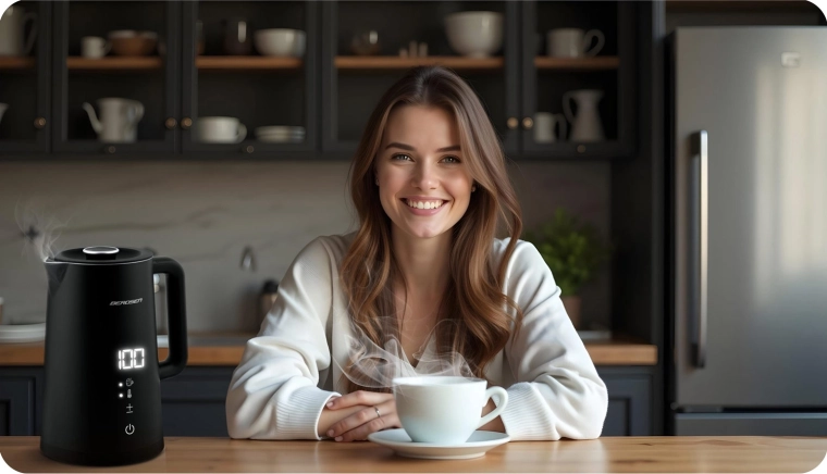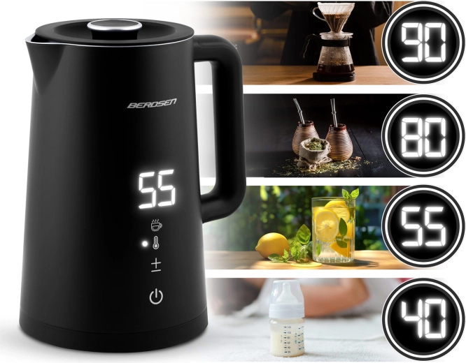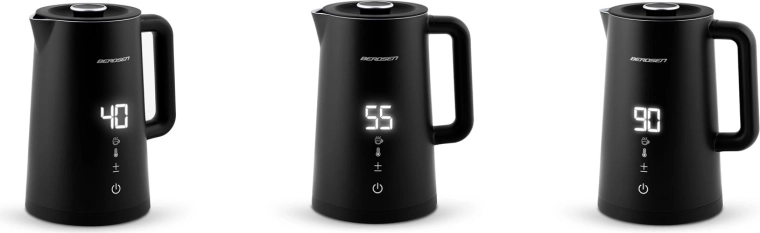 - Temperatur i 5 trin: 40 °C (mælk, børnedrikke), 55 °C (vand med citron og honning), 80 °C (yerba mate, grøn te), 90 °C (darjeeling, oolong, alternativ kaffe), 100 °C (kogning, skoldning af service).