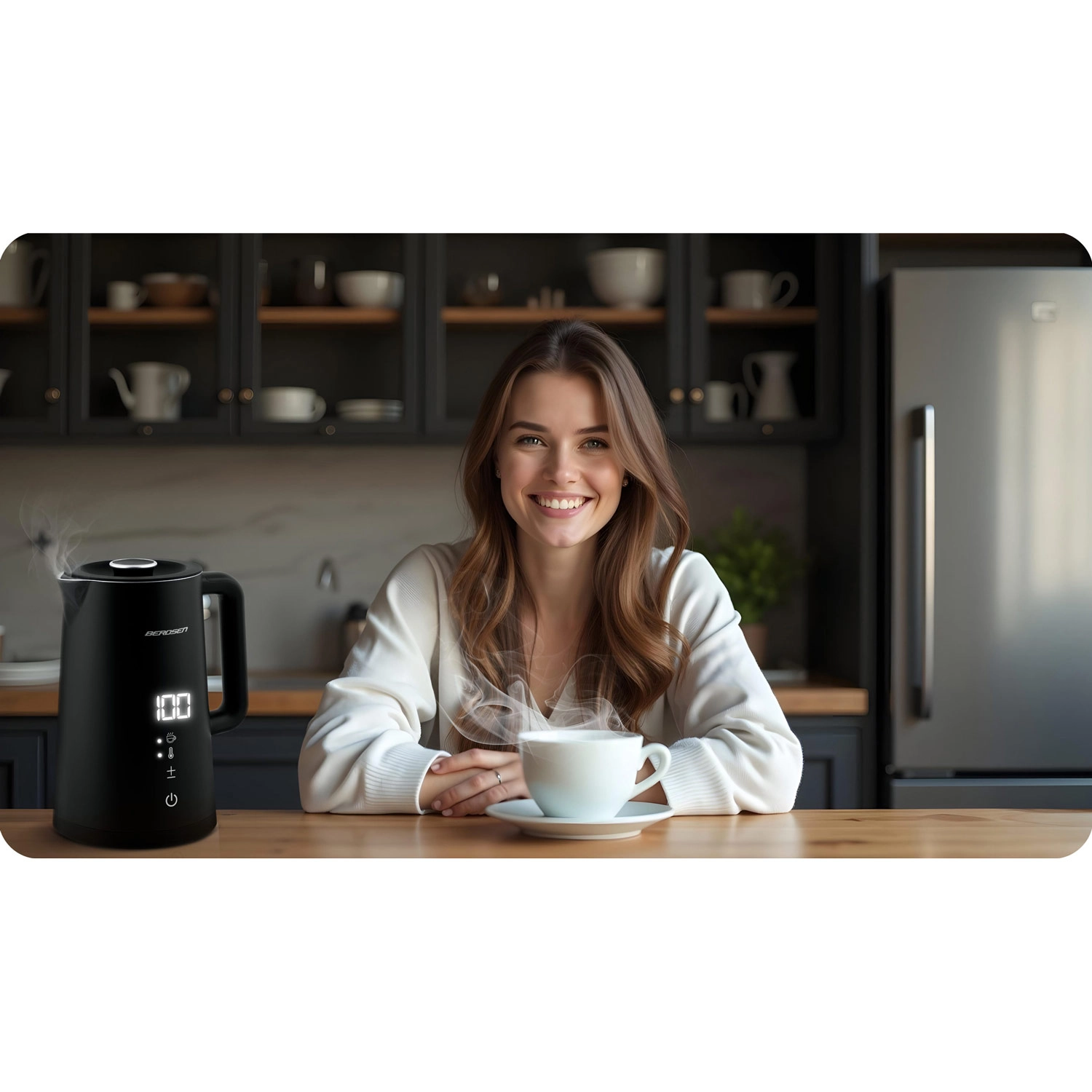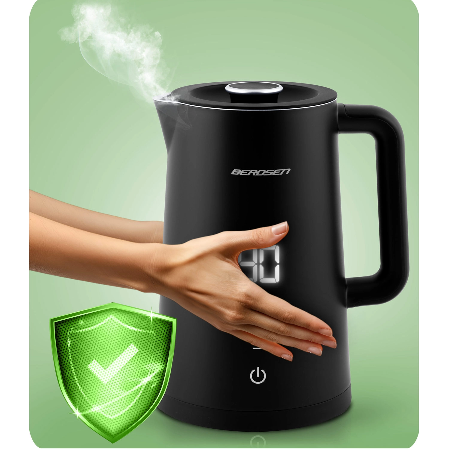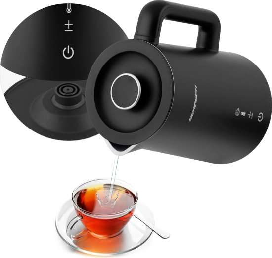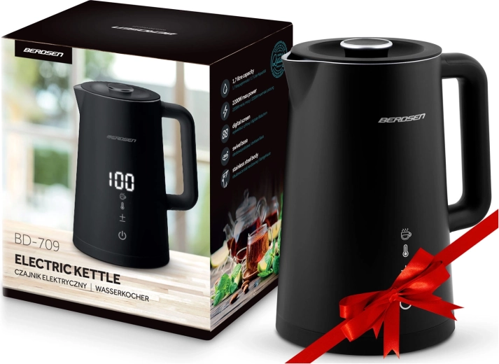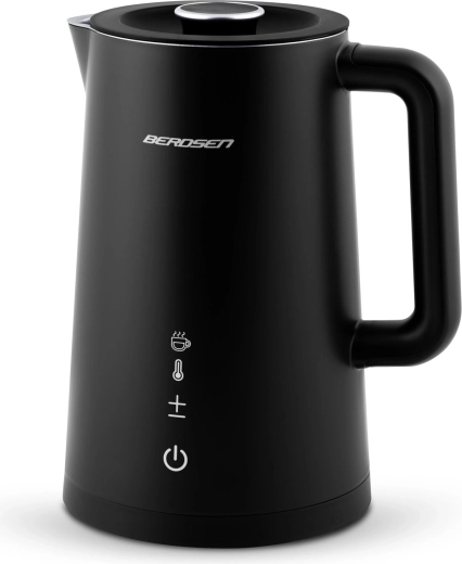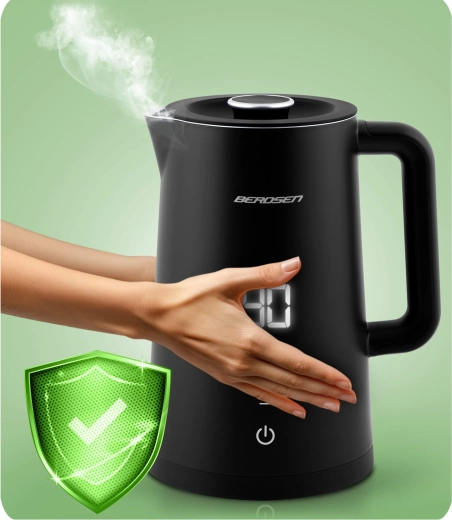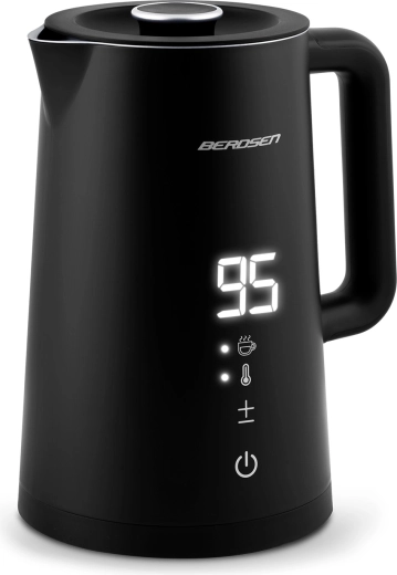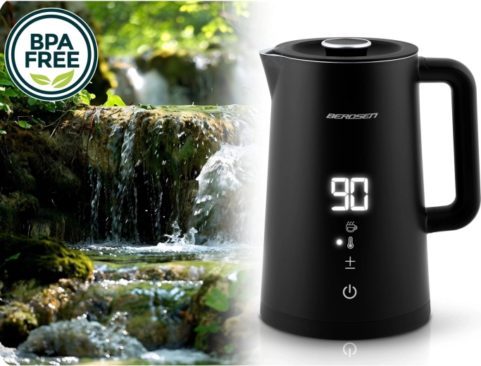 Stilfuld elektrisk elkedel fra BERDSEN med kapacitet på 1,7 l tilbyder touchpanel med LED-display, temperaturindstilling i 5 trin (40–100 °C) og hold-varm-funktion i op til 2 timer. Takket være dobbeltlags, isoleret CoolTouch-konstruktion bliver ydersiden ikke varm, og den indvendige beholder i rustfrit stål SUS 304 sikrer ren vandsmag uden BPA. Den praktiske 360° roterende base, skridsikre fødder og aftageligt låg giver nem brug i hverdagen.