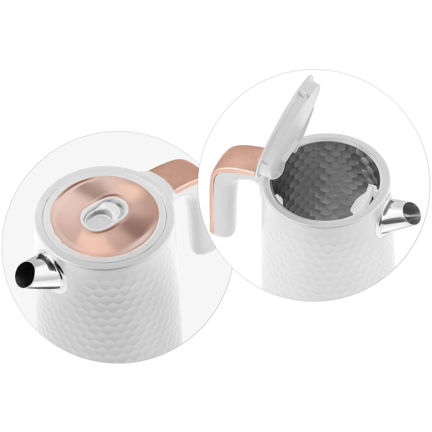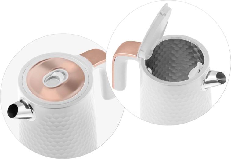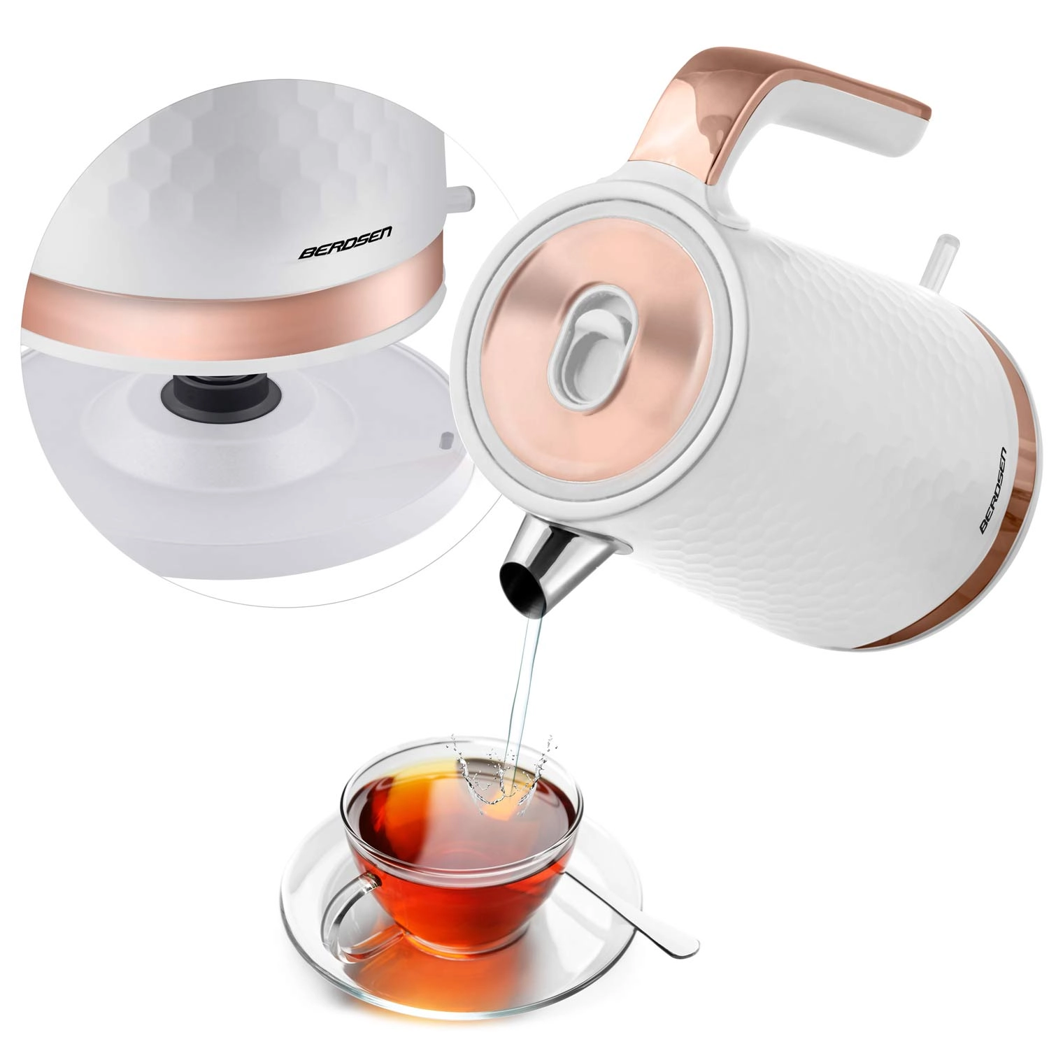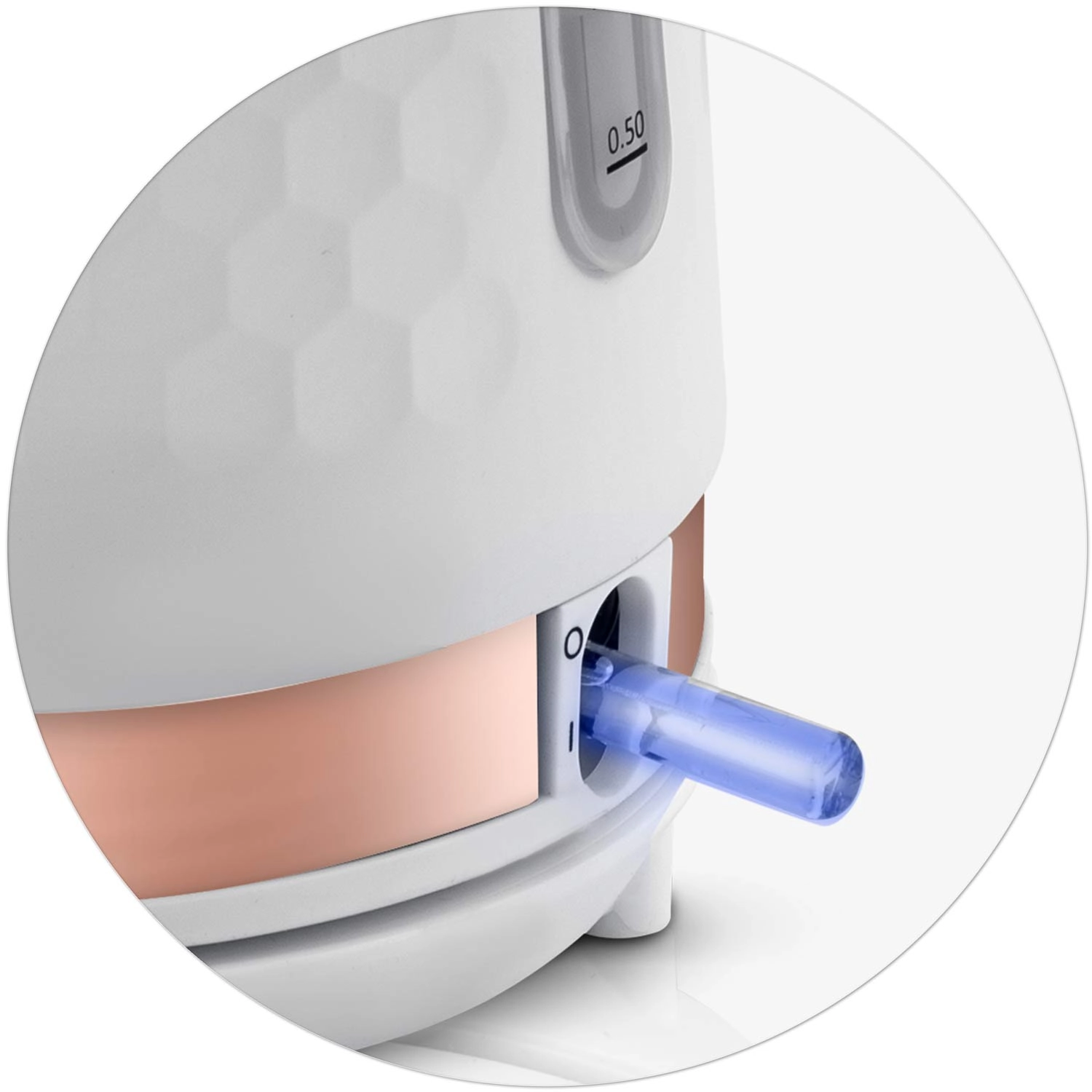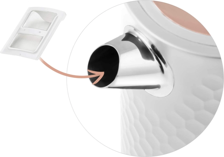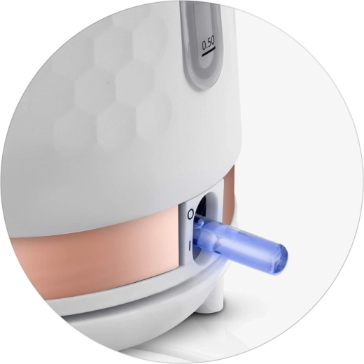 Den praktiske 360° drejbare base med skridsikre fødder og kabelopbevaring giver komfort for både højre- og venstrehåndede. Aftageligt anti-kalkfilter i tuden opfanger mineralaflejringer, så du kan nyde helt ren te og kaffe. Beskyttelse mod tørkogning øger sikkerheden under brug.