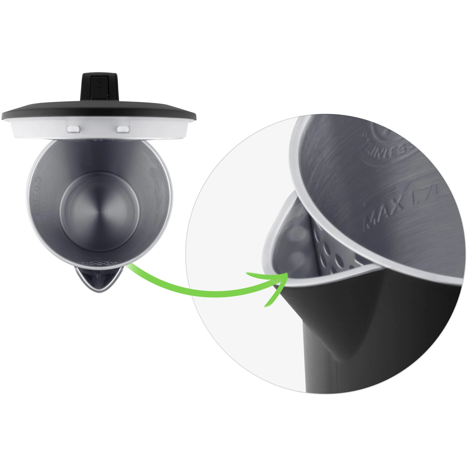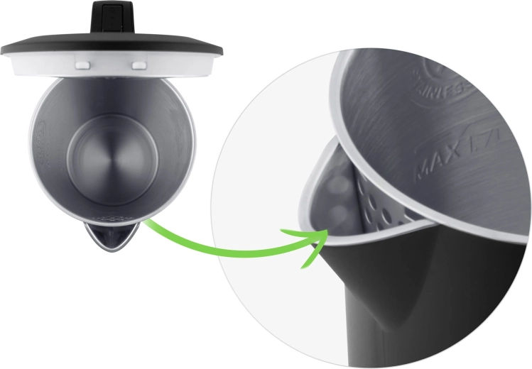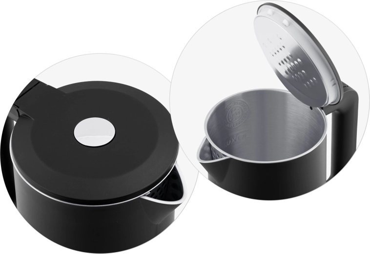 Kedlen er designet til komfort: 360° drejbar base til både højre- og venstrehåndede, aftageligt filter for en ren hældestrøm og automatisk beskyttelse mod tørkogning for maksimal sikkerhed. Elegant LED-belysning viser tydeligt driftsstatus, og kablet kan nemt gemmes i det integrerede rum.