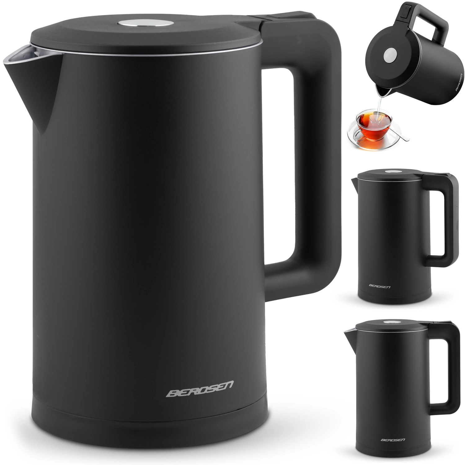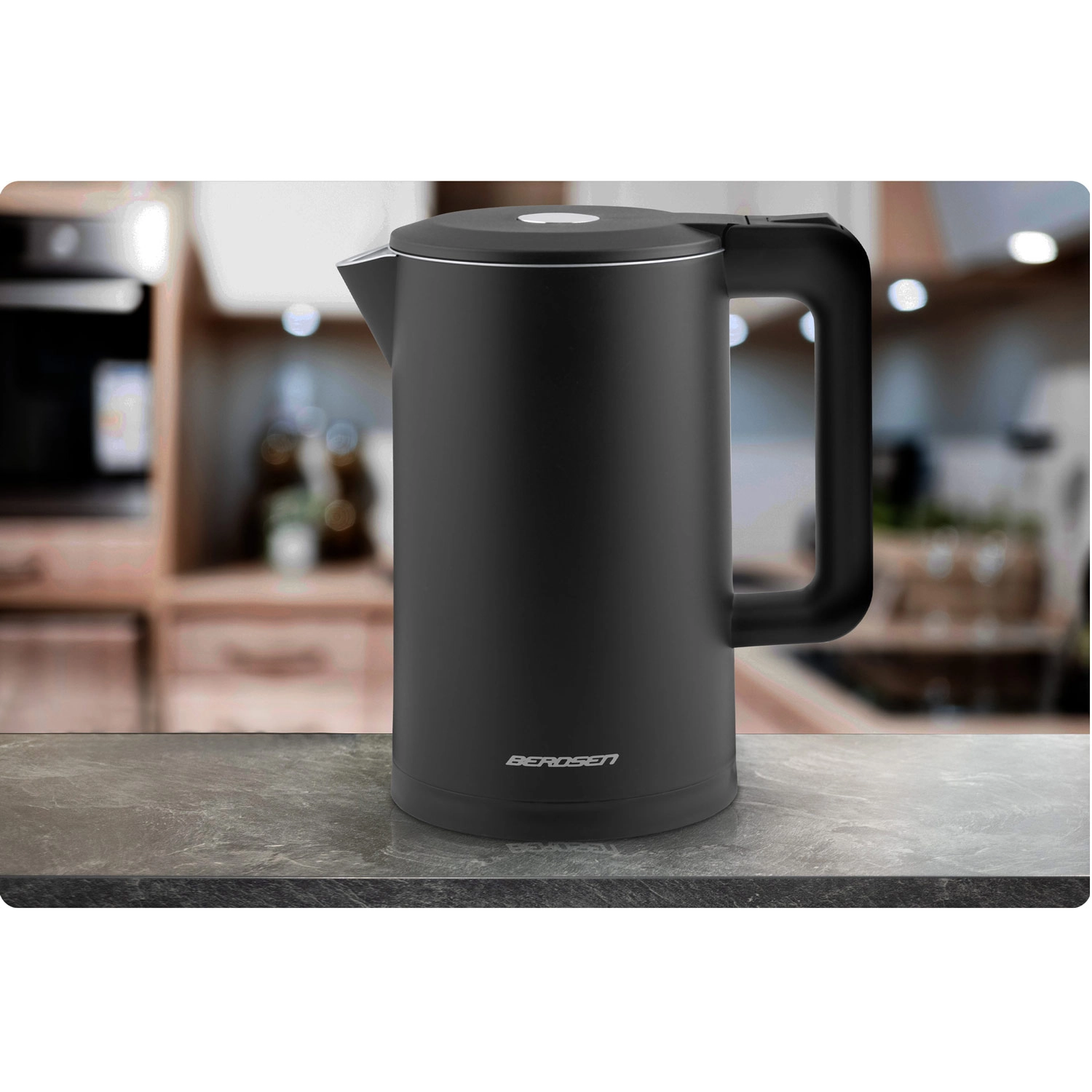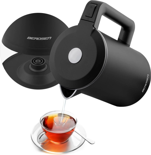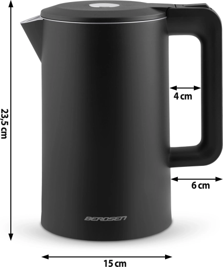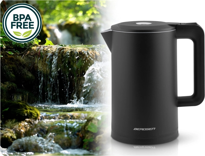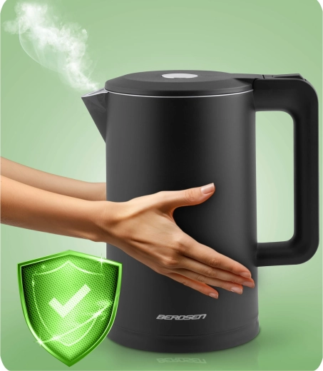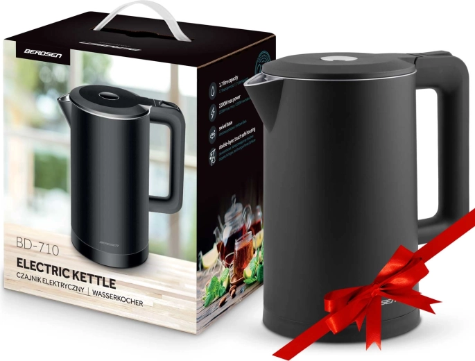 Den stilfulde elektriske kedel BERDSEN med kapacitet på 1,7 l kombinerer rustfrit stål SUS304 for en ren vandsmag og en isoleret CoolTouch™-konstruktion for sikker brug uden forbrændinger. Den tilbyder effekt på 1850–2200 W for hurtig kogning, 360° drejbar base, oplyst LED-lysstribe og gennemtænkte detaljer som kabelopbevaring og skridsikre fødder.