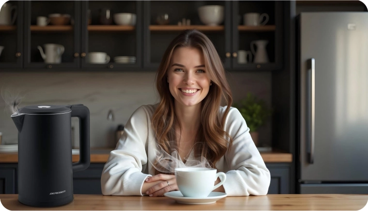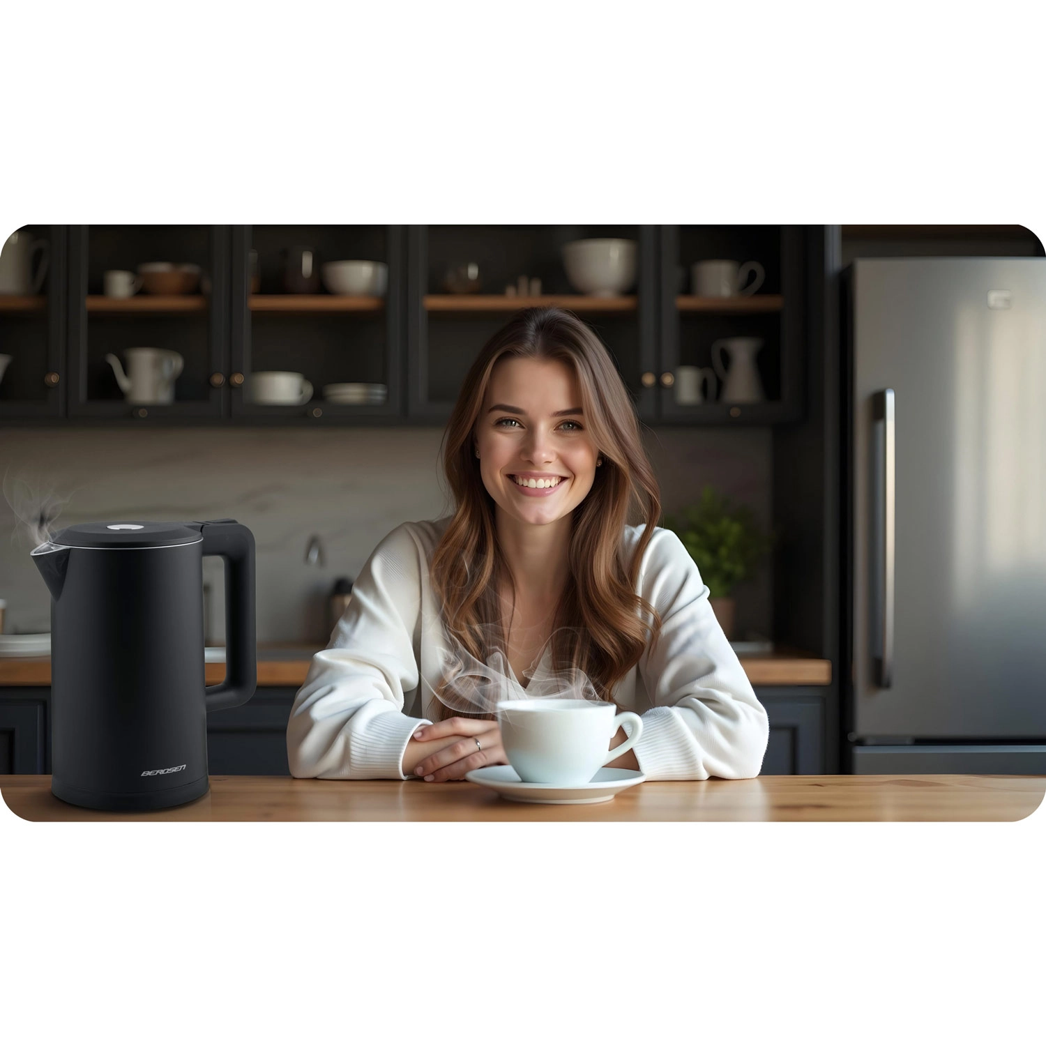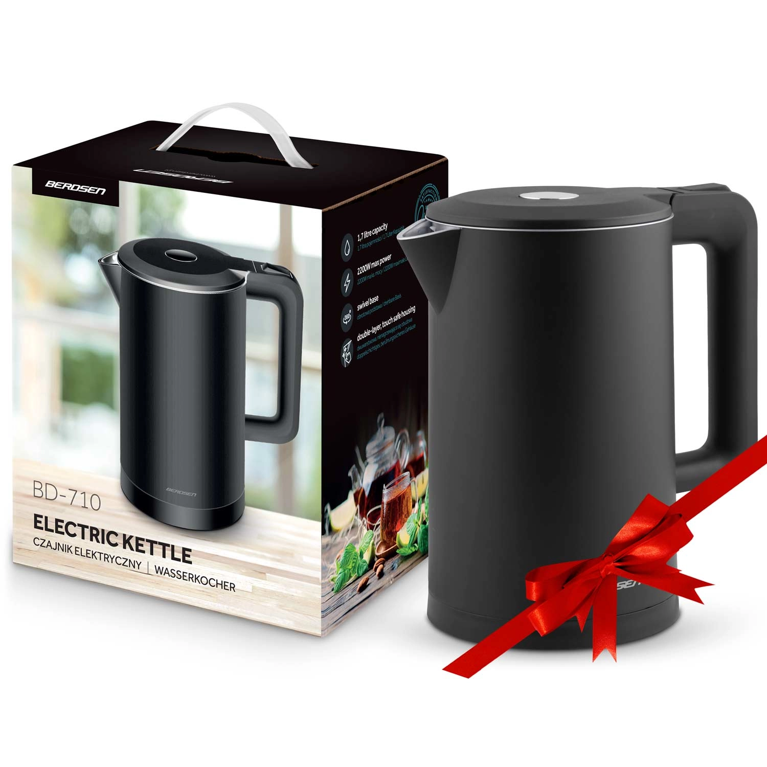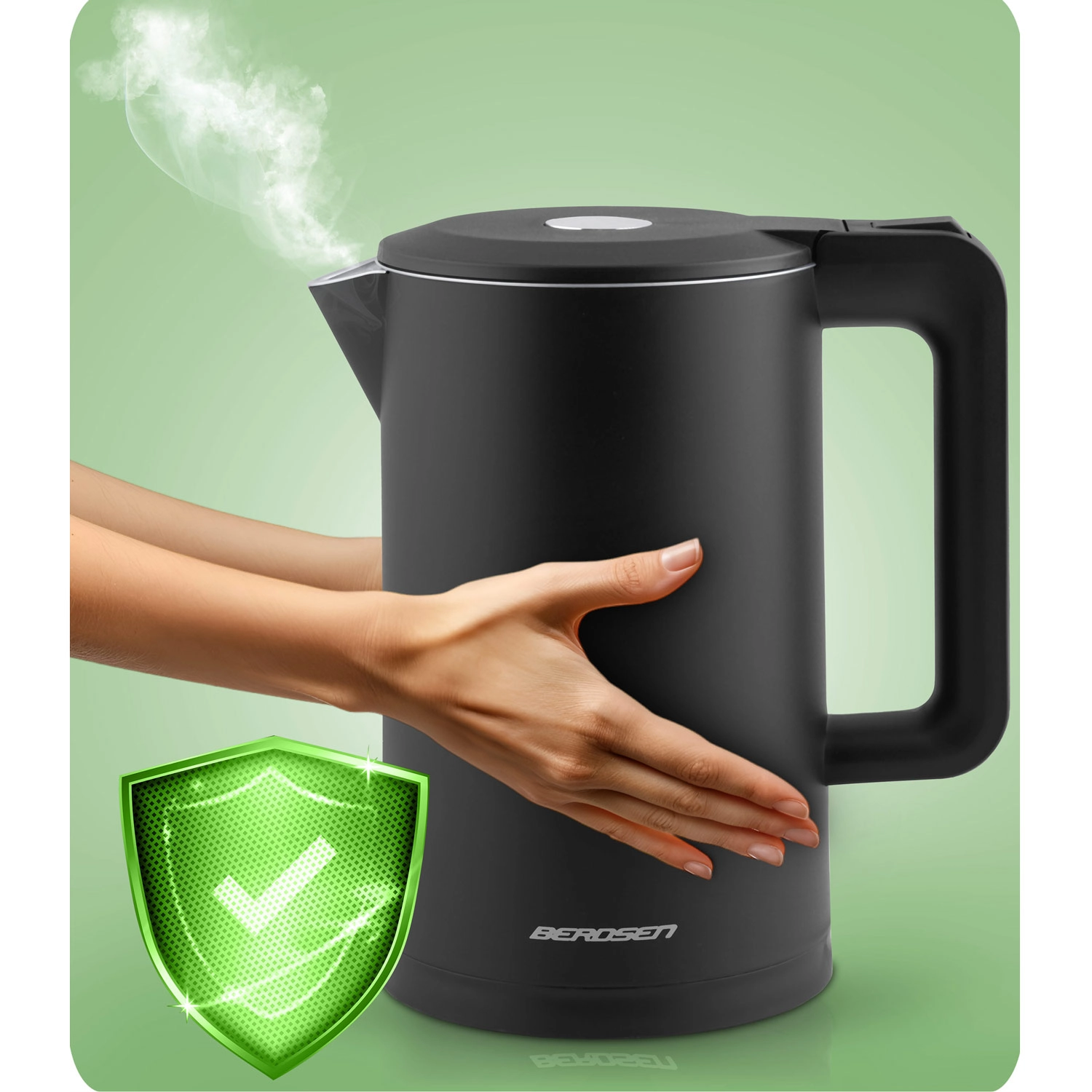 Den stilfulde elektriske kedel BERDSEN med kapacitet på 1,7 l kombinerer rustfrit stål SUS304 for en ren vandsmag og en isoleret CoolTouch™-konstruktion for sikker brug uden forbrændinger. Den tilbyder effekt på 1850–2200 W for hurtig kogning, 360° drejbar base, oplyst LED-lysstribe og gennemtænkte detaljer som kabelopbevaring og skridsikre fødder.