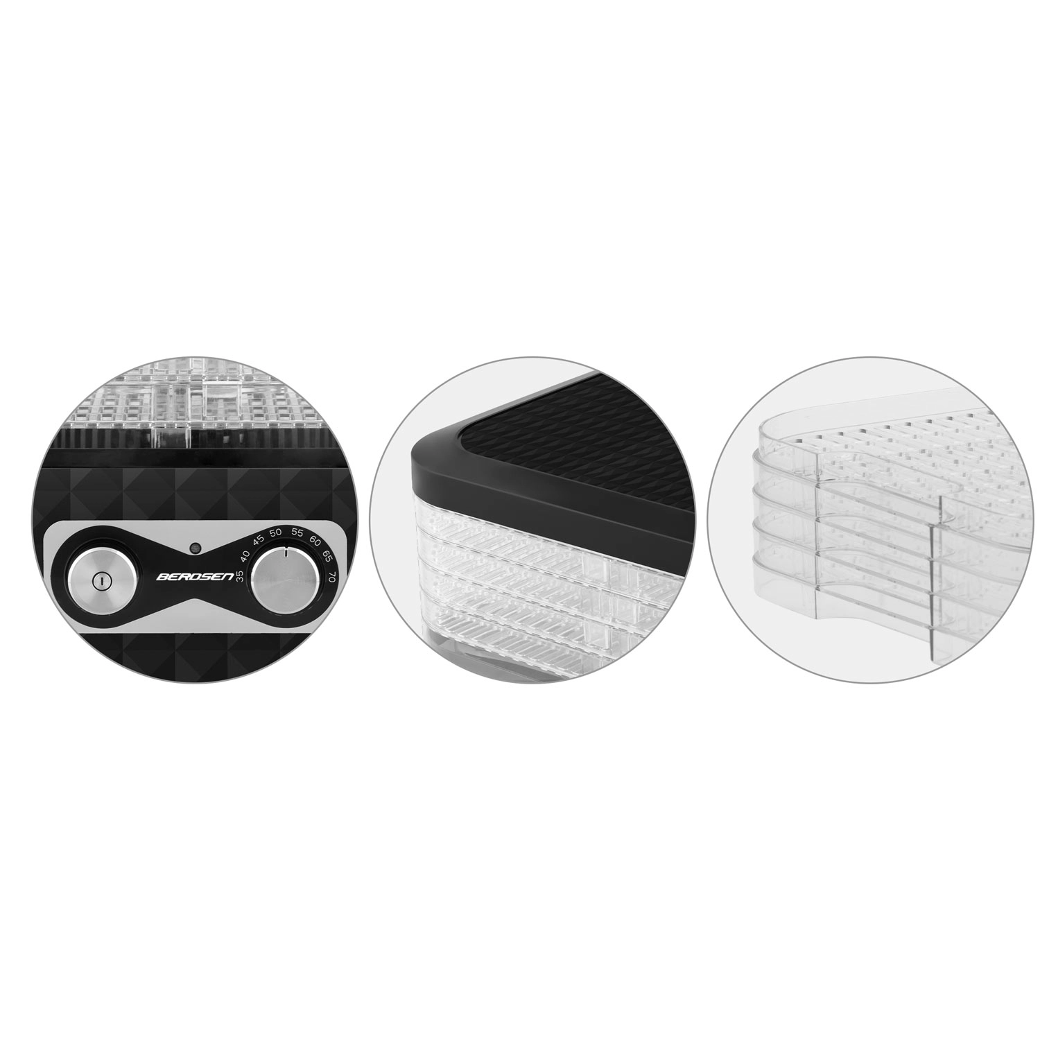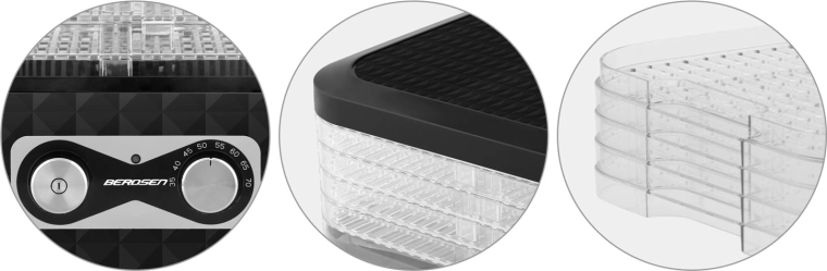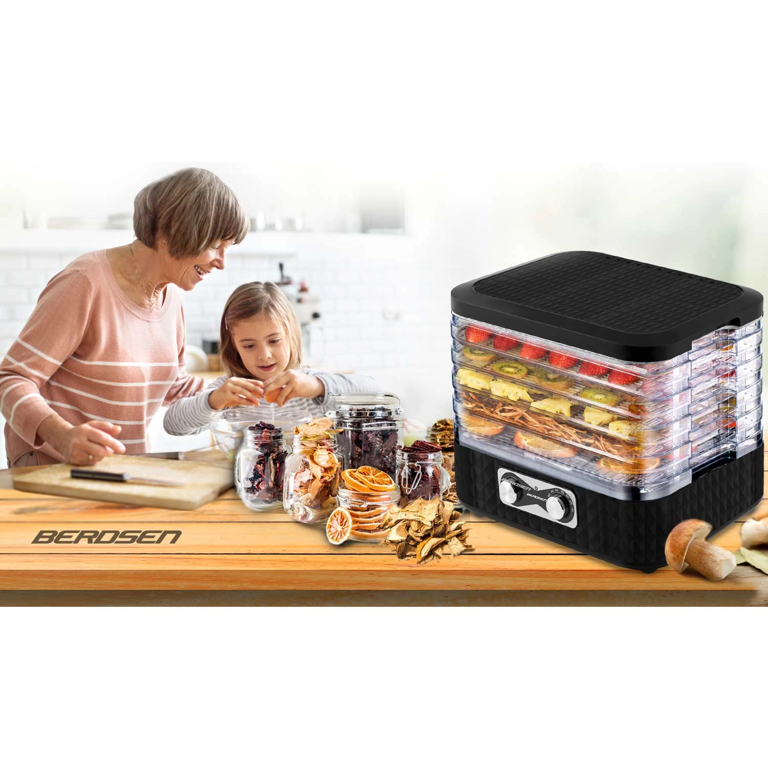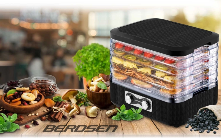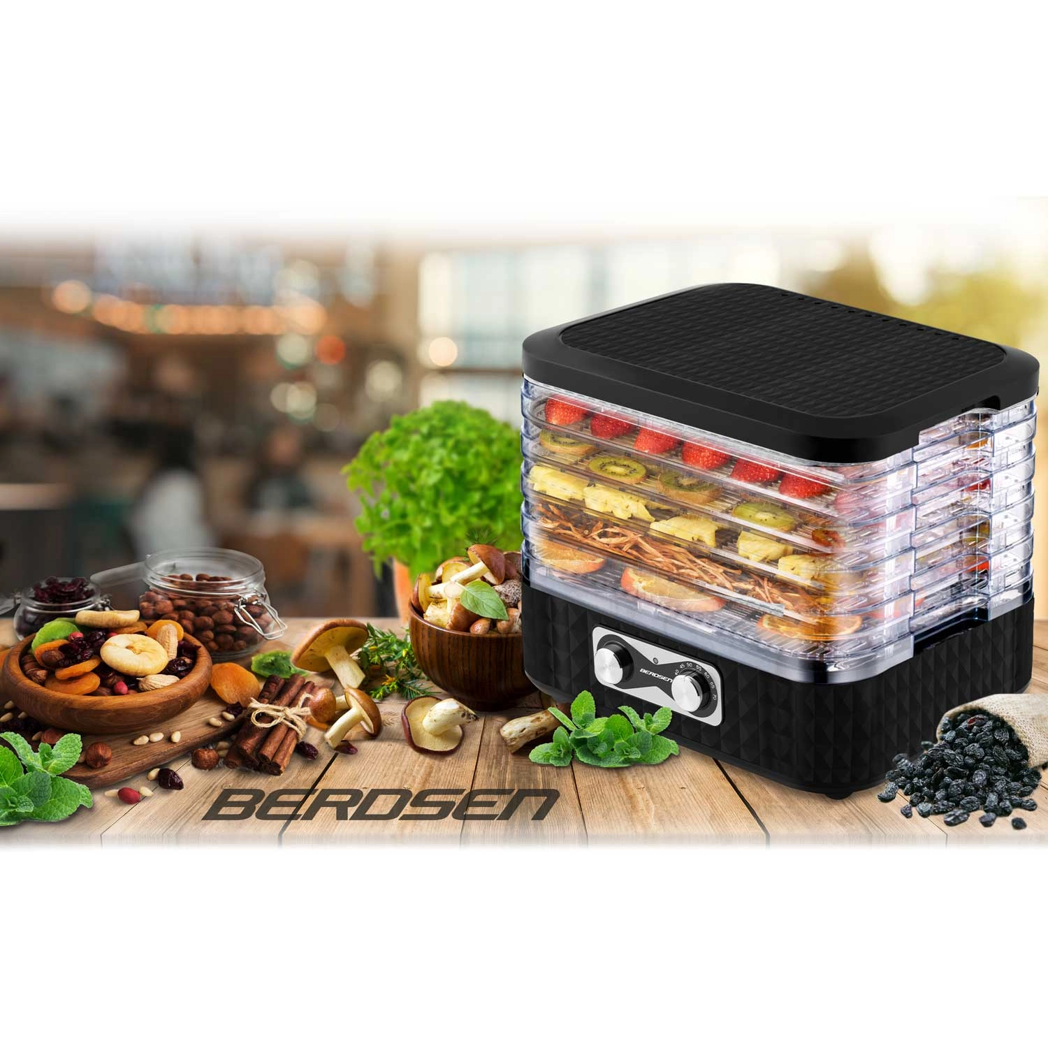Lav forråd til hele sæsonen. BERDSEN-tørreren med enkel betjening og gennemsigtige bakker sikrer jævn tørring uden at brænde på. De fem fine net forhindrer, at små stykker falder igennem, så du uden bekymringer kan tørre urter, skovsvampe samt skiver af jordbær eller æbler.