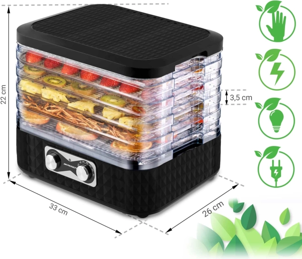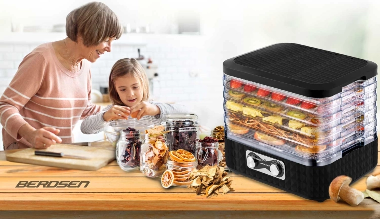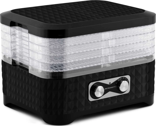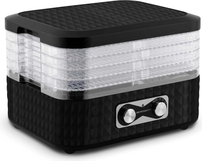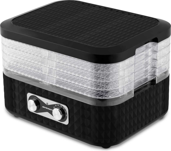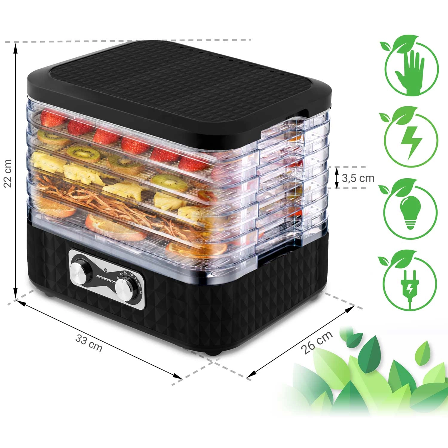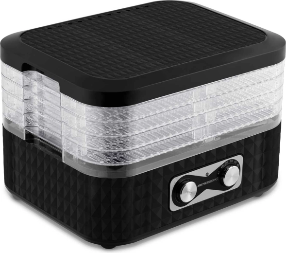 Opdag hjemmetørring med en effekt på 400 W og en kapacitet på 10 liter. Fødevaretørreren BERDSEN tilbyder 5 stabelbare bakker, trinfri temperaturregulering 35–70 °C, jævn luftcirkulation og overophedningsbeskyttelse. Ideel til frugt, grøntsager, urter, svampe og kød – sunde snacks hele året.