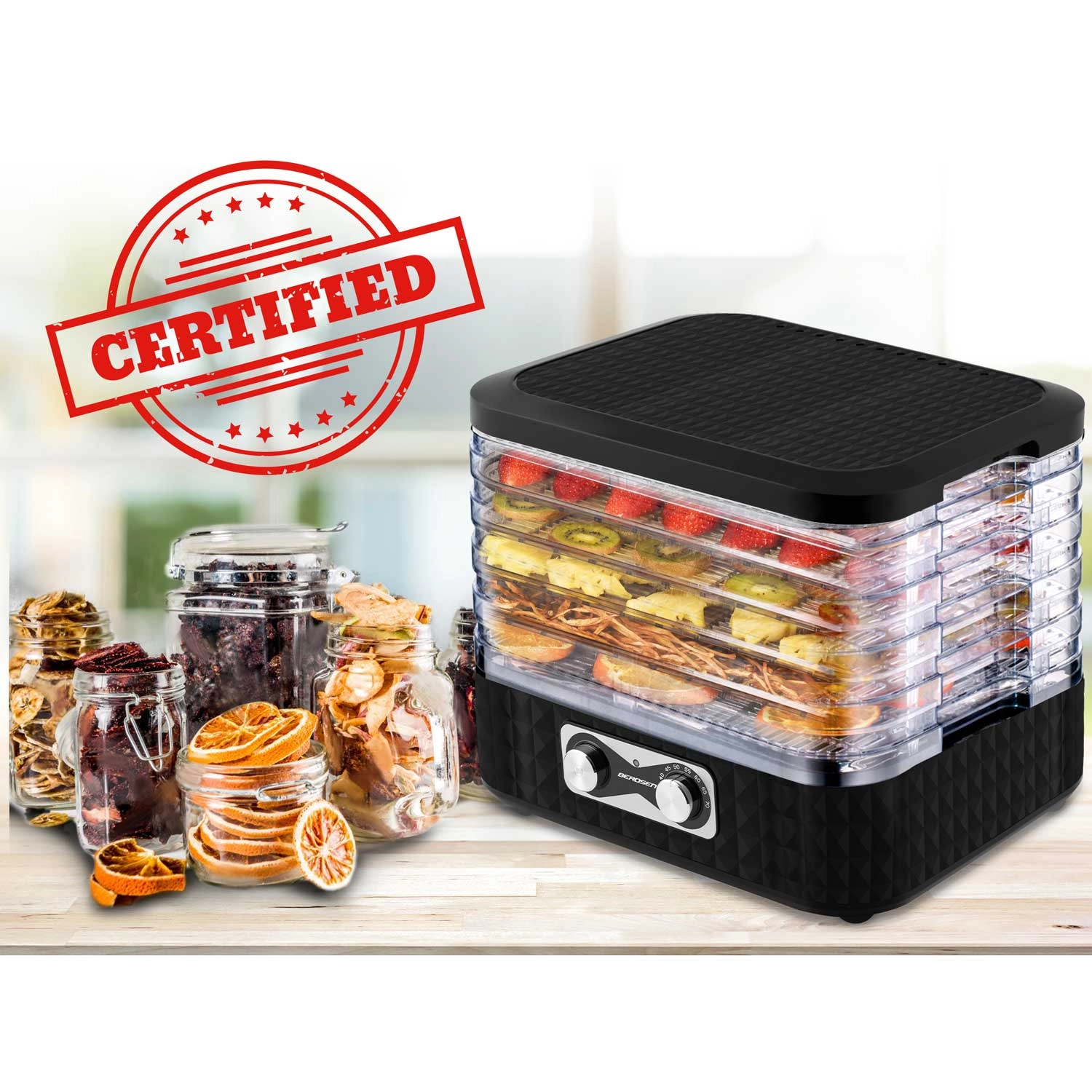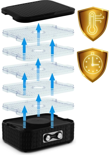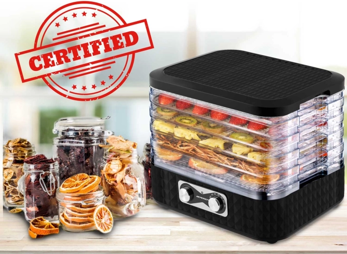 Takket være temperaturindstilling i området 35–70 °C kan du tilpasse tørringen til de enkelte fødevarer – fra skånsom tørring af urter til mere intensiv tørring af grøntsager og kød. Sikker drift understøttes af CE- og RoHS-certificeringer samt integrerede termiske sikkerhedselementer.