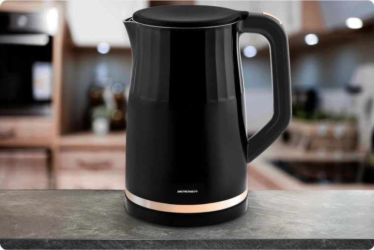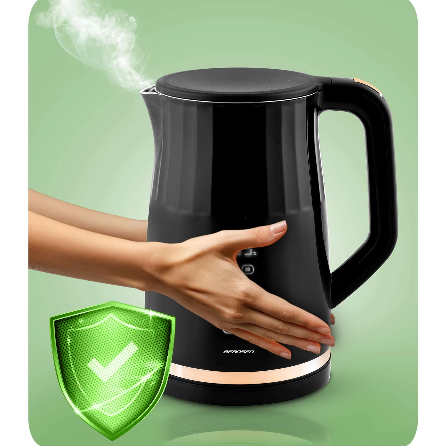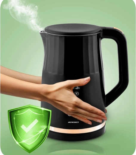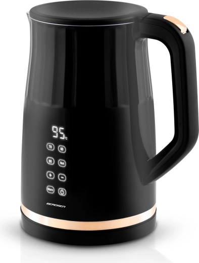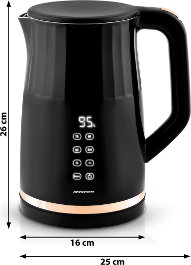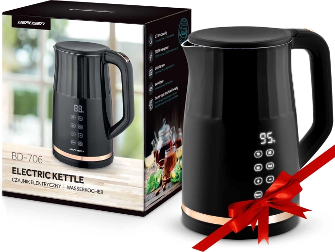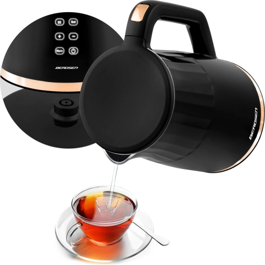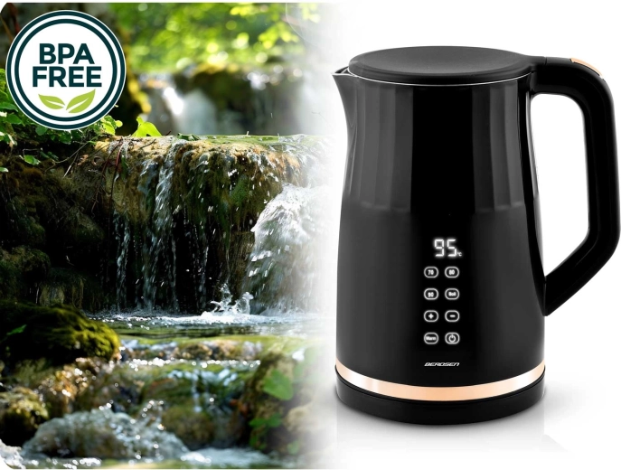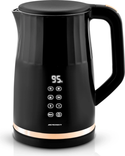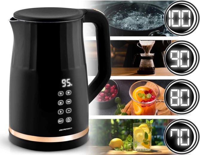 Den moderne elektriske kedel BERDSEN med kapacitet på 1,7 l har et touchpanel med digital temperaturvisning, 4 forudindstillede temperaturer (70/80/90/100 °C) og en KEEP WARM-funktion i op til 2 timer. Takket være den dobbeltvæggede, isolerede CoolTouch-konstruktion forbliver overfladen kølig at røre ved, mens det indvendige i rustfrit stål SUS 304 sikrer ren vandsmag uden BPA.