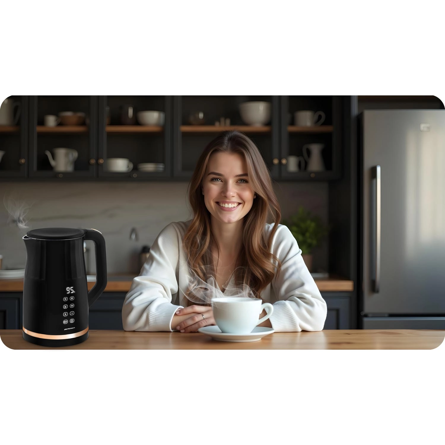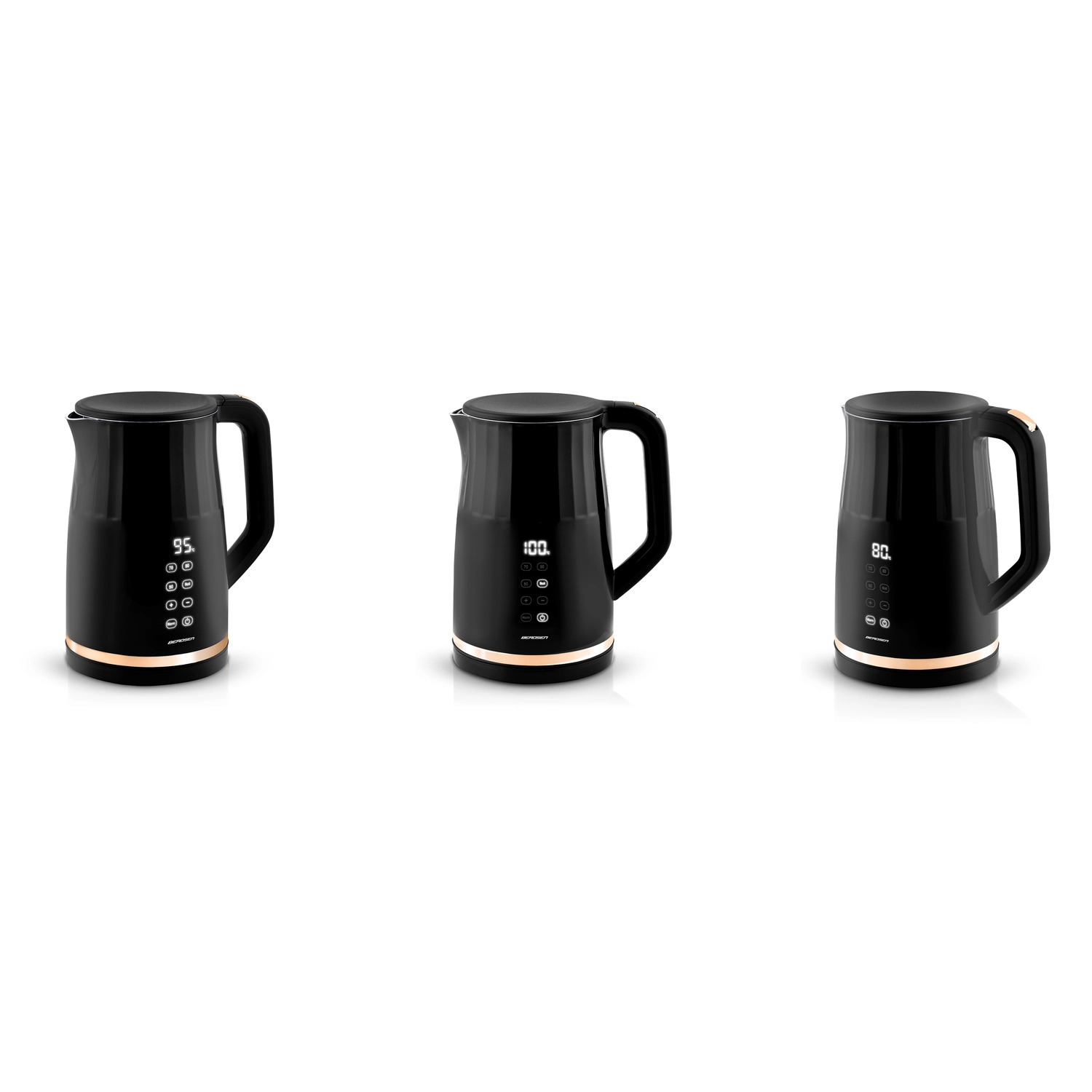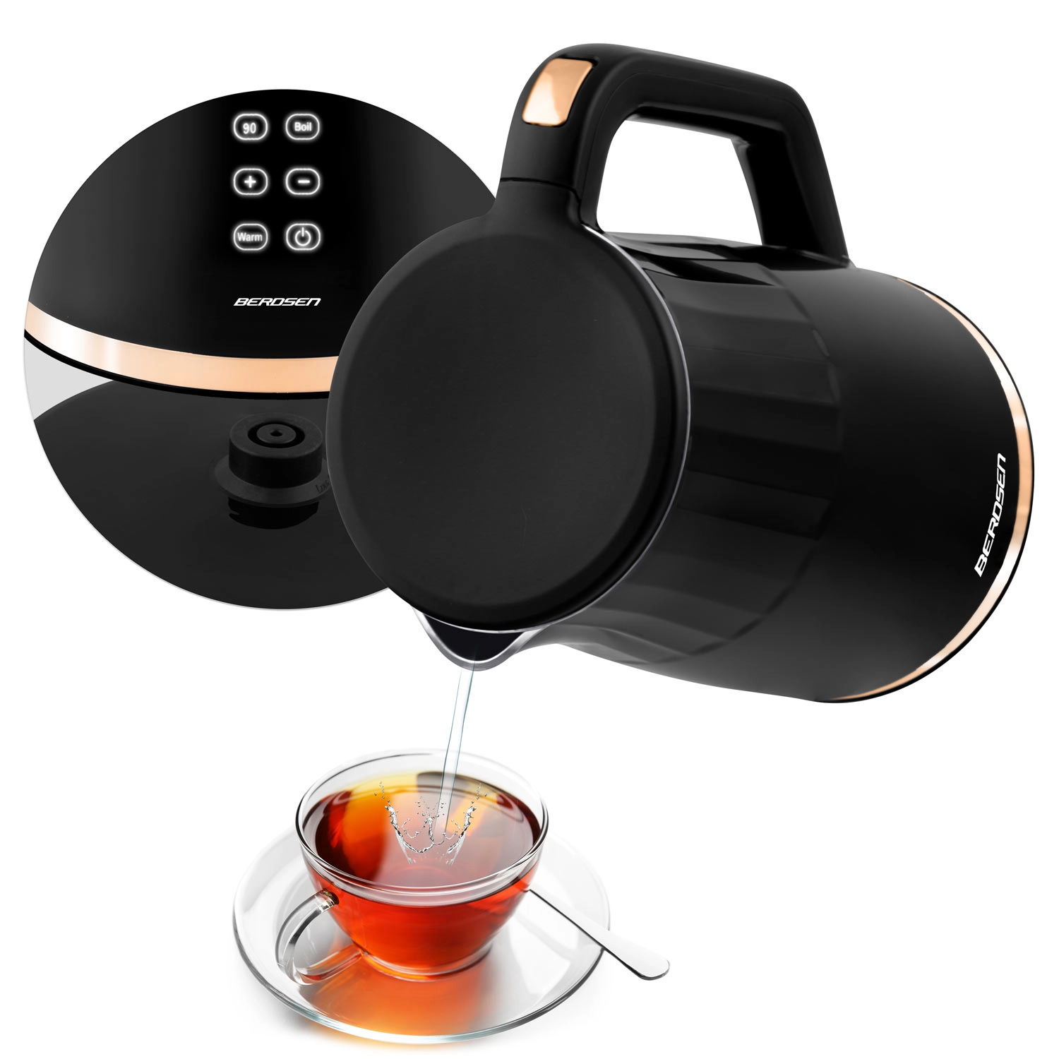 Den moderne elektriske kedel BERDSEN med kapacitet på 1,7 l har et touchpanel med digital temperaturvisning, 4 forudindstillede temperaturer (70/80/90/100 °C) og en KEEP WARM-funktion i op til 2 timer. Takket være den dobbeltvæggede, isolerede CoolTouch-konstruktion forbliver overfladen kølig at røre ved, mens det indvendige i rustfrit stål SUS 304 sikrer ren vandsmag uden BPA.