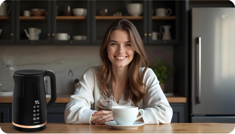 Nyd præcis opvarmning af vand til te, kaffe og urtete. Touch-betjeningen er nem at bruge, og den tydelige skærm viser den aktuelle temperatur i realtid. BERDSEN-kedlen kombinerer elegant sort design med metaldetaljer, ergonomisk håndtag og sikker drift takket være beskyttelse mod tørkogning.