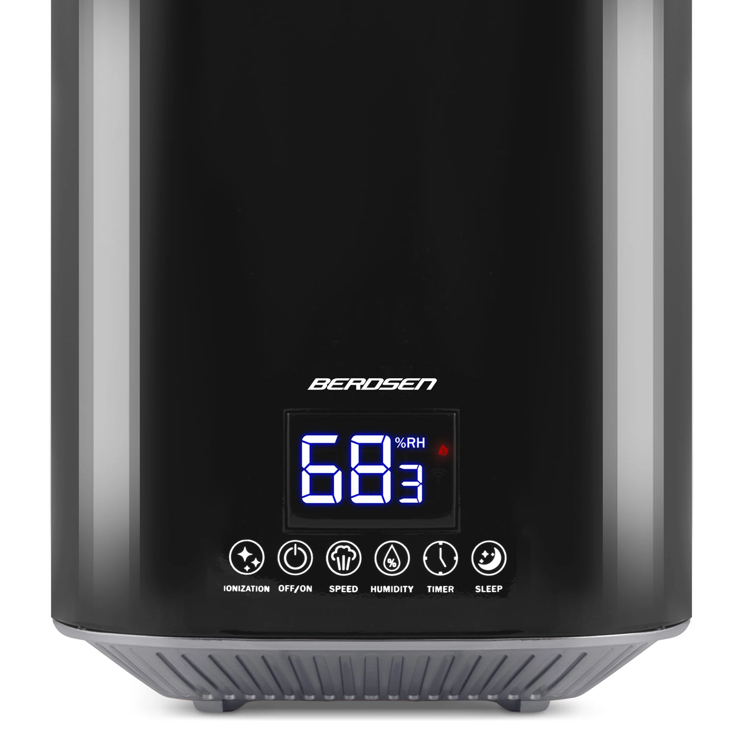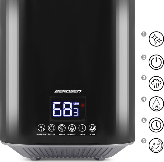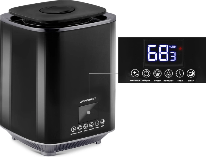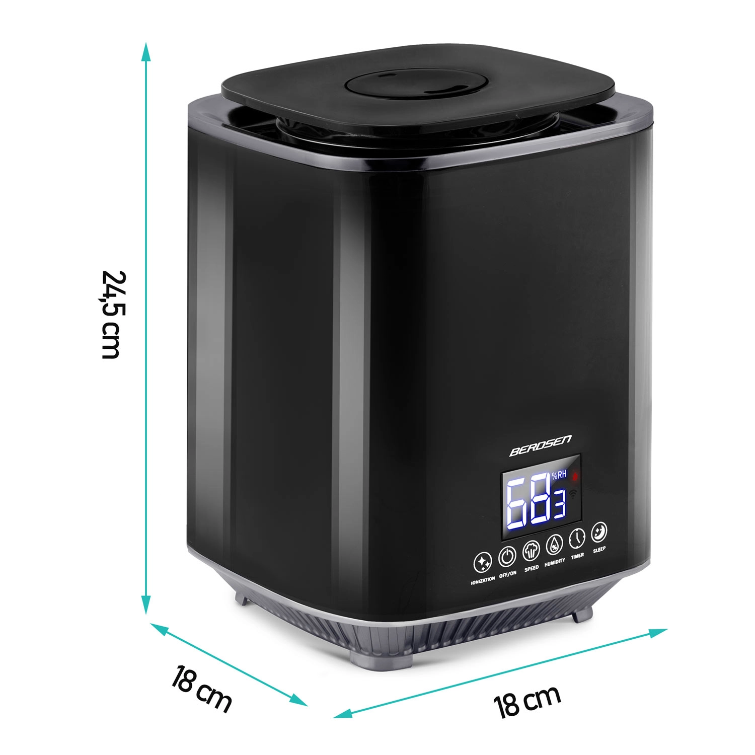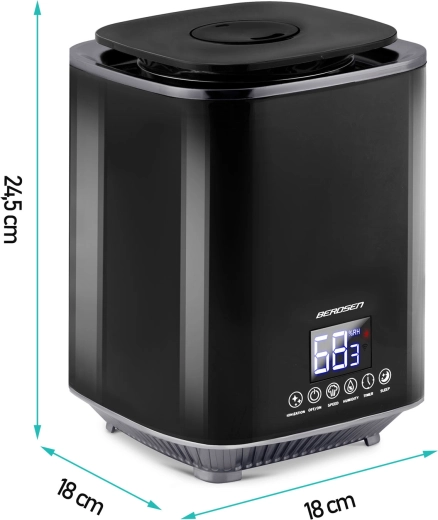 Moderne ultralydsluftfugter BERDSEN med ionisering og aromaterapi sikrer et sundt indeklima derhjemme og på kontoret. Den tilbyder kapacitet op til 250 ml/t, stor vandtank på 2,6 l, præcis fugtstyring via hygrostat 45–90 % og indbygget hygrometer. Bekvem betjening via berøringsfølsomt LED-panel og fjernbetjening, desuden timer, nattilstand og automatisk slukning når tanken er tom.