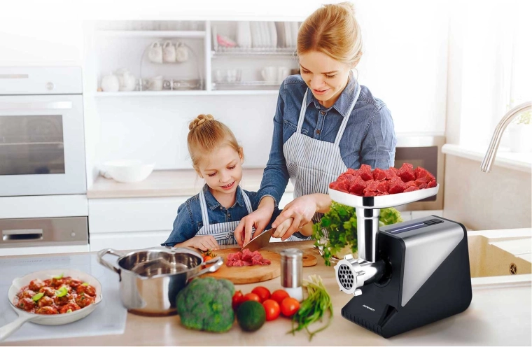 Motor på 800 W (maks. 2000 W) med reverse-funktion sikrer hurtig forarbejdning af kød og hårdere råvarer uden tilstopning. Tre skiver 3/5/7 mm for præcis tekstur.