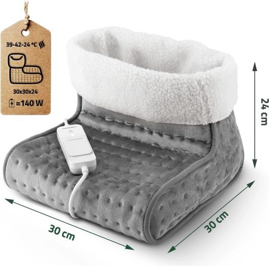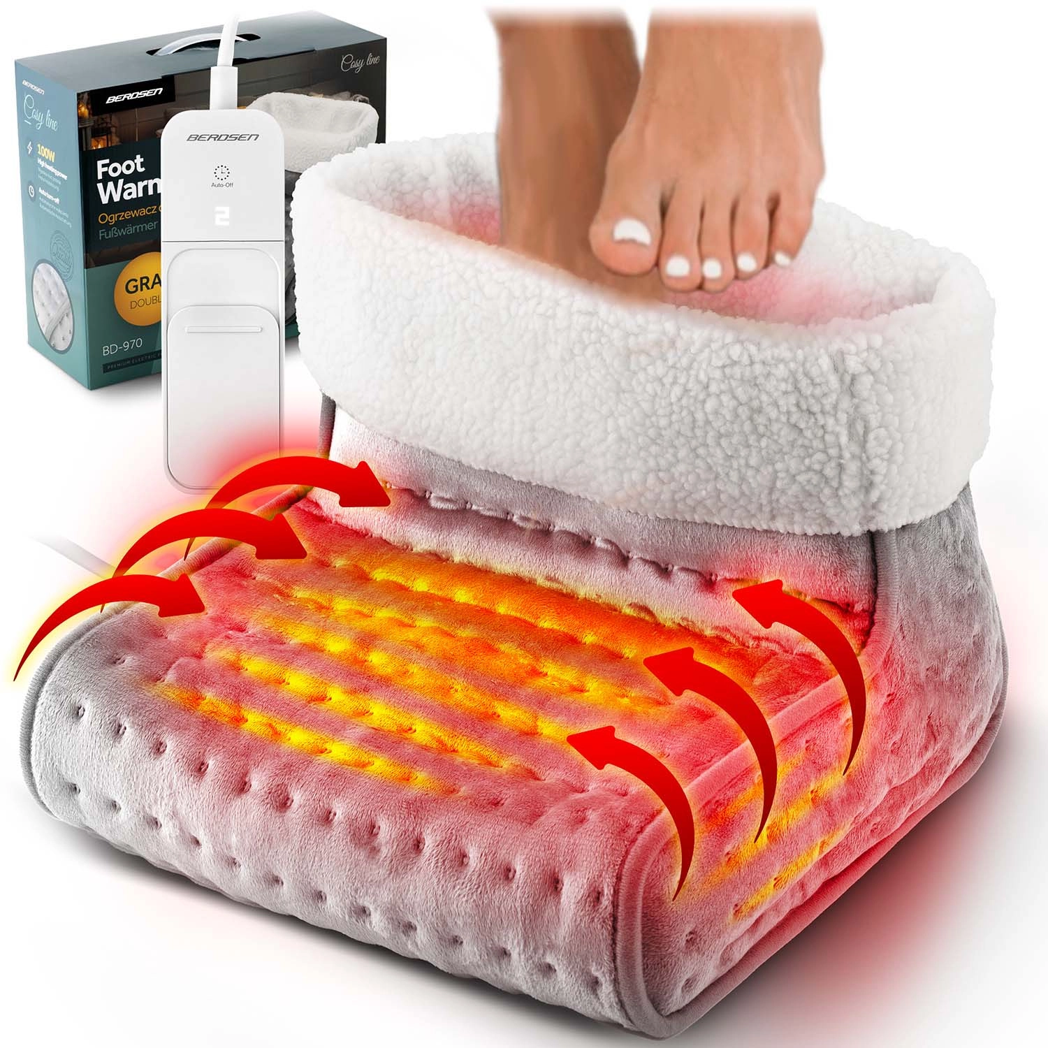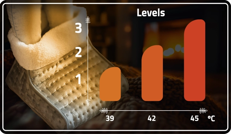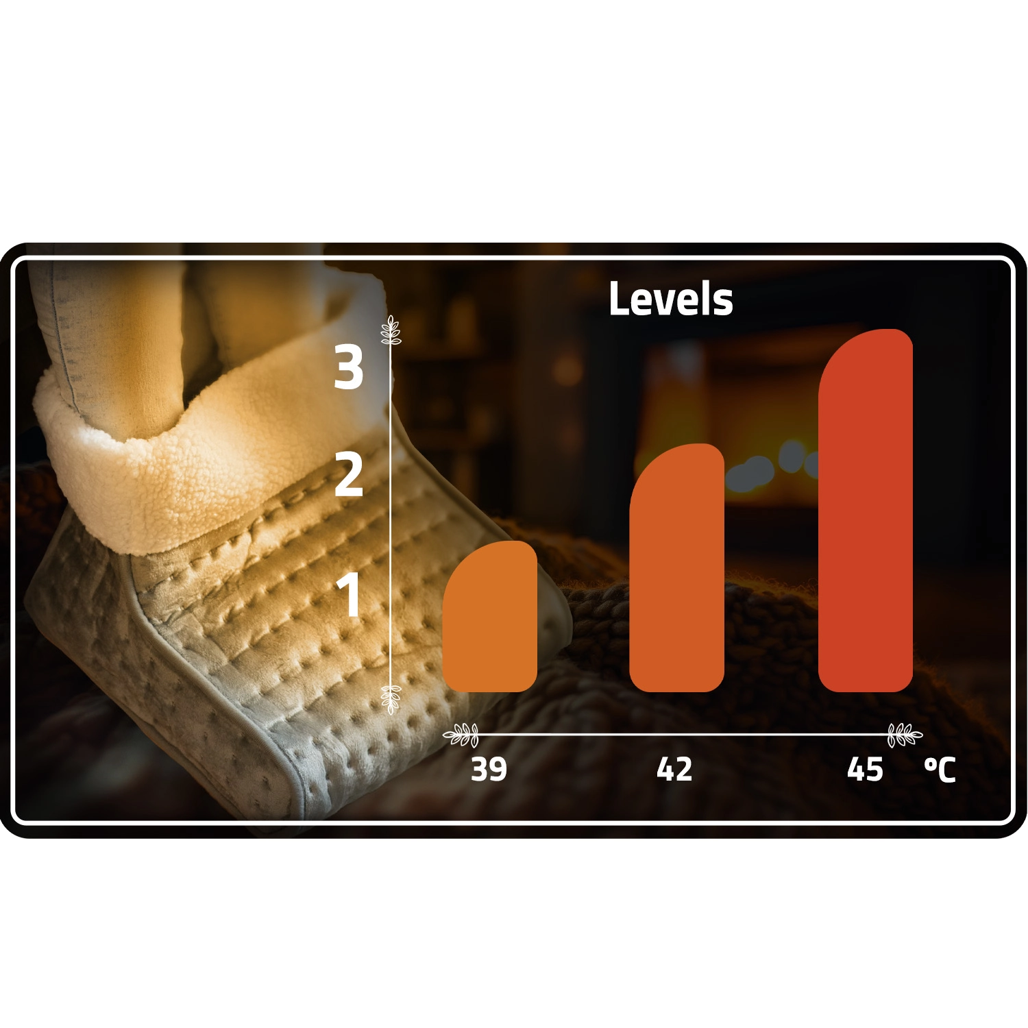 For maksimal sikkerhed har enheden automatisk slukning efter 90 minutter og beskyttelse mod overophedning. Takket være den hurtige temperaturstigning (ca. 2 min) giver den øjeblikkelig lindring til kolde fødder, mindsker spændinger og fremmer afslapning efter en travl dag.