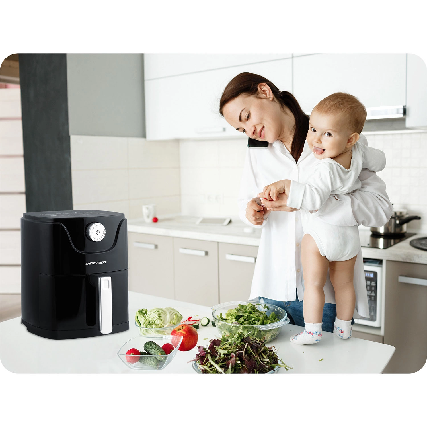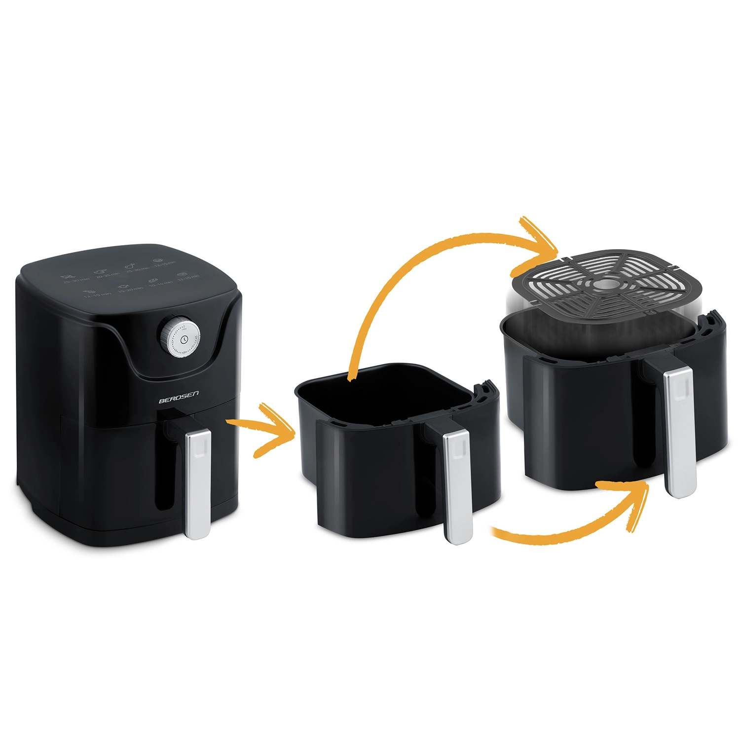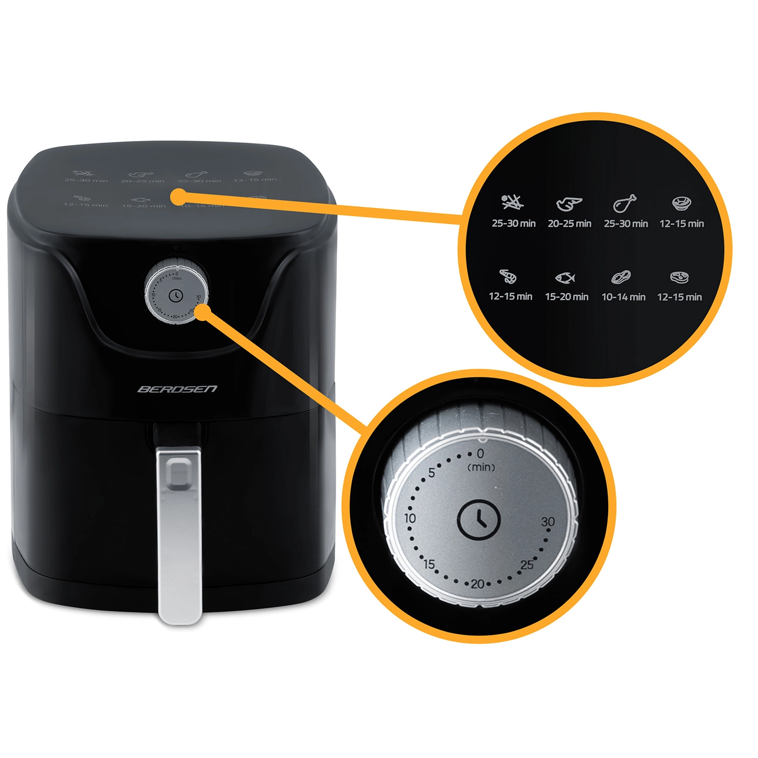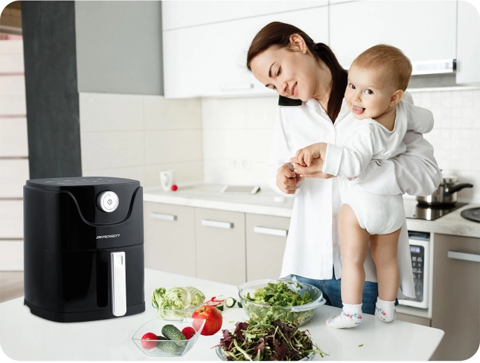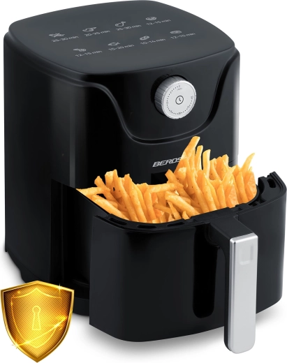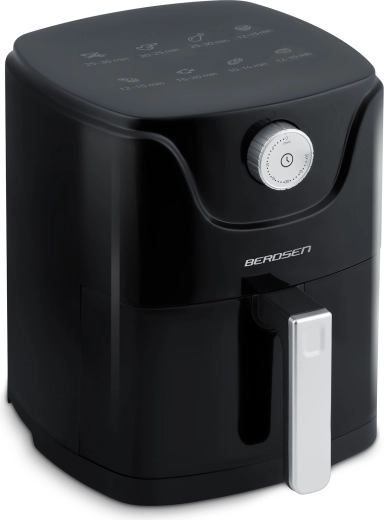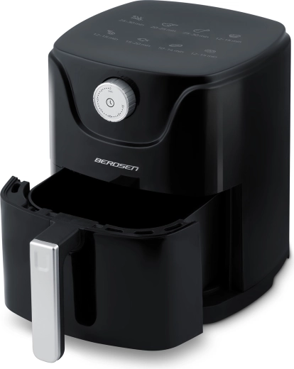 Varmluftfrituren BERDSEN kombinerer sundere madlavning med maksimal komfort. Moderne luftstrøm sikrer gylden, sprød skorpe udenpå og saftigt indre – næsten uden olie, uden lugt og uden stænk. Den kompakte kapacitet på 2,5 l er ideel til en hurtig frokost, aftensnacks og lette måltider i hverdagen.