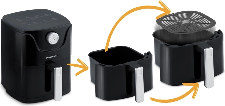 Aftagelig non-stick kurv og rist tåler opvaskemaskine. Pladsbesparende mål frigør plads på køkkenbordet.