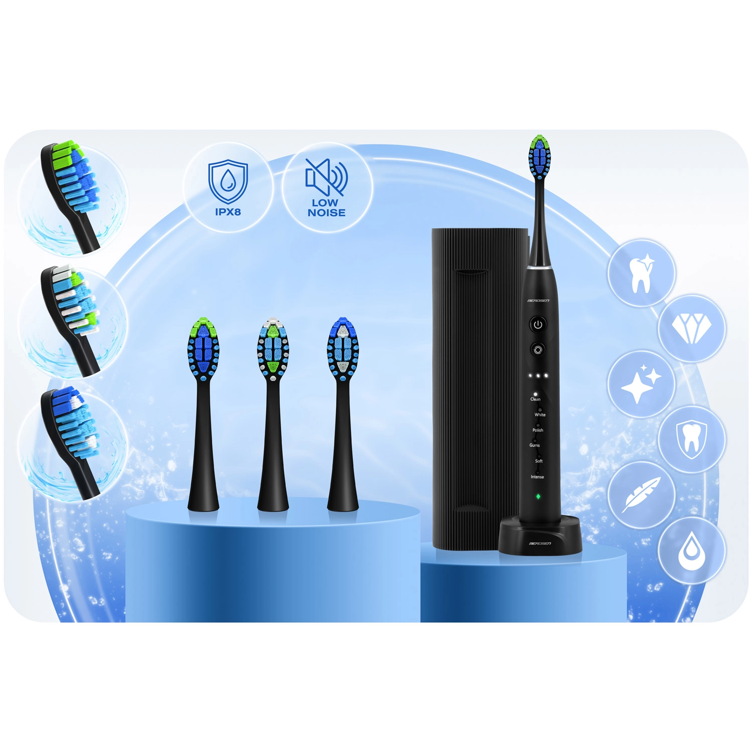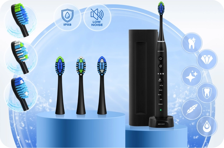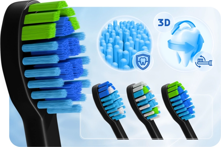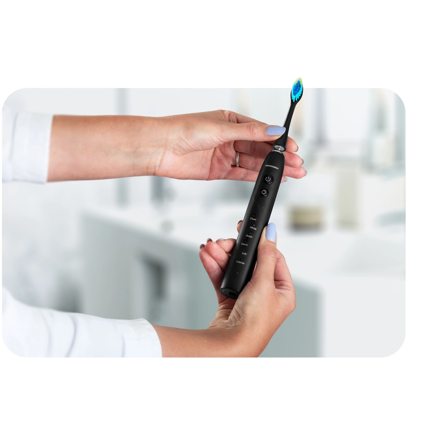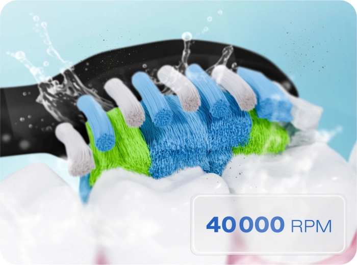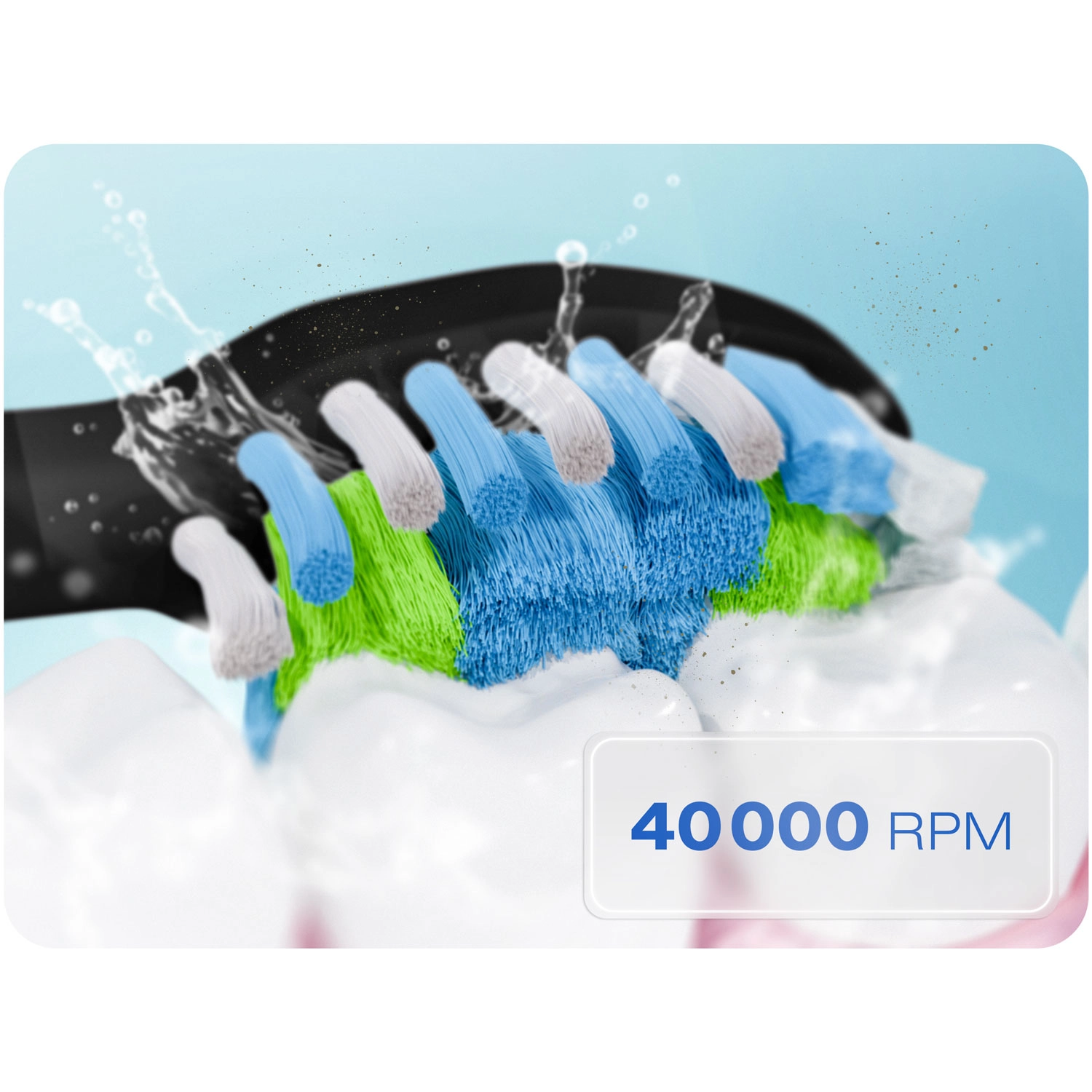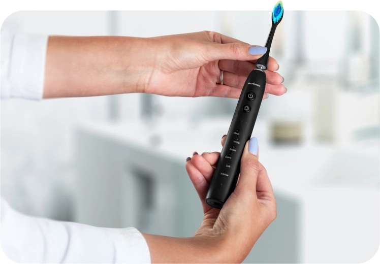 Den soniske teknologi i Berdsen Galaxy når ind i svært tilgængelige mellemrum og hjælper med at fjerne op til 6× mere plak end en manuel tandbørste. Det specialformede børstehoved med bløde, tynde børster tilpasser sig hver tand, og bagsiden gør det nemt at rense tungen for en langvarig frisk ånde. Det stilfulde sorte design suppleres af et ergonomisk håndtag og en stille, professionel ydeevne.