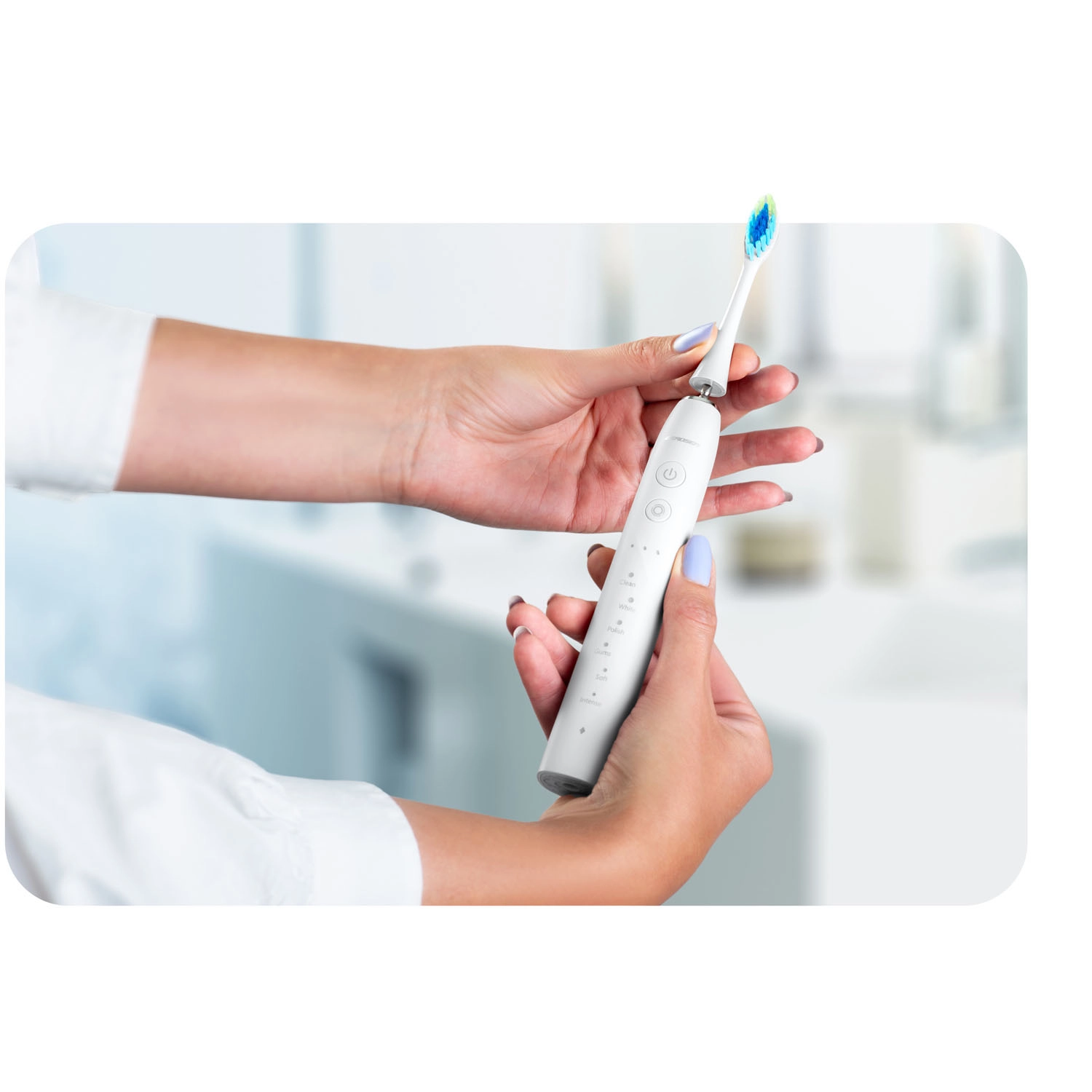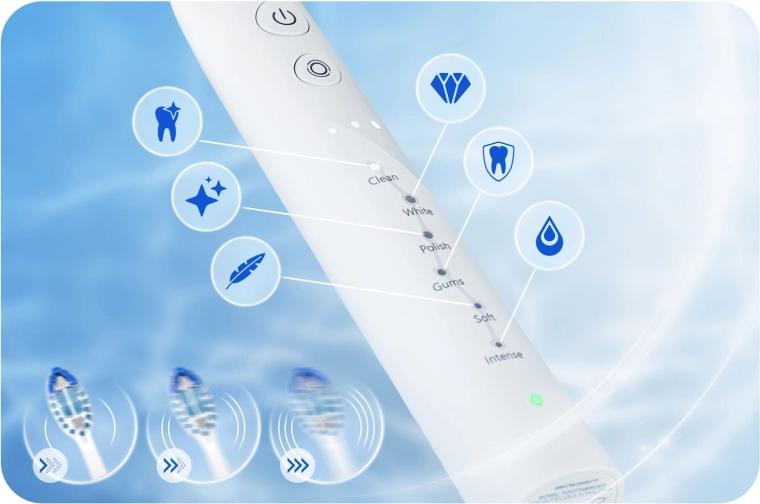 - 6 tilstande: Clean (daglig rengøring), White (whitening), Polish (polering), Gums (tandkødspleje), Soft (blid), Intense (dybderengøring)