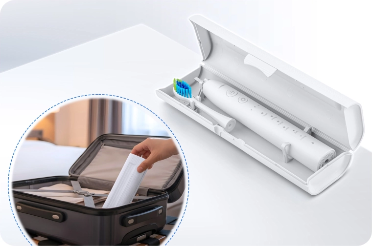 Vælg mellem 6 tilstande og 3 intensiteter (i alt 18 kombinationer) for pleje præcis efter dine behov – fra daglig rengøring til skånsom pleje af følsomme tandkød. Det stærke batteri på 800 mAh holder cirka 50 dage på en enkelt opladning, og takket være induktiv USB-ladestation er opladningen nem og stilfuld. Med IPX8 er tandbørsten også velegnet i bruseren, og rejseetuiet gør den til en ideel ledsager på ferien.