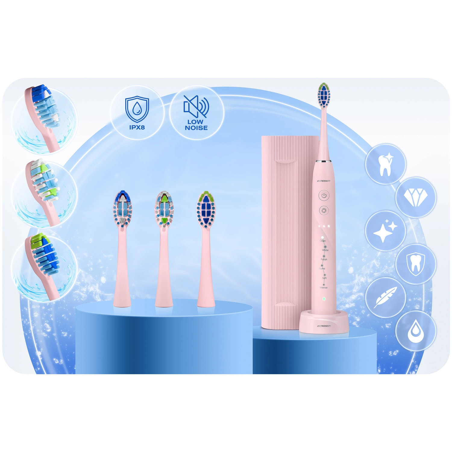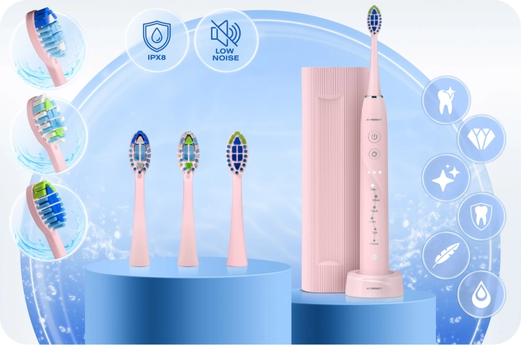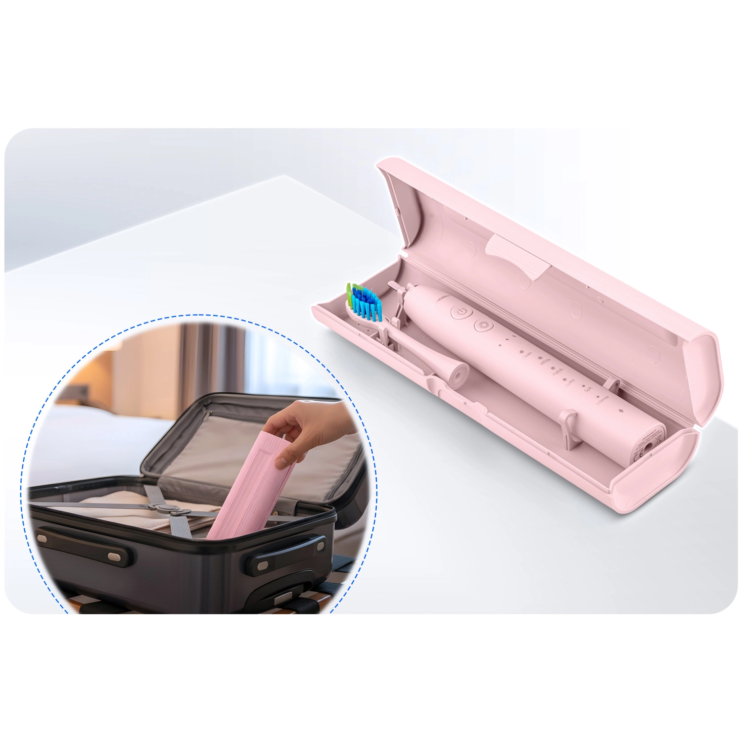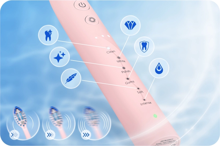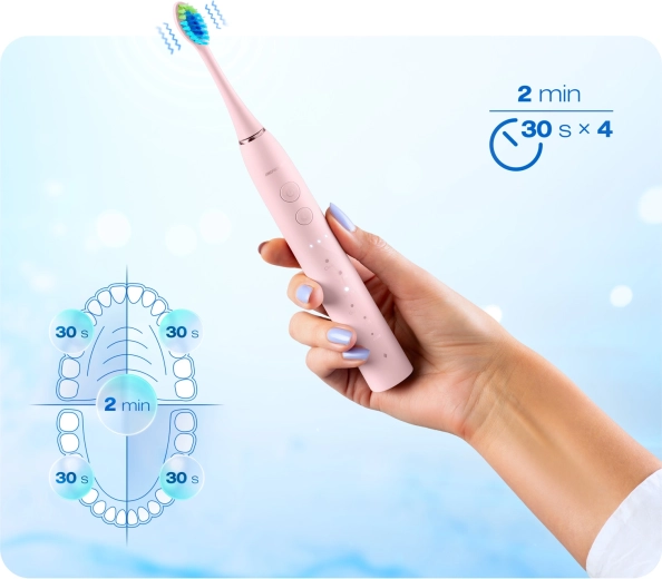 Vælg mellem 6 tilstande (Clean, White, Polish, Gums, Soft, Intense) og 3 intensitetsniveauer – i alt 18 kombinationer for maksimal personalisering. Den smarte timer slukker automatisk efter 2 minutter og minder hvert 30. sekund om at skifte kvadrant. Takket være 800 mAh-batteriet, induktiv USB-opladning og IPX8 er tandbørsten en pålidelig ledsager hjemme og på rejser.
