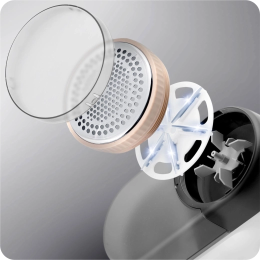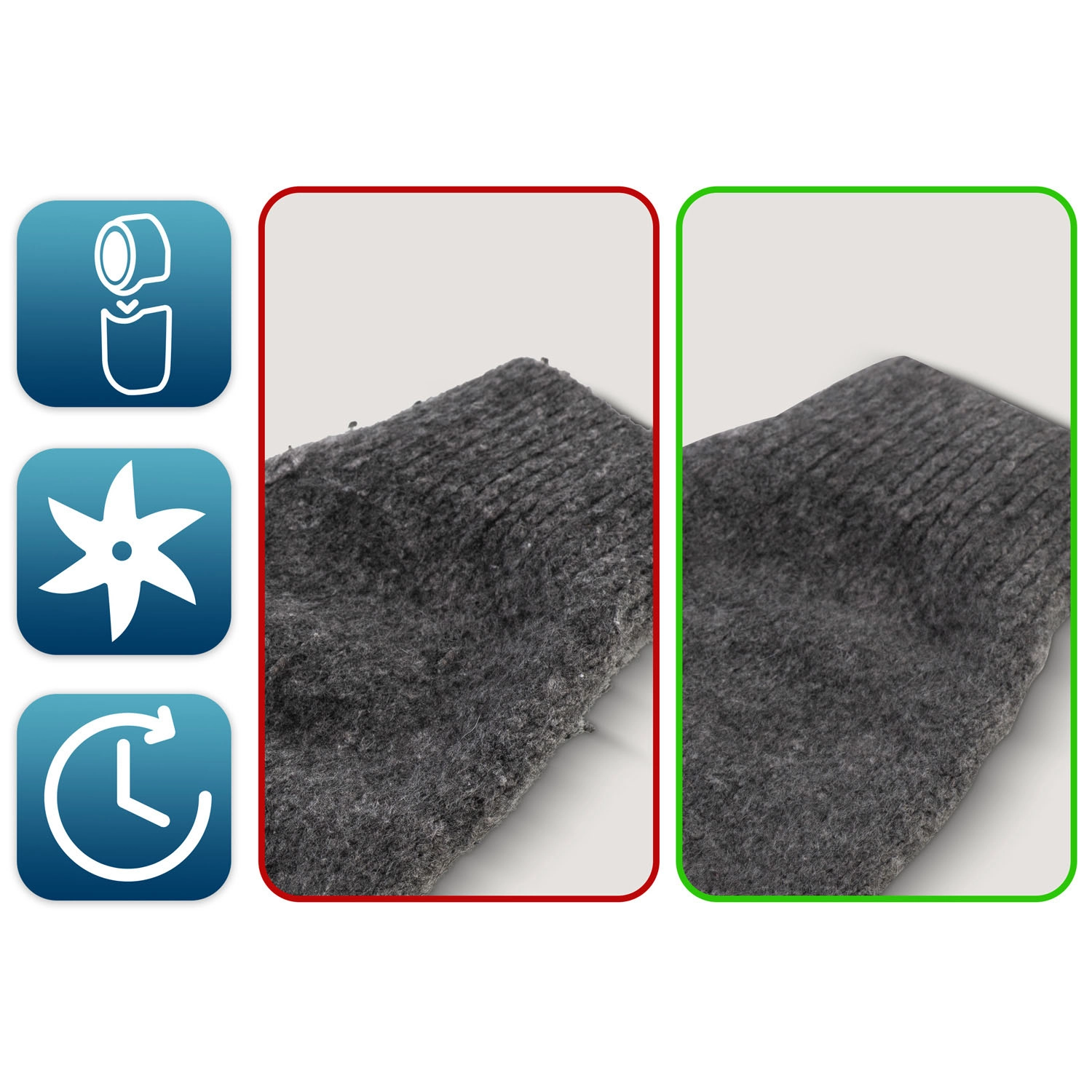 Holdbare rustfrie knive fjerner effektivt fnug og nopper, mens det formede beskyttelsesgitter skåner fibrene mod at hænge fast.