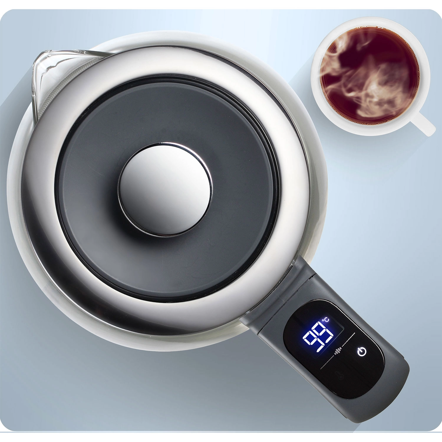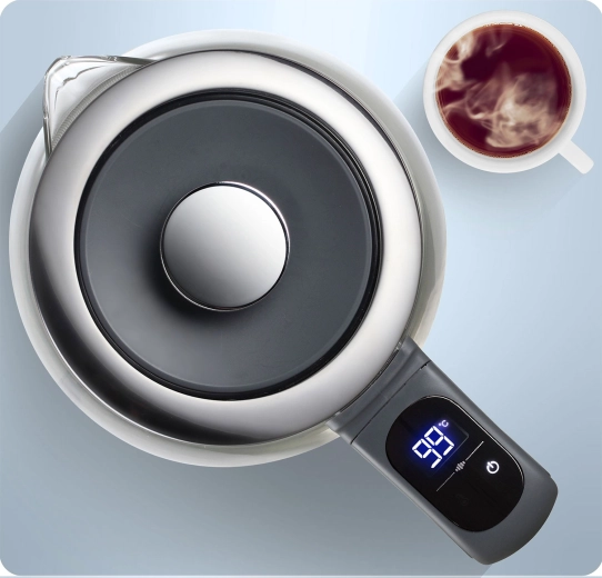 Vælg 40/55/80/90/100 °C med ét tryk og tilbered perfekt grøn te, filterkaffe og drikke til børn. Den integrerede sensor viser løbende den aktuelle temperatur.