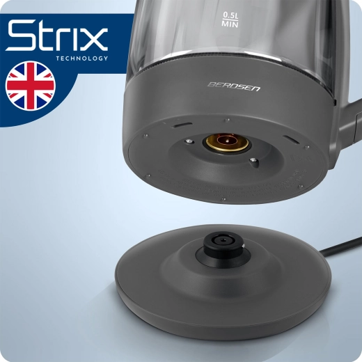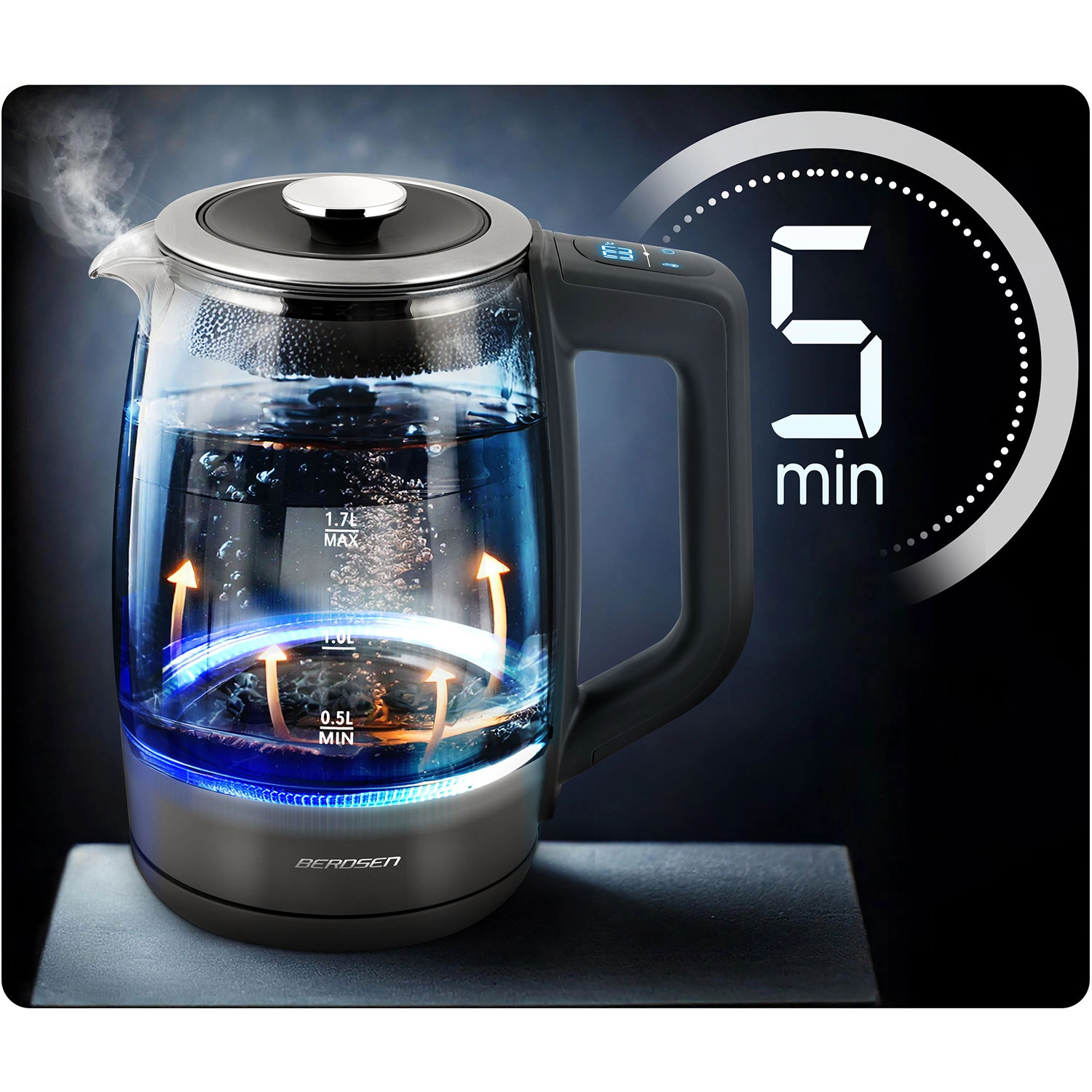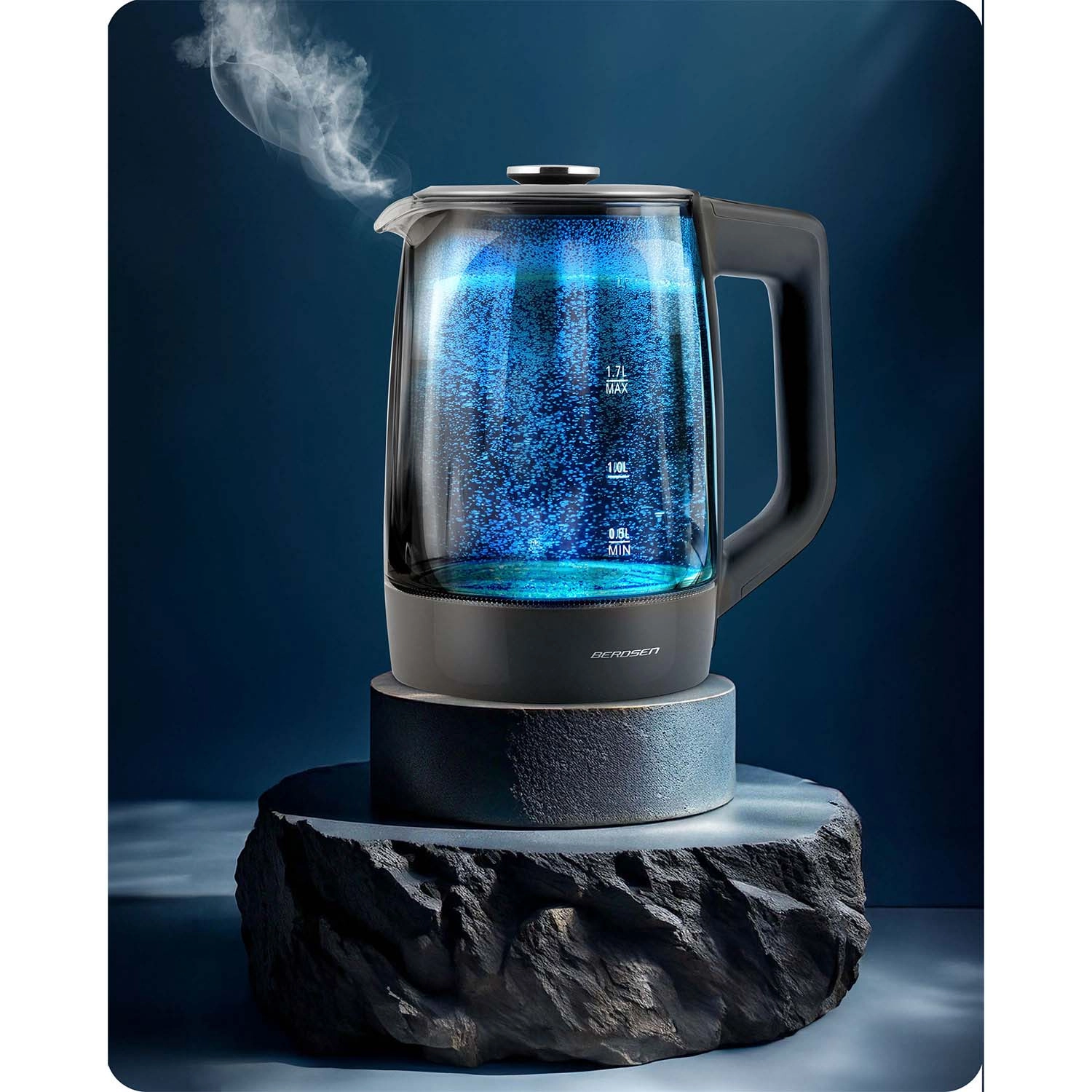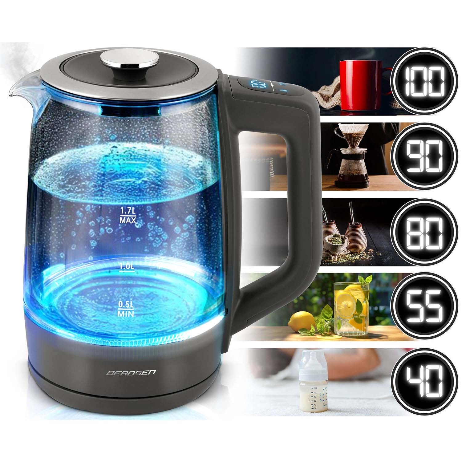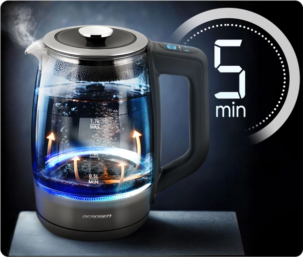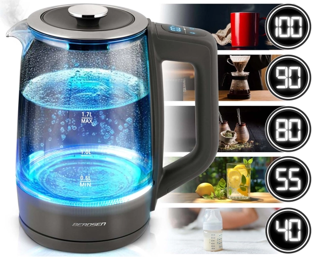 Oplev den elegante BERDSEN glaselkedel 1,7 l med smart temperaturmåling, touchbetjening og femtrins temperaturvalg 40/55/80/90/100 °C. Det robuste borosilikatglas, blåt LED-lys under kogning og Keep Warm-funktion i op til 2 timer gør den ideel til te, kaffe og drikke til børn. Sikker drift sikres af beskyttelse mod tørkogning og pålidelig elektronik Powered by Strix.