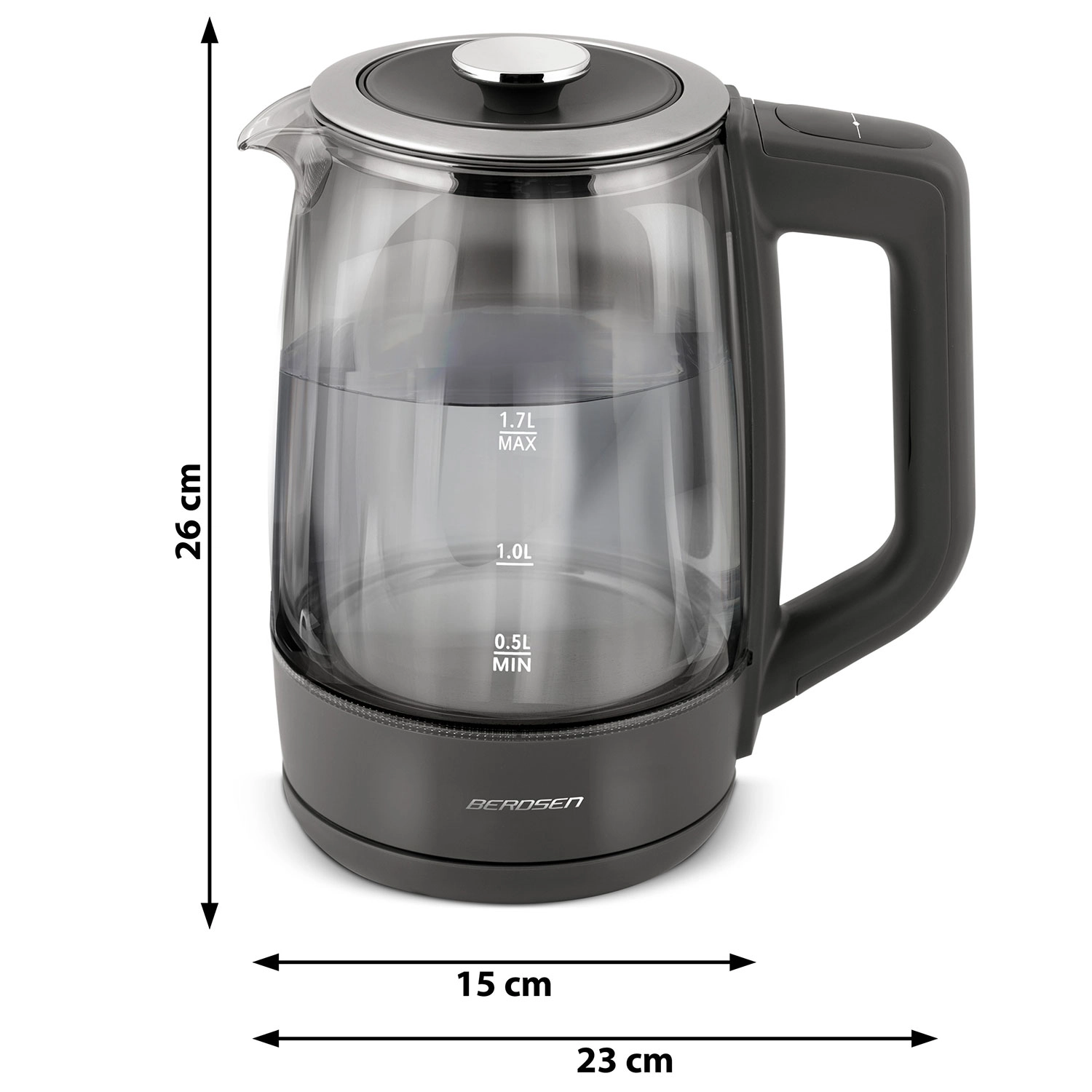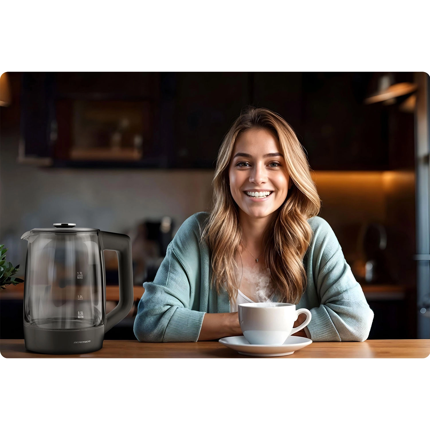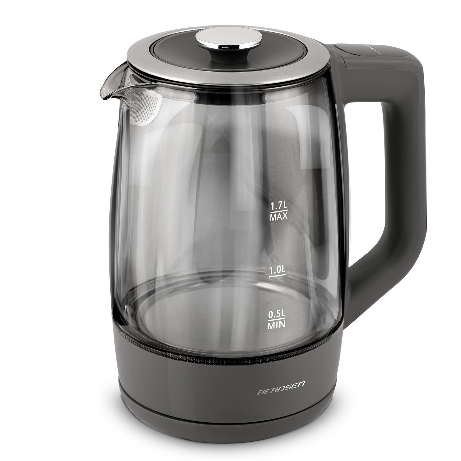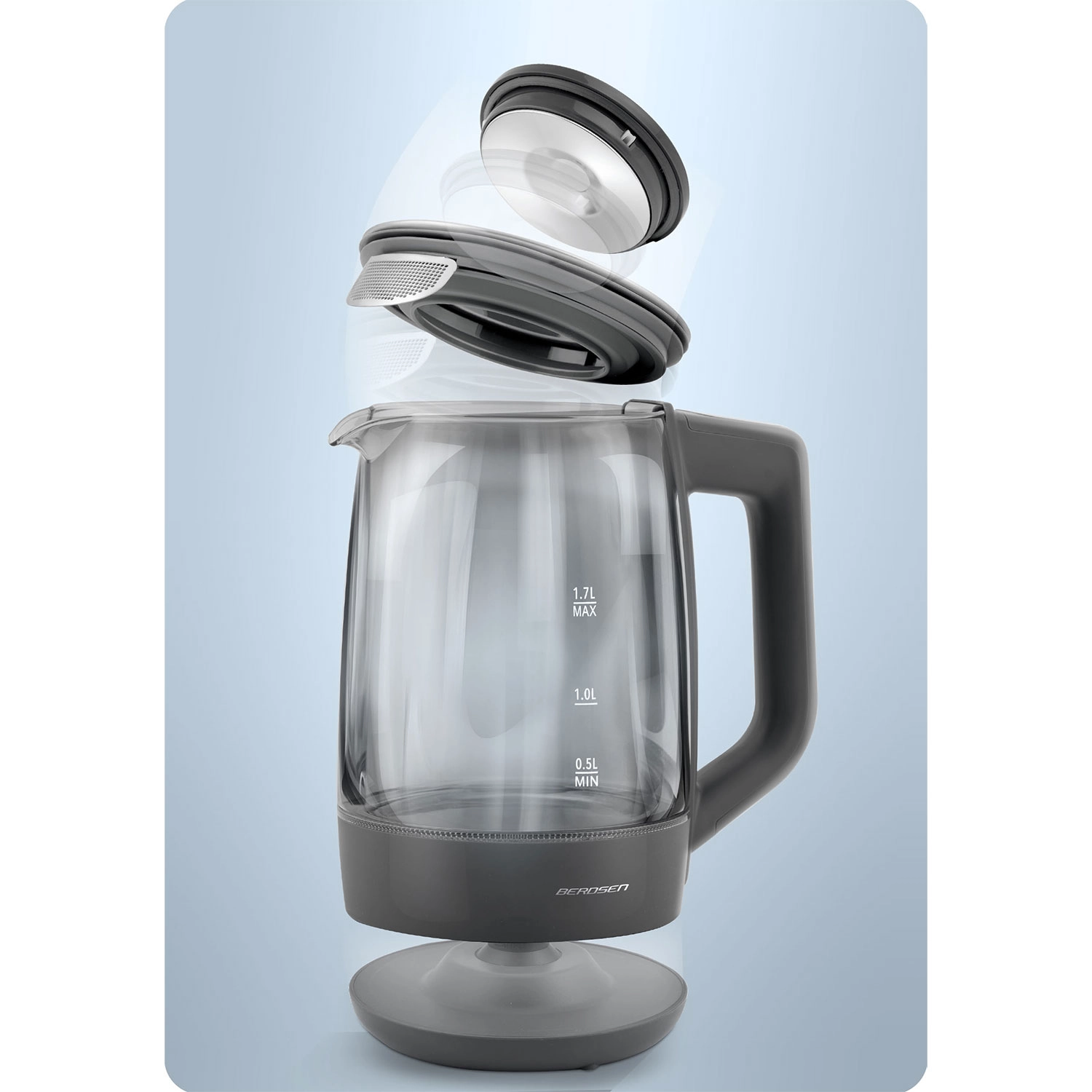 Oplev den elegante BERDSEN glaselkedel 1,7 l med smart temperaturmåling, touchbetjening og femtrins temperaturvalg 40/55/80/90/100 °C. Det robuste borosilikatglas, blåt LED-lys under kogning og Keep Warm-funktion i op til 2 timer gør den ideel til te, kaffe og drikke til børn. Sikker drift sikres af beskyttelse mod tørkogning og pålidelig elektronik Powered by Strix.