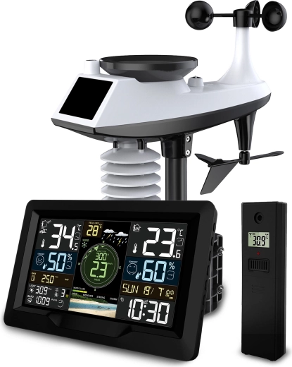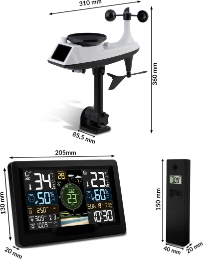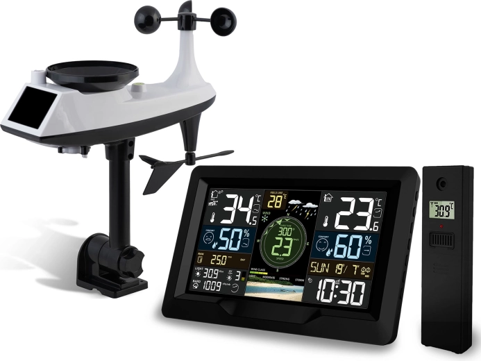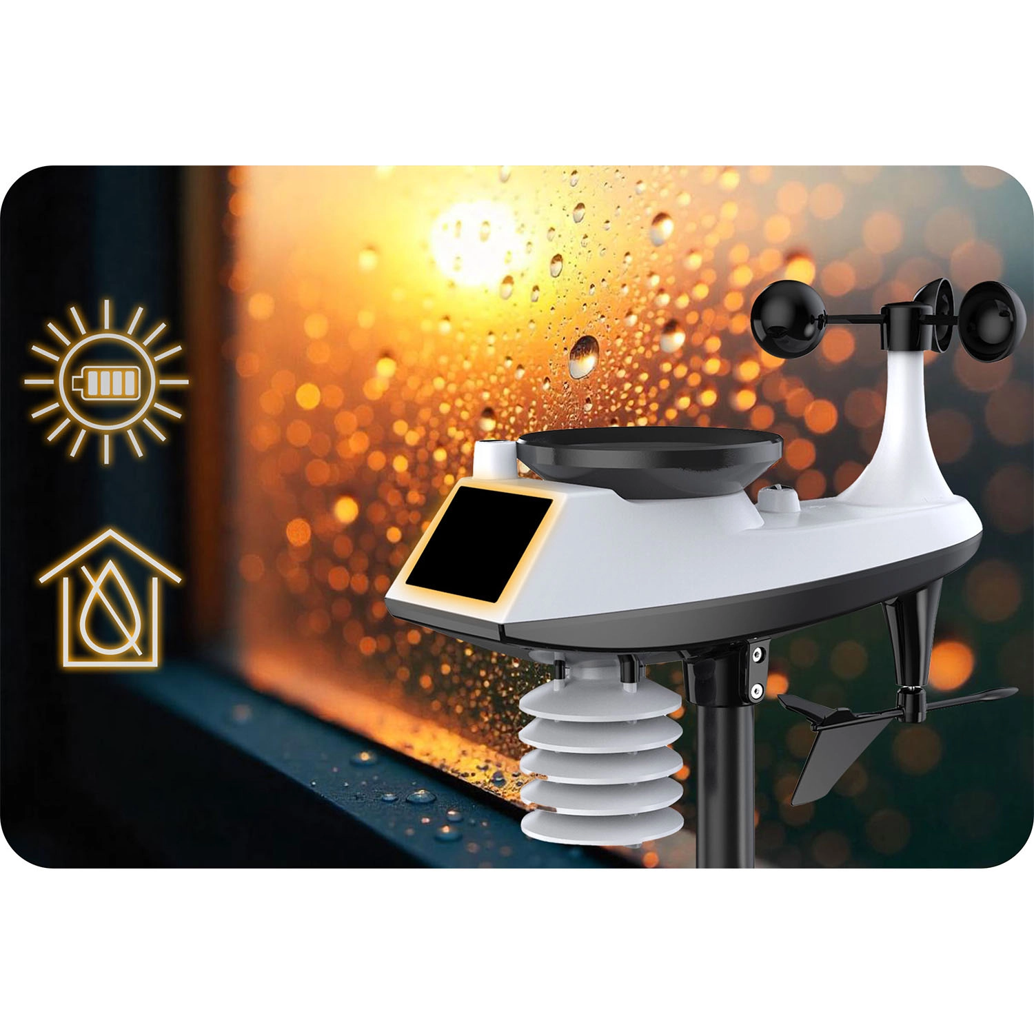 Denne moderne vejrstation er ideel til hjemmet, haven og værkstedet. Med flere sensorer får du et komplet overblik over forholdene – temperatur og luftfugtighed inde og ude, vindretning og hastighed, nedbørsmængde, tryk, UV‑indeks og lysintensitet. Farveskærmen tilbyder 4 lysstyrkeniveauer, understøtter flere sprog og viser også 12‑timers vejrudsigt, månens faser, dato og tid.