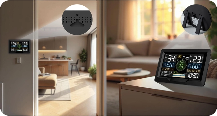 Via Wi‑Fi og Tuya Smart ser du data og statistik når som helst på telefonen. Stationen synkroniserer automatisk tiden via DCF77 og giver mulighed for at tilslutte ekstra sensorer. To programmerbare alarmer, snooze‑funktion og evighedskalender til år 2099 gør enheden til en praktisk hjælper i hverdagen.