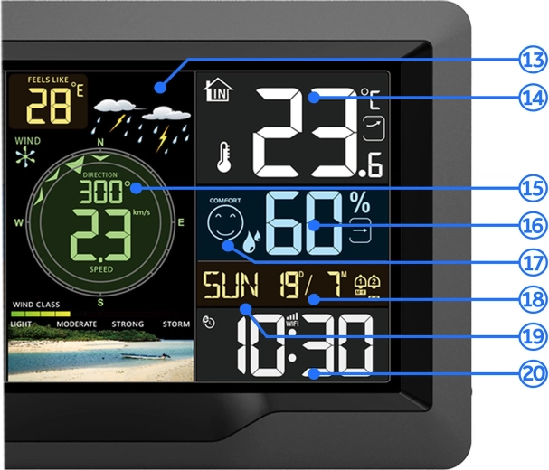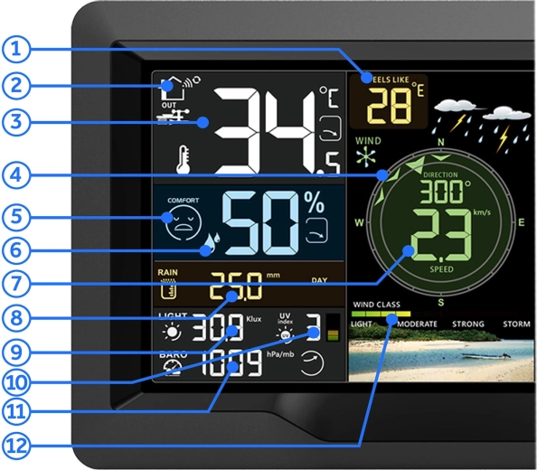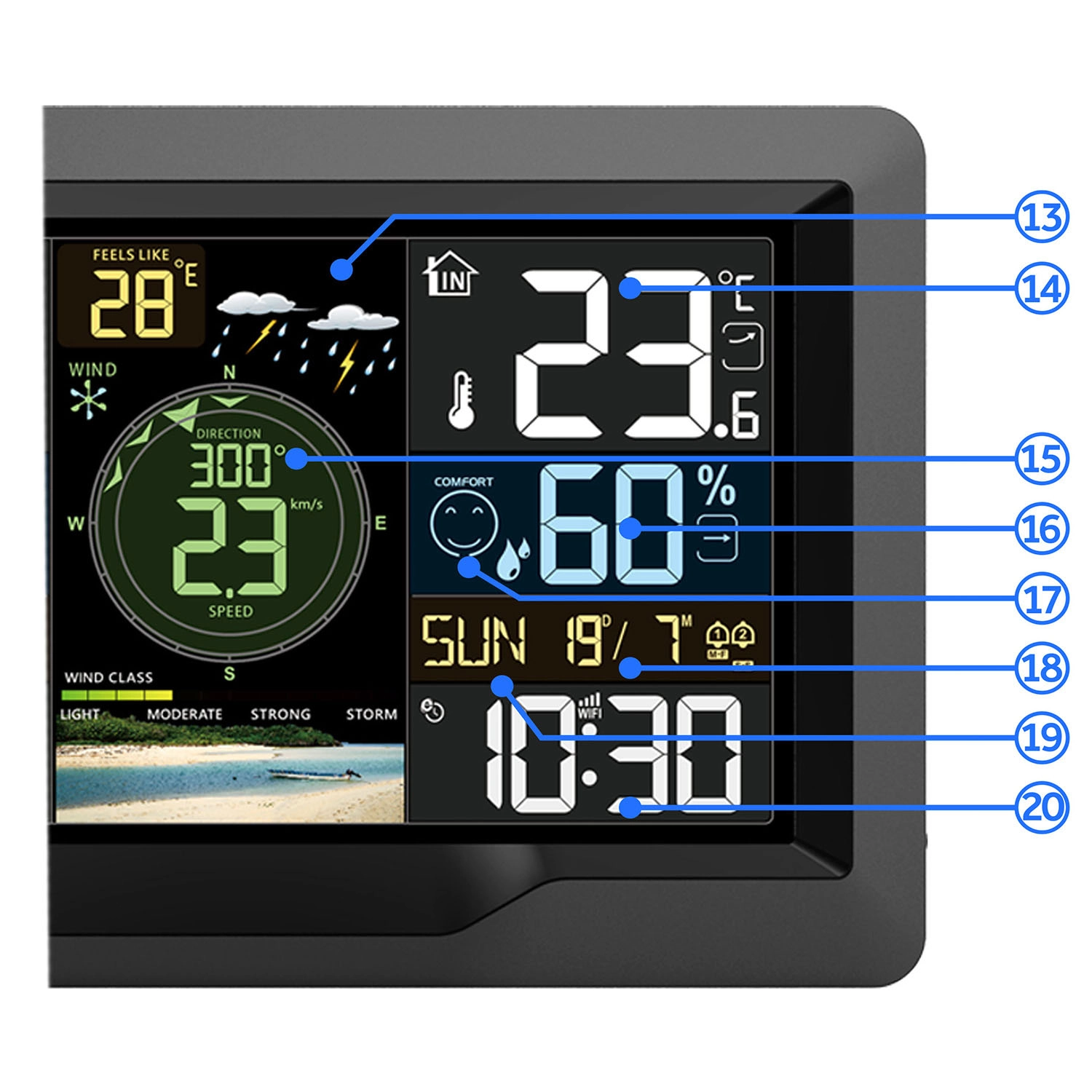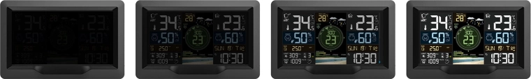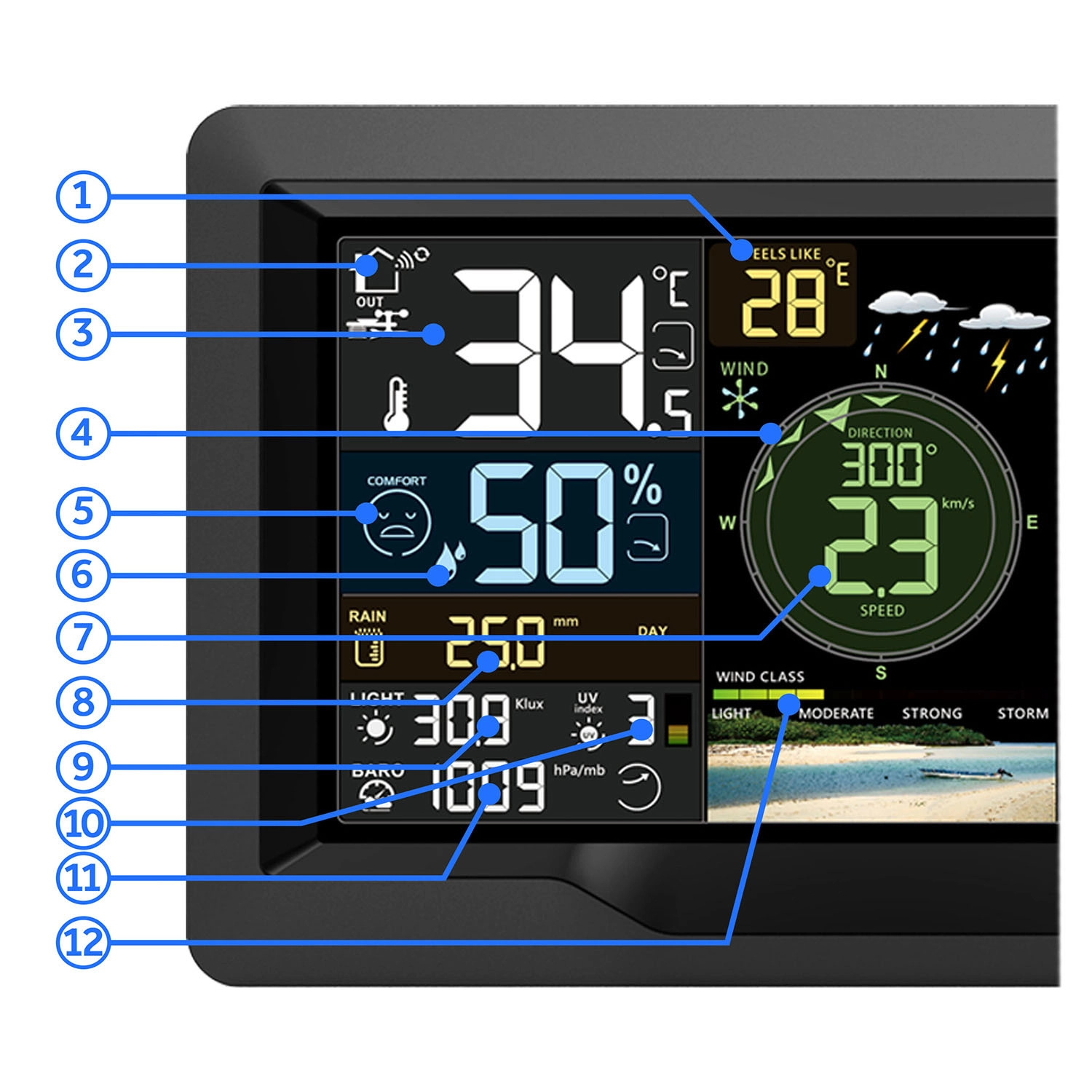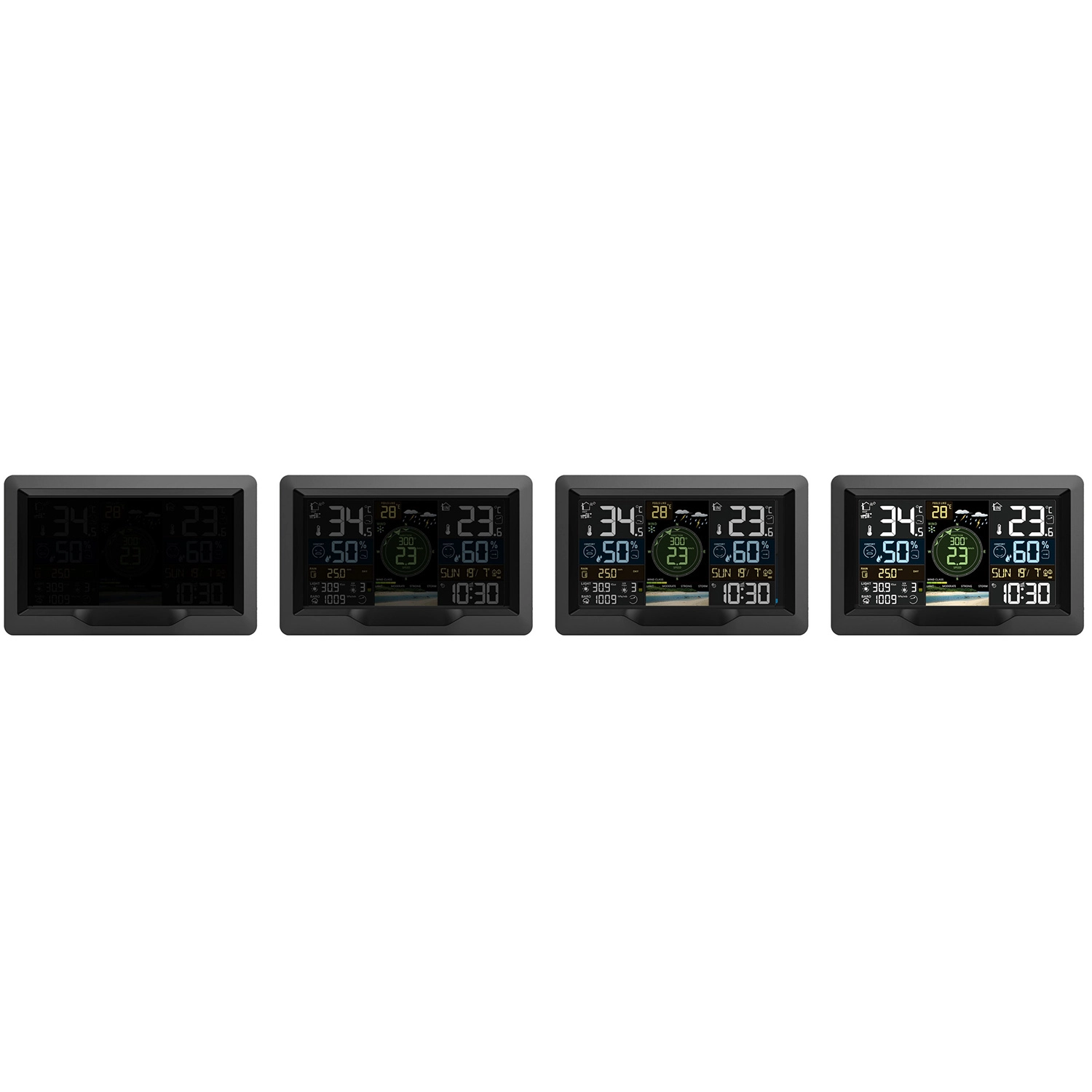 Den store flerfarvede skærm viser temperatur, luftfugtighed, vind, tryk, tid og vejrudsigt via tydelige ikoner. Letlæselige data dag og nat takket være dæmper.