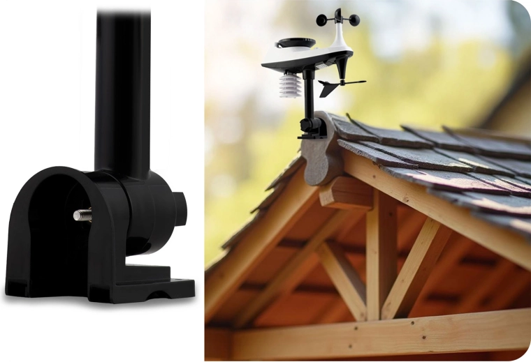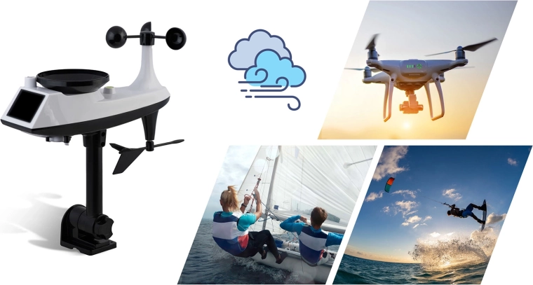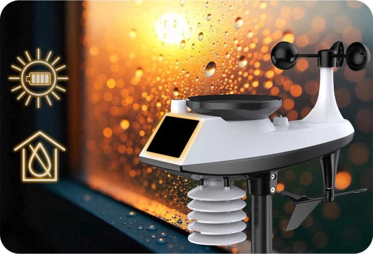Den udendørs sensor med anemometer, vindfane og regnmåler leverer præcise data om vindhastighed og vindretning samt nedbørsmængde – ideel til planlægning af udendørsaktiviteter.