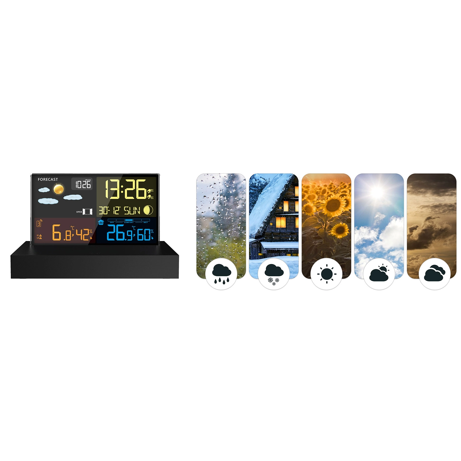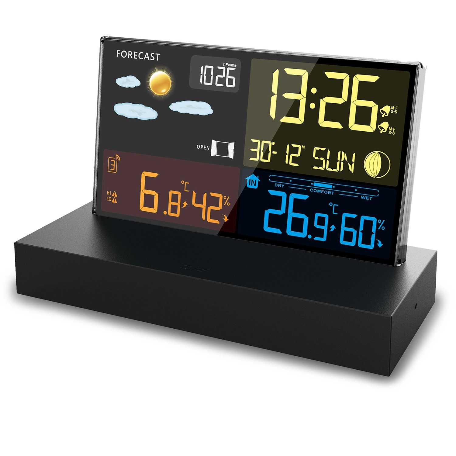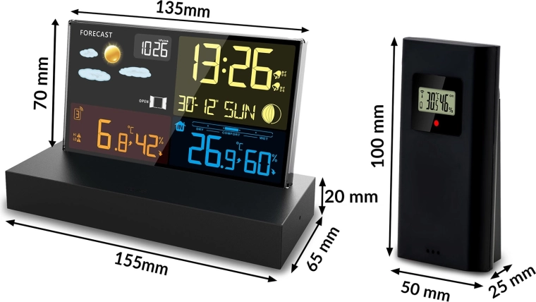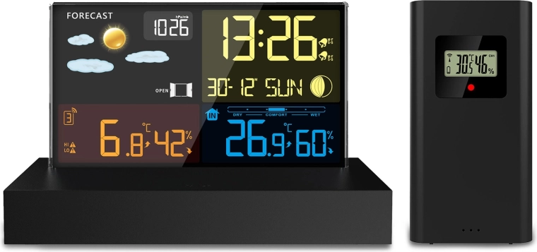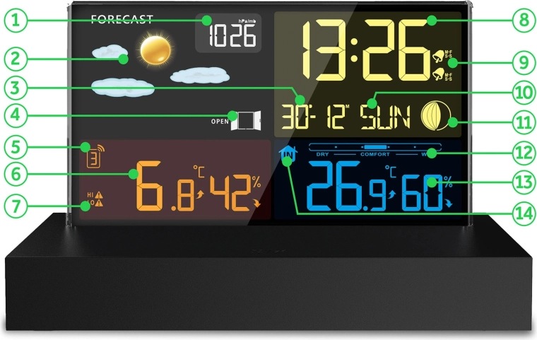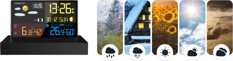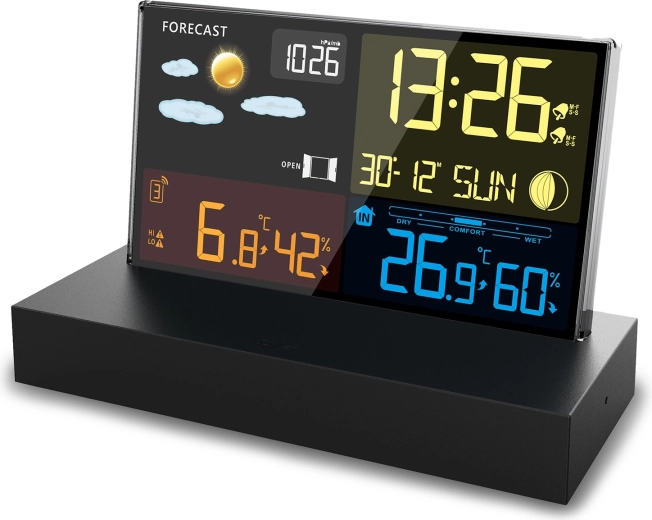 - Overskuelig farve-LCD med vejrikoner, Månens faser og batteristatus