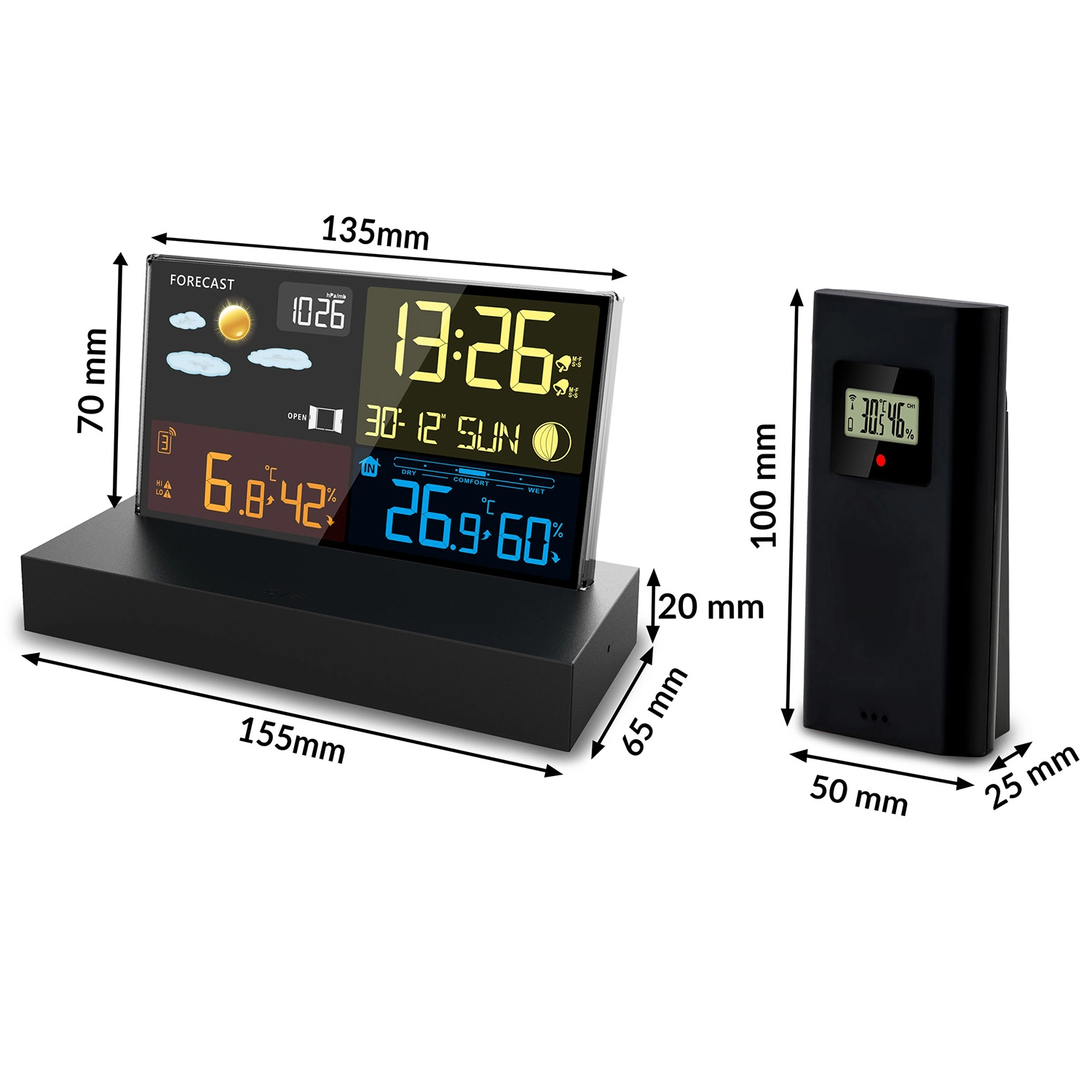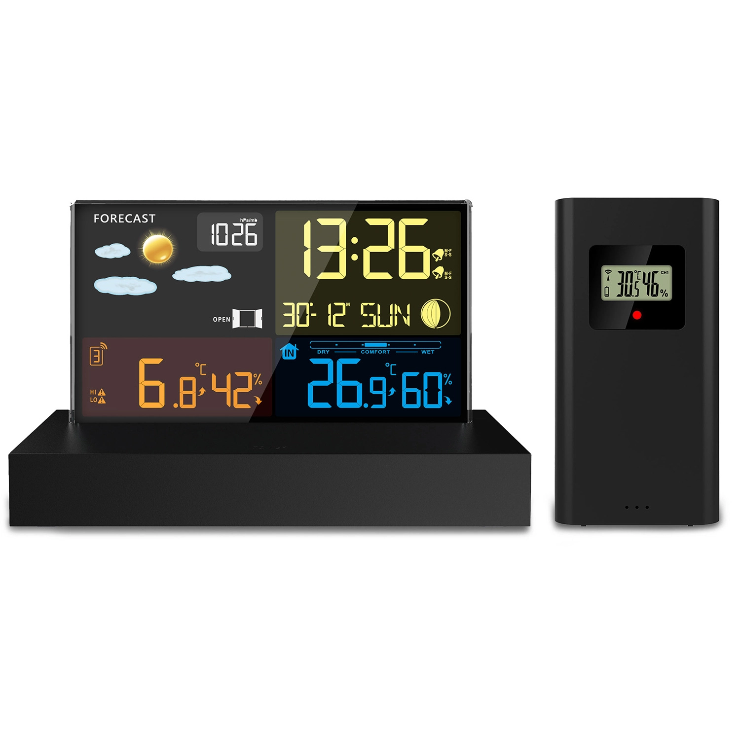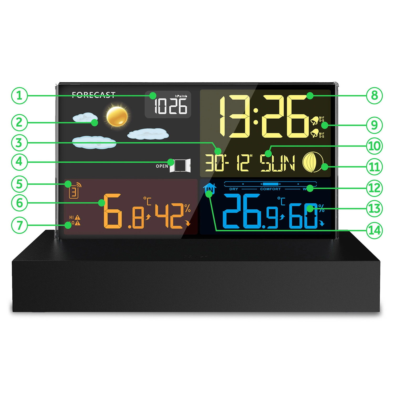- Overskuelig farve-LCD med vejrikoner, Månens faser og batteristatus