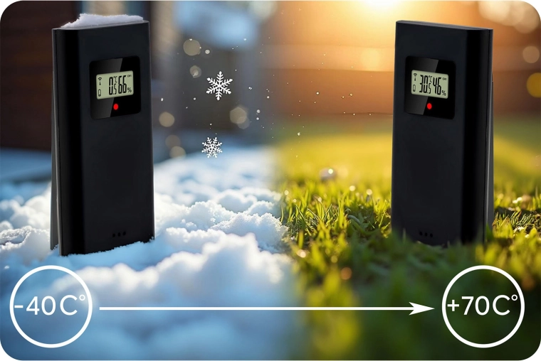 Udendørssensoren på 433,92 MHz kommunikerer automatisk med stationen, understøtter op til 3 kanaler og overfører pålideligt udendørstemperatur og -fugtighed.
