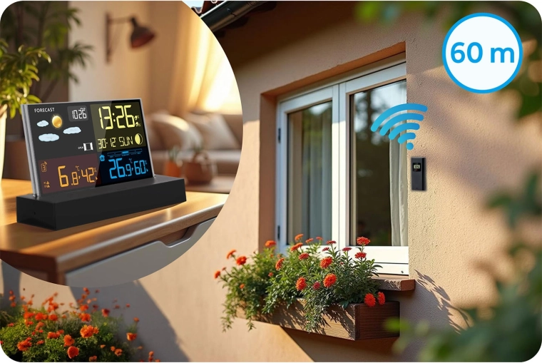 Med den trådløse sensor (op til 60 m, 433,92 MHz) får du aktuelle udendørsværdier. Enheden gemmer min./max.-værdier, advarer om frost og varme og viser en komfortindikator for et sundt indeklima. Understøtter op til 3 kanaler til flere zoner i hjemmet.