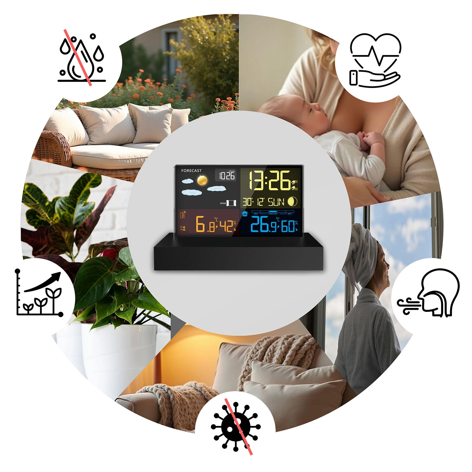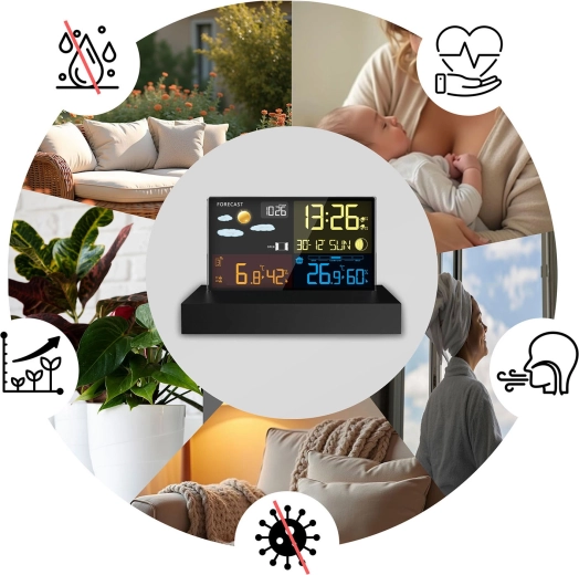 Radiostyret DCF-tid, alarm med snooze-funktion og komfortindikator hjælper med at styre din daglige rutine og et sundt indeklima.