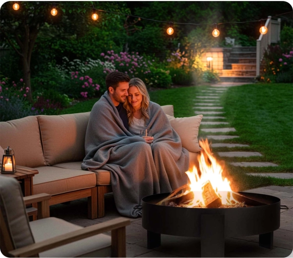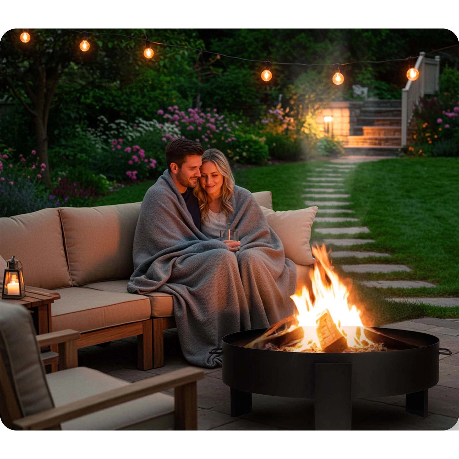2 mm tykvægget stål med pulverlakering modstår korrosion, ridser og UV-stråling. Bålstedet tåler høje temperaturer op til 600 °C og er klar til udendørs brug året rundt.