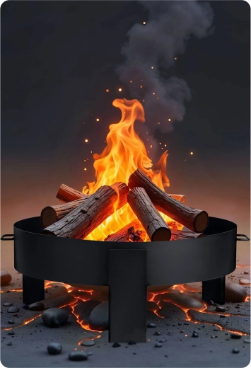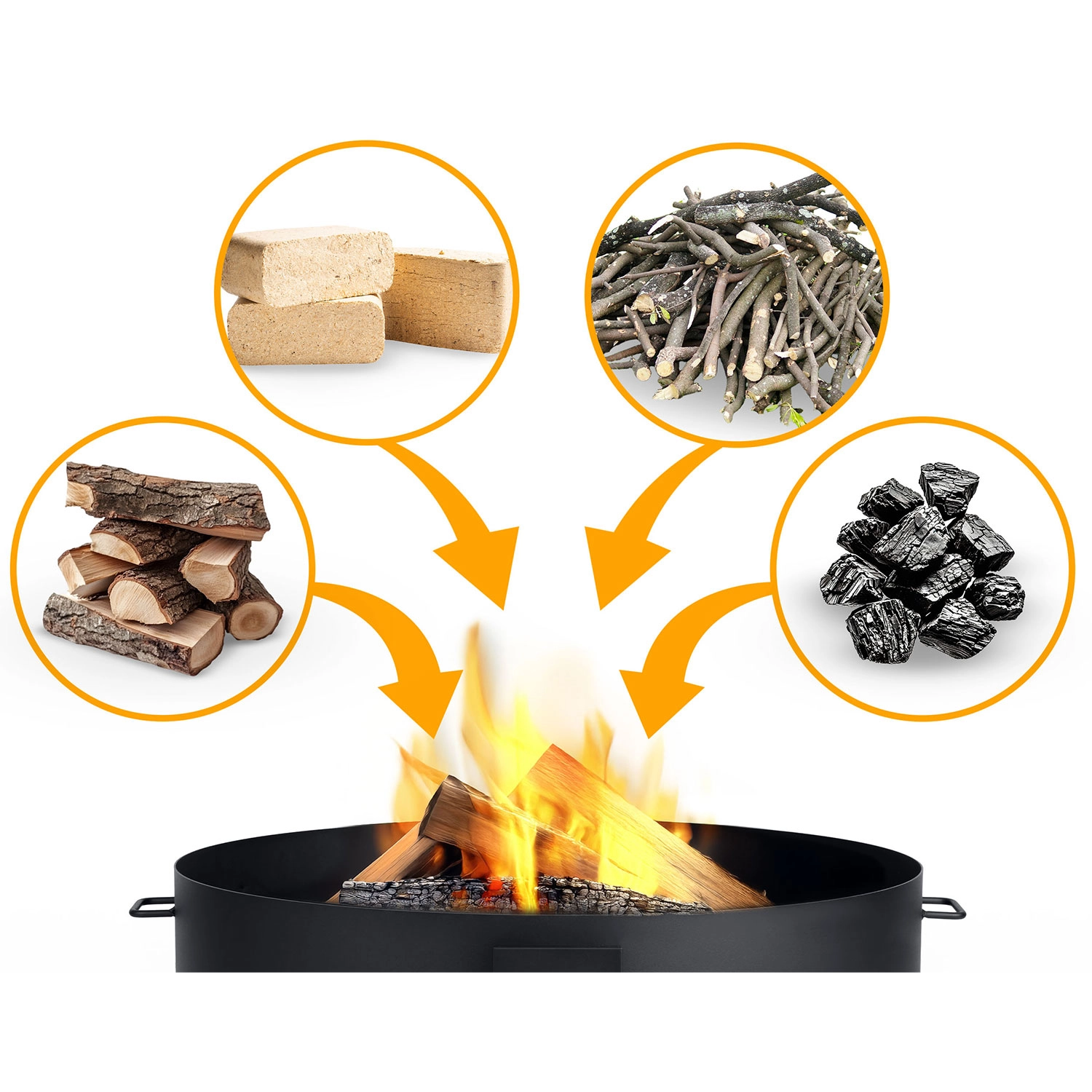 Brug brænde, træbriketter, grene eller trækul. Sidehåndtagene gør det nemt at flytte, og i pakken finder du desuden en praktisk ildrager for sikker betjening.