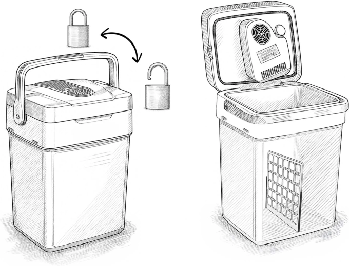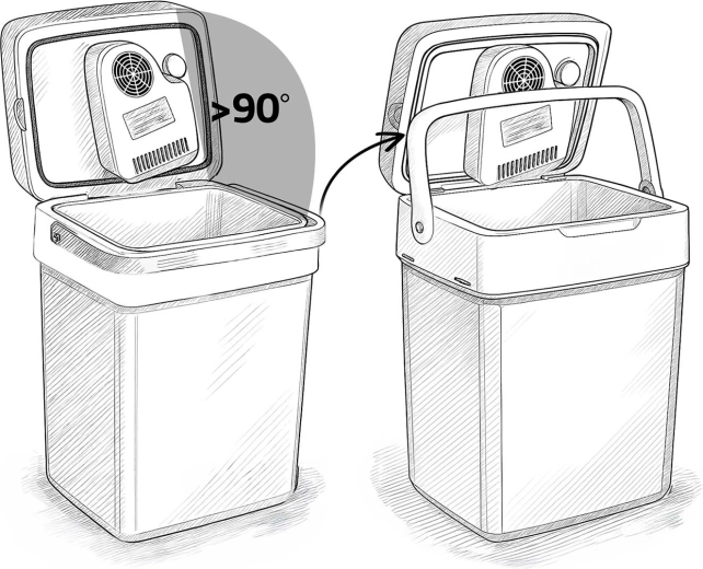 Sammenklappeligt håndtag med lås i låget for sikker transport, støttefunktion ved påfyldning og aftagelig rist for overskuelig opbevaring af mad og drikke.
