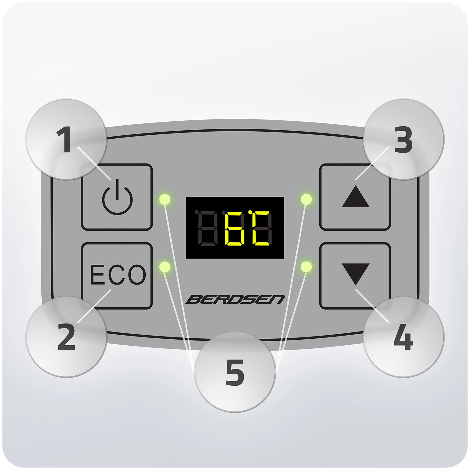 - Elektronisk panel, temperaturindstilling, ON/OFF-knap, indikatorer