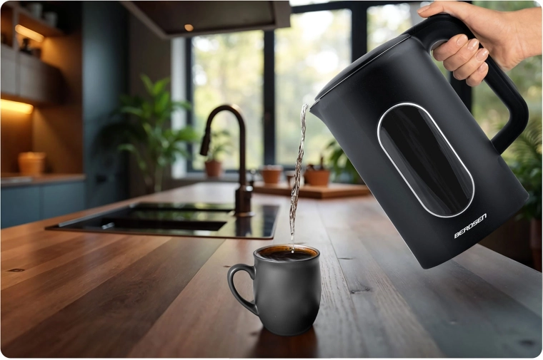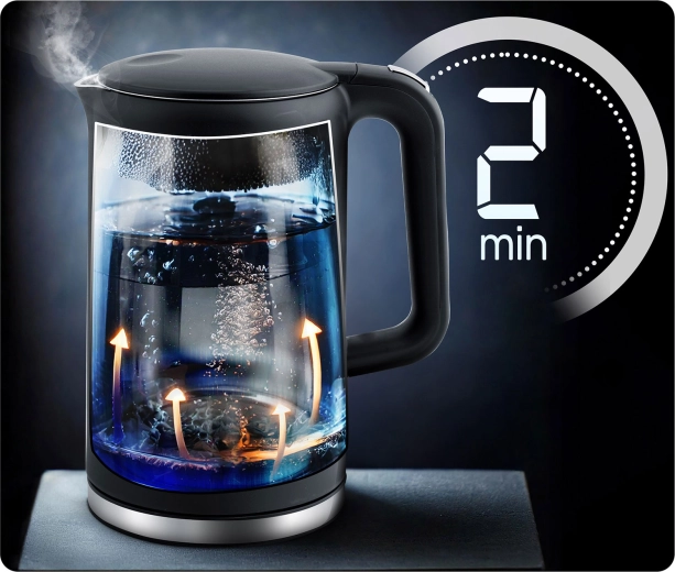 Koger vand på 2–5 minutter. Støjsvag drift, automatisk slukning ved kogepunkt og beskyttelse mod tørkogning for sikker brug.