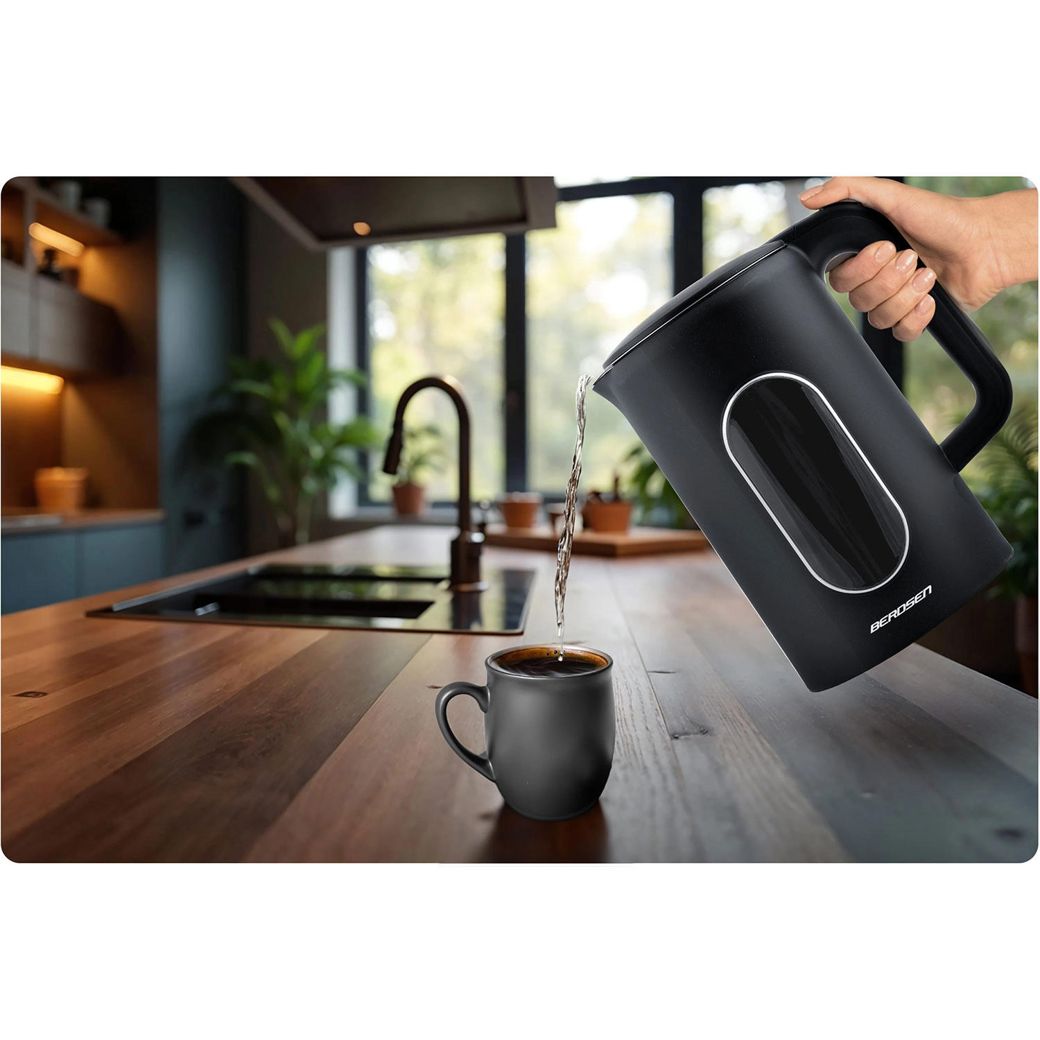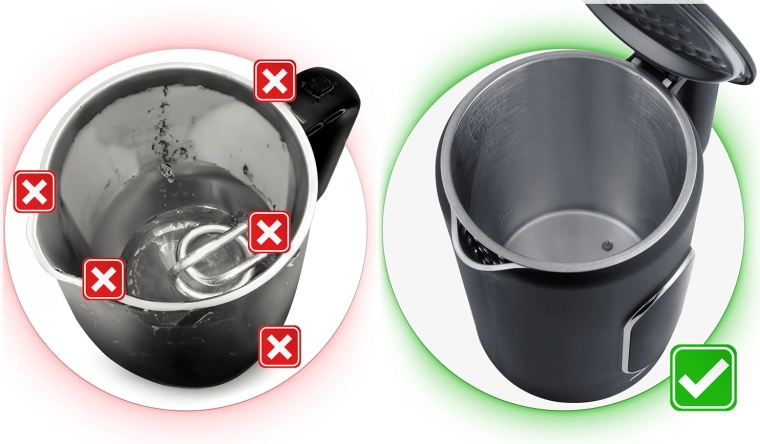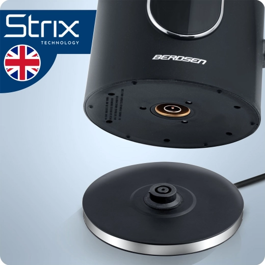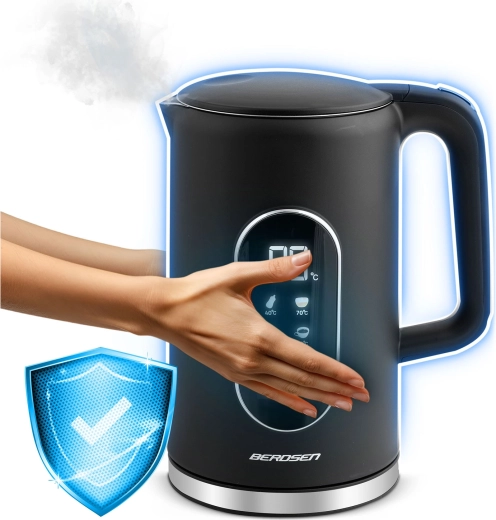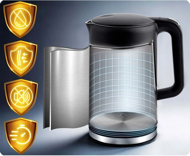 Sikker og holdbar konstruktion: dobbeltlags CoolTouch-krop kombinerer rustfrit stål og kvalitetsplast for bedre isolering, kølig overflade og lavere varmetab. Indvendigt i rustfrit stål SUS 304 er hygiejnisk, let at rengøre og påvirker ikke vandets smag. Kedlen er hurtig og stille (op til 2200 W), med beskyttelse mod tørkogning og automatisk slukning ved kogning.
