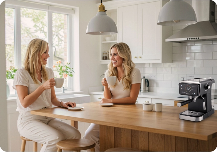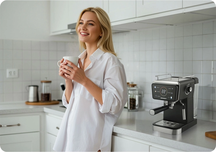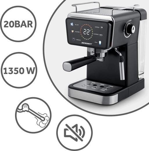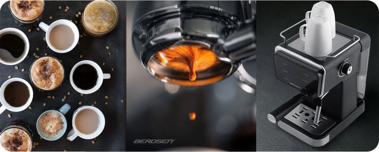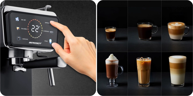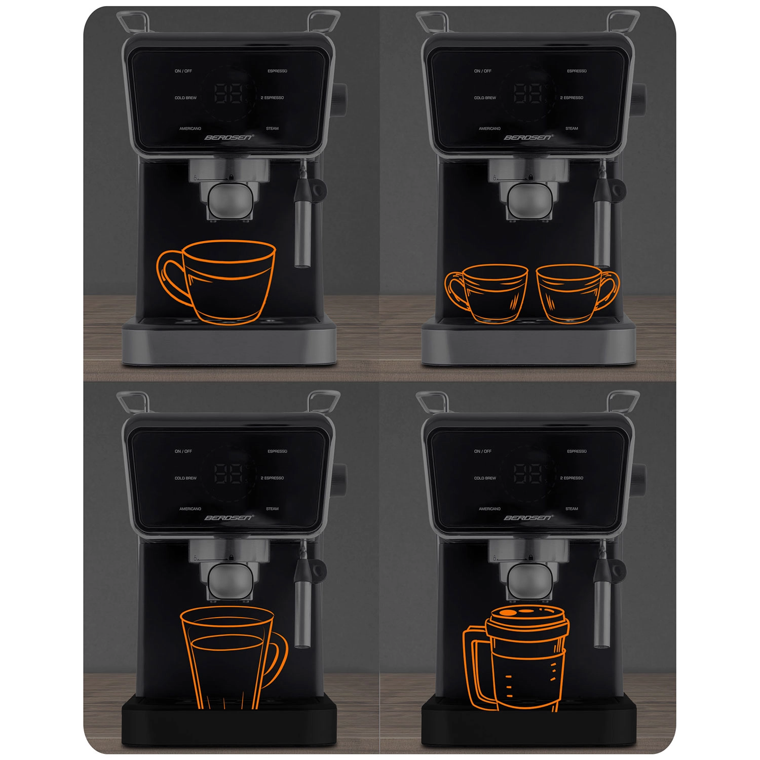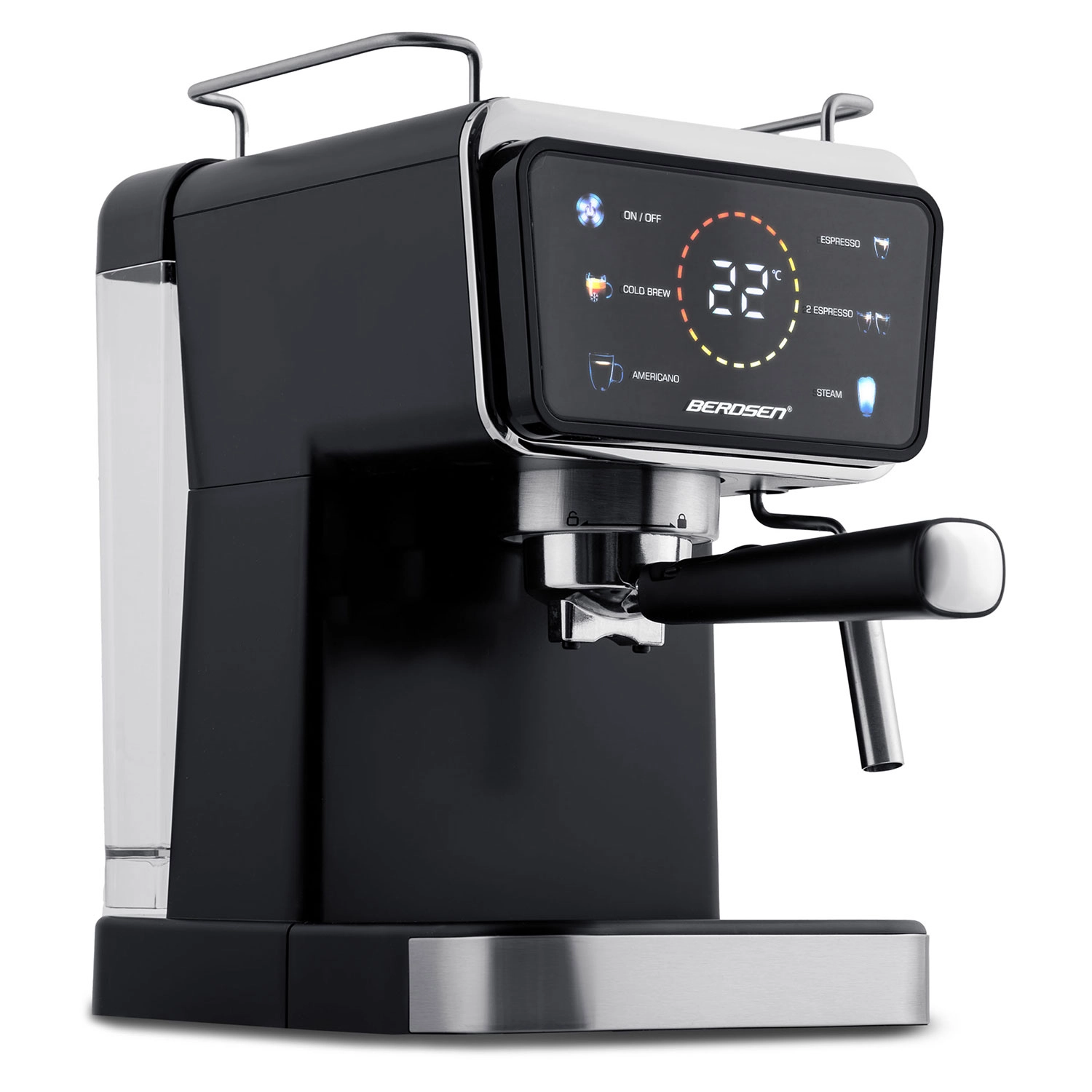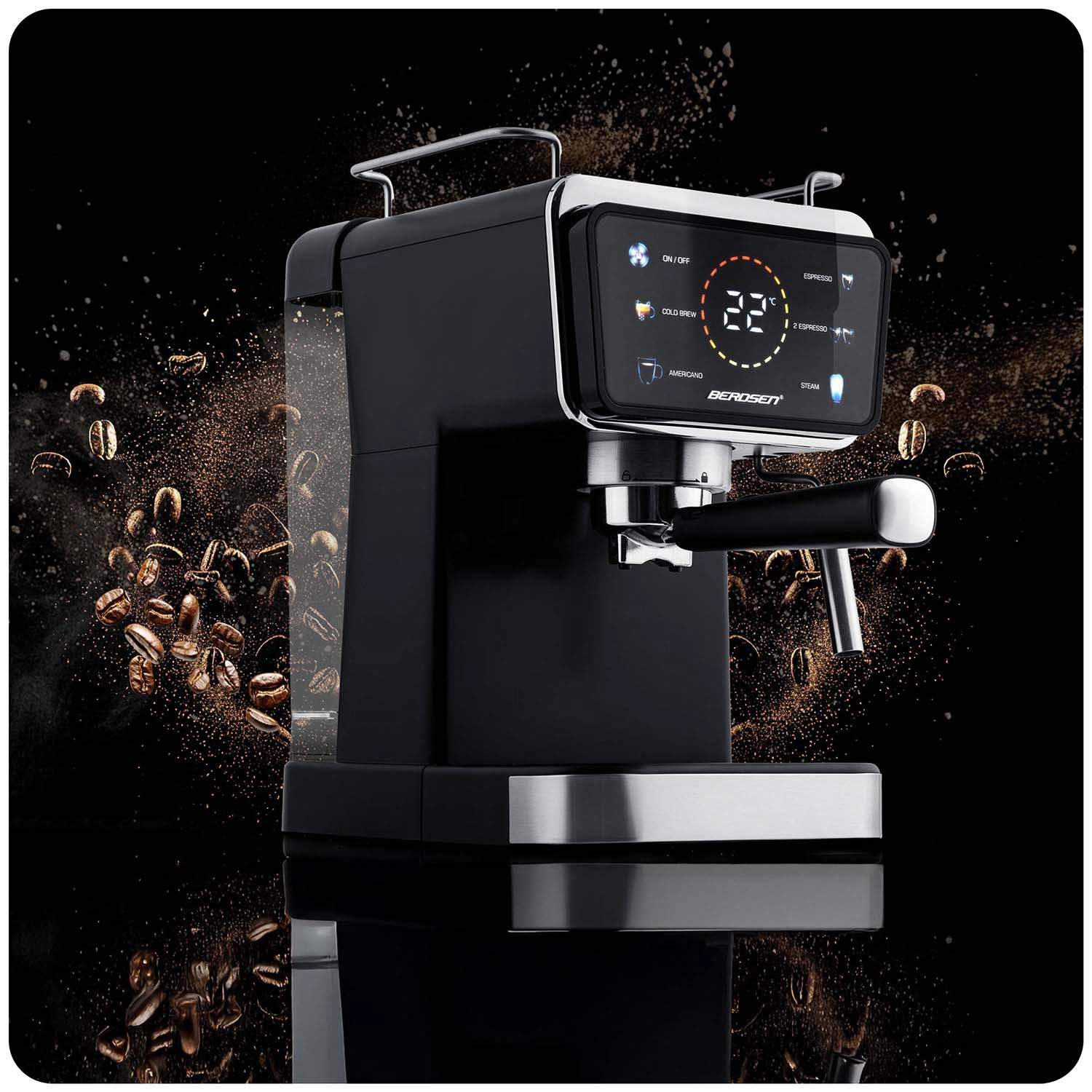 Forvandl køkkenet til din egen hjemmecafé. Berdsen espressomaskinen kombinerer en kraftig 20 bar pumpe og et præcist ekstraktionssystem for intens aroma, fyldig smag og perfekt crema. Touchpanelet giver hurtig valg af espresso, damp og kold espresso, mens den professionelle damparm skaber tæt, silkeblødt skum til cappuccino, latte eller flat white.
