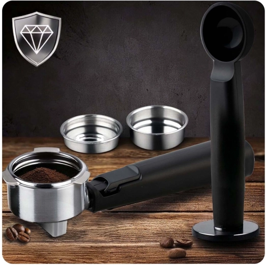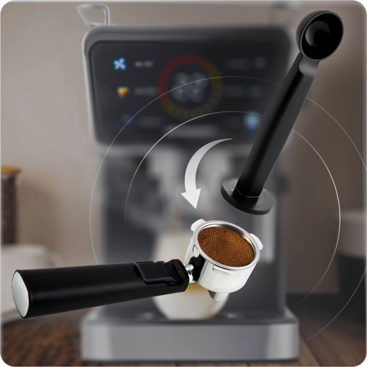 Praktisk udstyr omfatter to rustfri filtre (single og double), portafilter med dobbelt udløb samt en 2-i-1 måleske med tamper for præcis dosering og jævn tampning. En aftagelig drypbakke gør plads til højere glas og termokrus, mens den 1,5 l vandbeholder er let at fylde og rengøre. Støjsvag drift, solid kvalitet og sikre skridsikre fødder øger den daglige komfort.