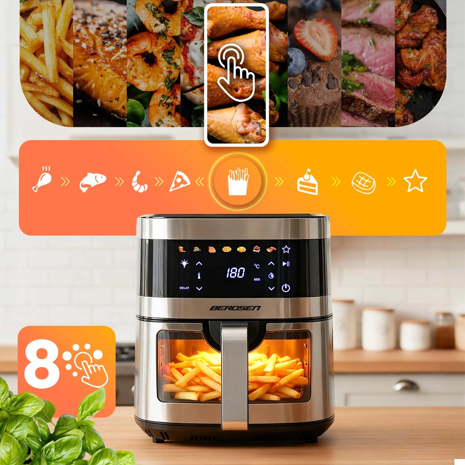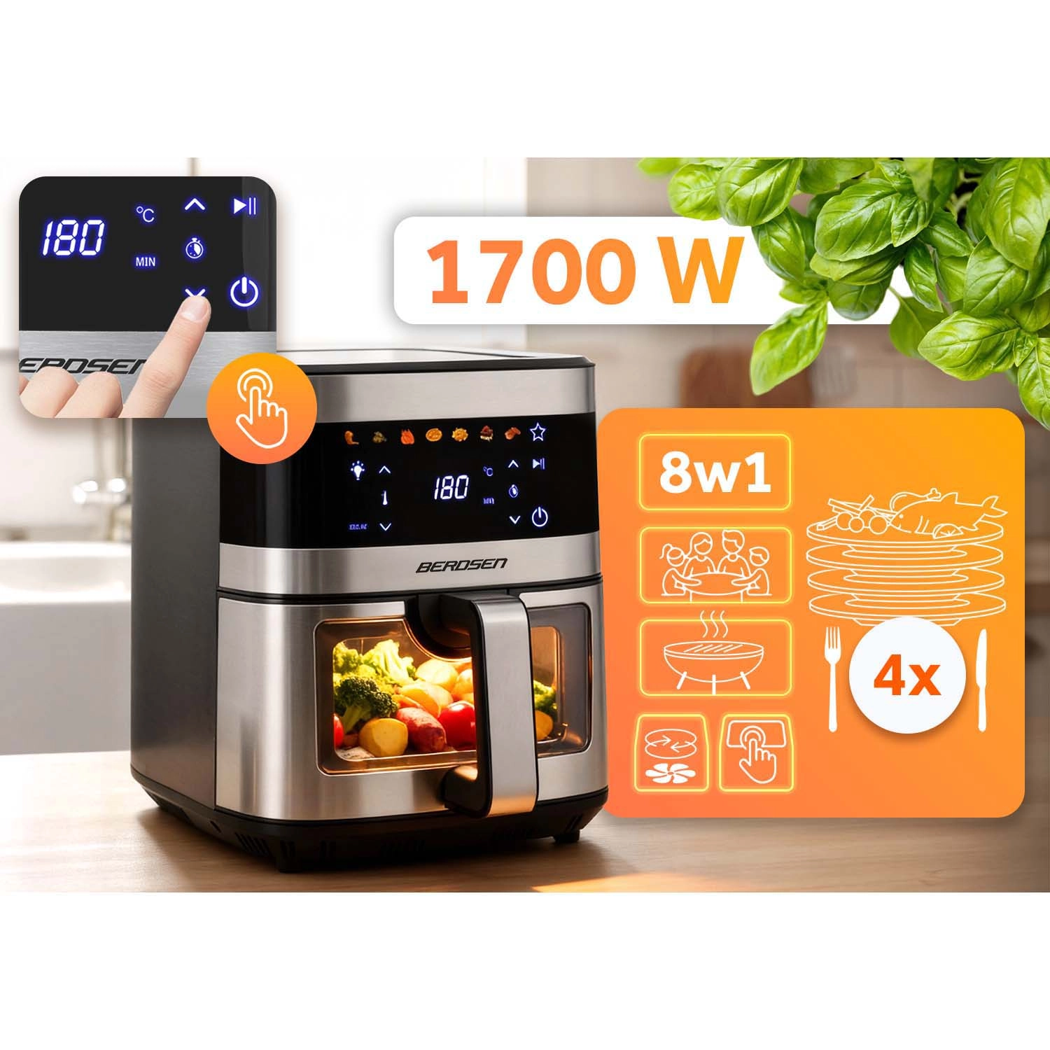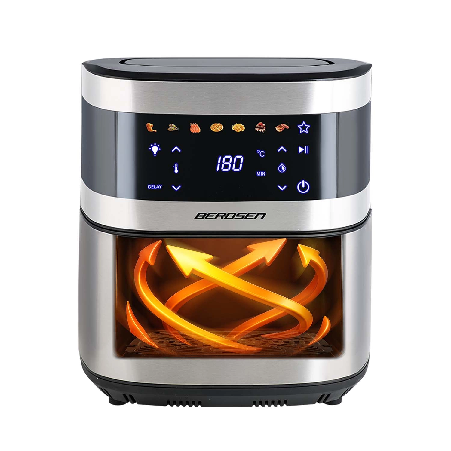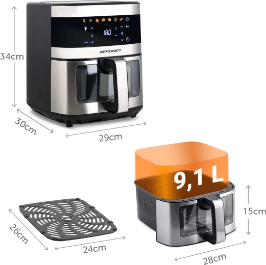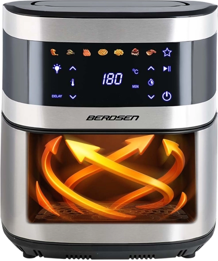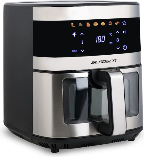 BERDSEN BD-656 kombinerer høj effekt på 1700 W og ekstra stor skål på 9,1 l for hurtig og jævn bagning, fritering og grillning med et minimum af olie. Den intuitive touchskærm tilbyder 7 forudindstillede programmer og præcis regulering på 40–200 °C. Takket være vinduet med LED-lys har du styr på madlavningen uden afbrydelser.