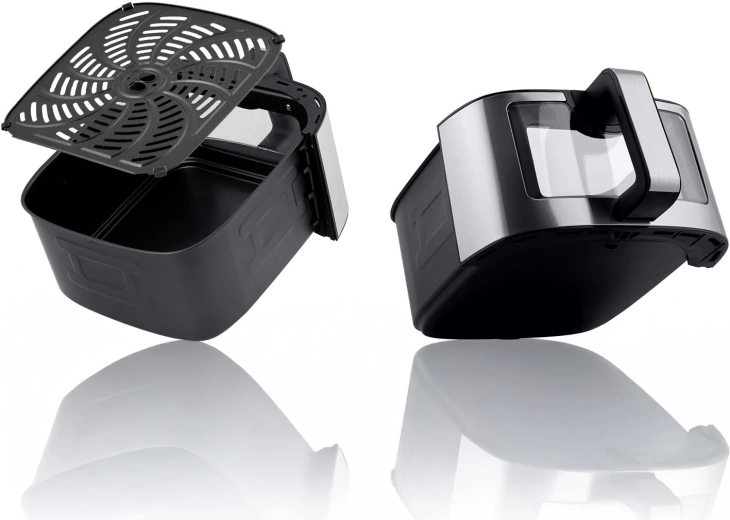 Alsidig anvendelse: lav sprøde pommes frites, saftig kylling, grøntsager, pizza, desserter og tørret frugt. Med funktion til udsat start og påmindelse om at vende. Kurv og bakke har nonstick-overflade i PTFE og kan gå i opvaskemaskinen, det kølige håndtag og overophedningsbeskyttelsen øger sikkerheden.
